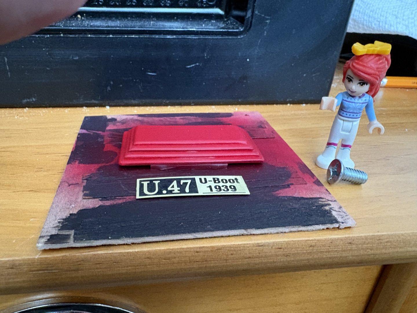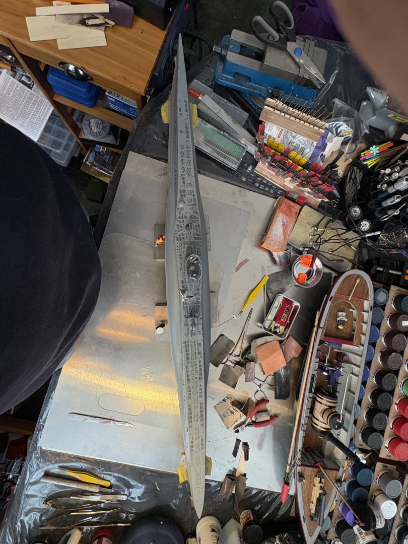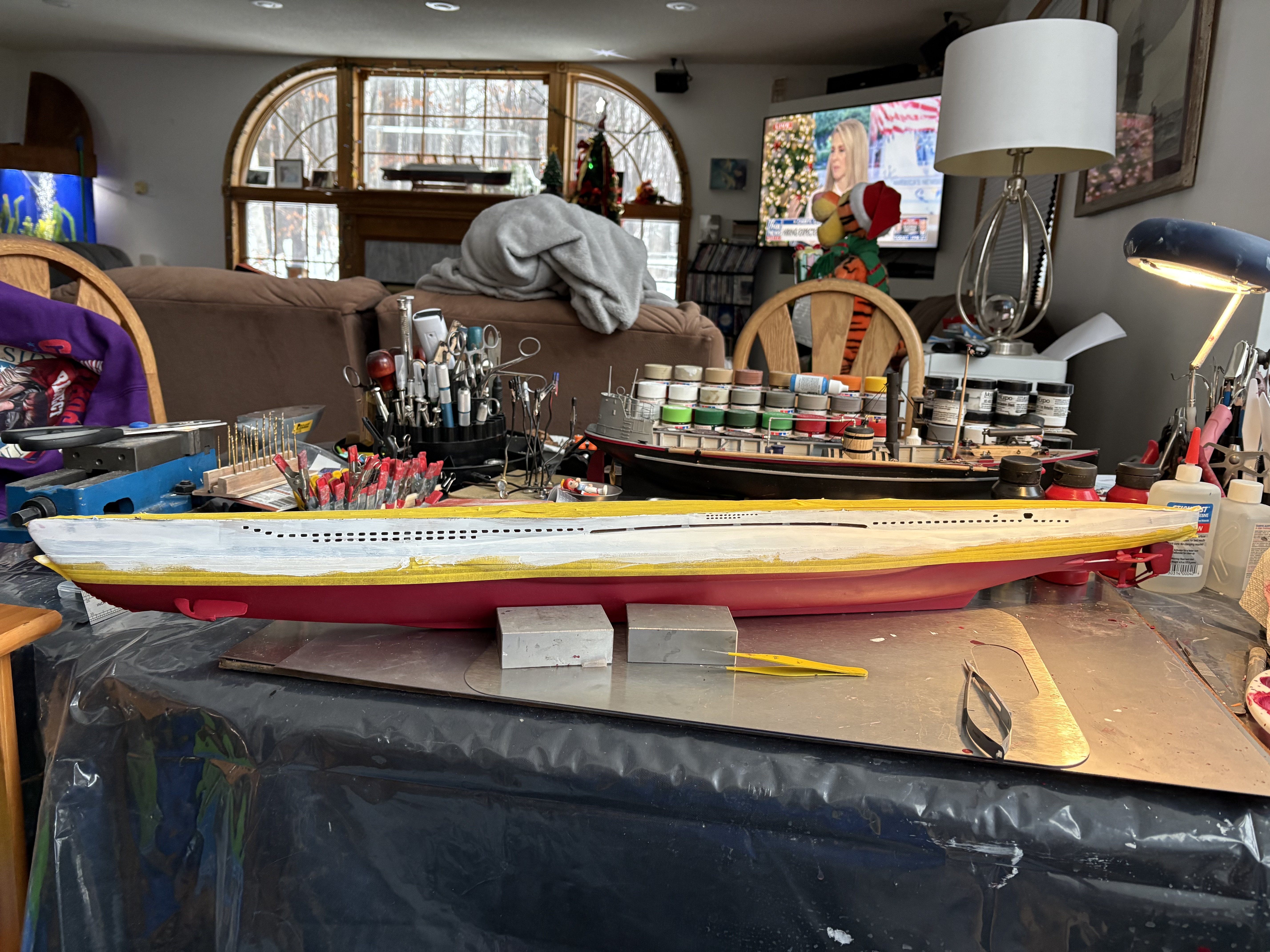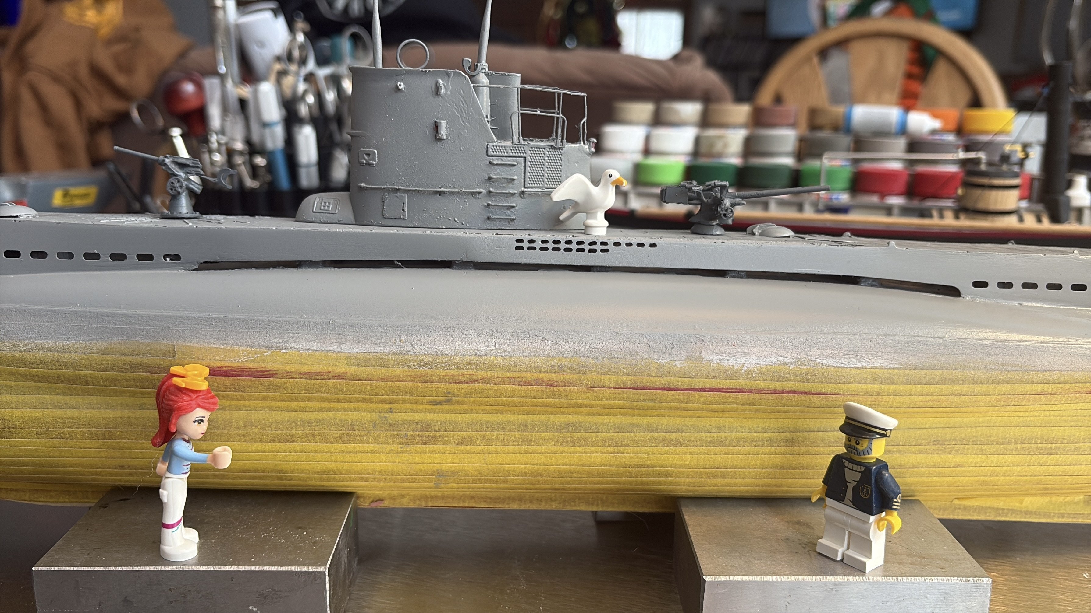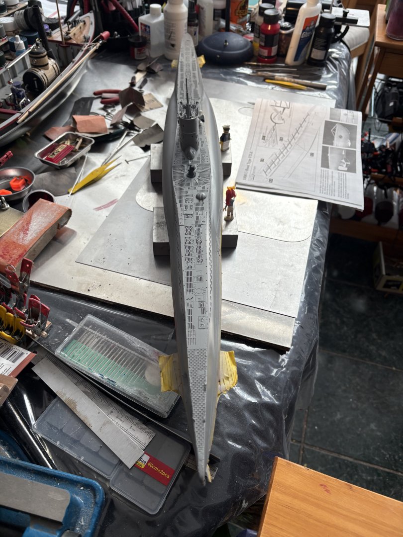 From the sub shipyard. U-47 in dry dock on 1-2-3 blocks (A very useful hobby tool) in primer before fine sanding and marking the waterline. Updated report from the Admiral