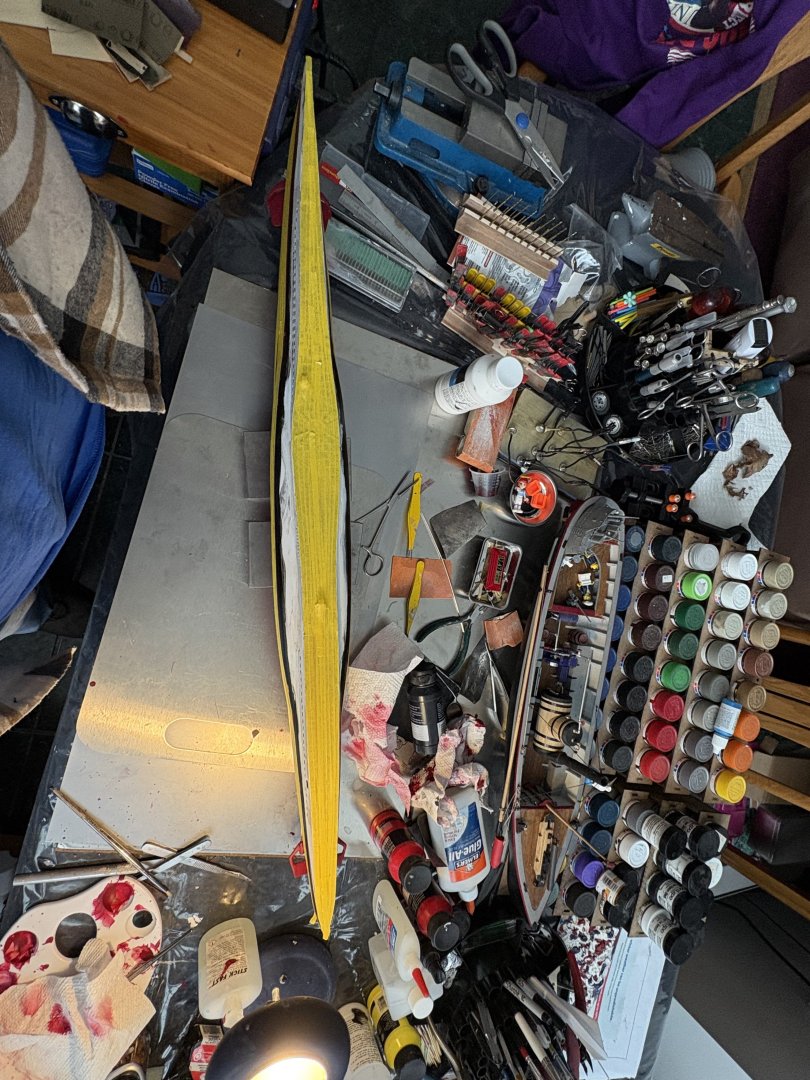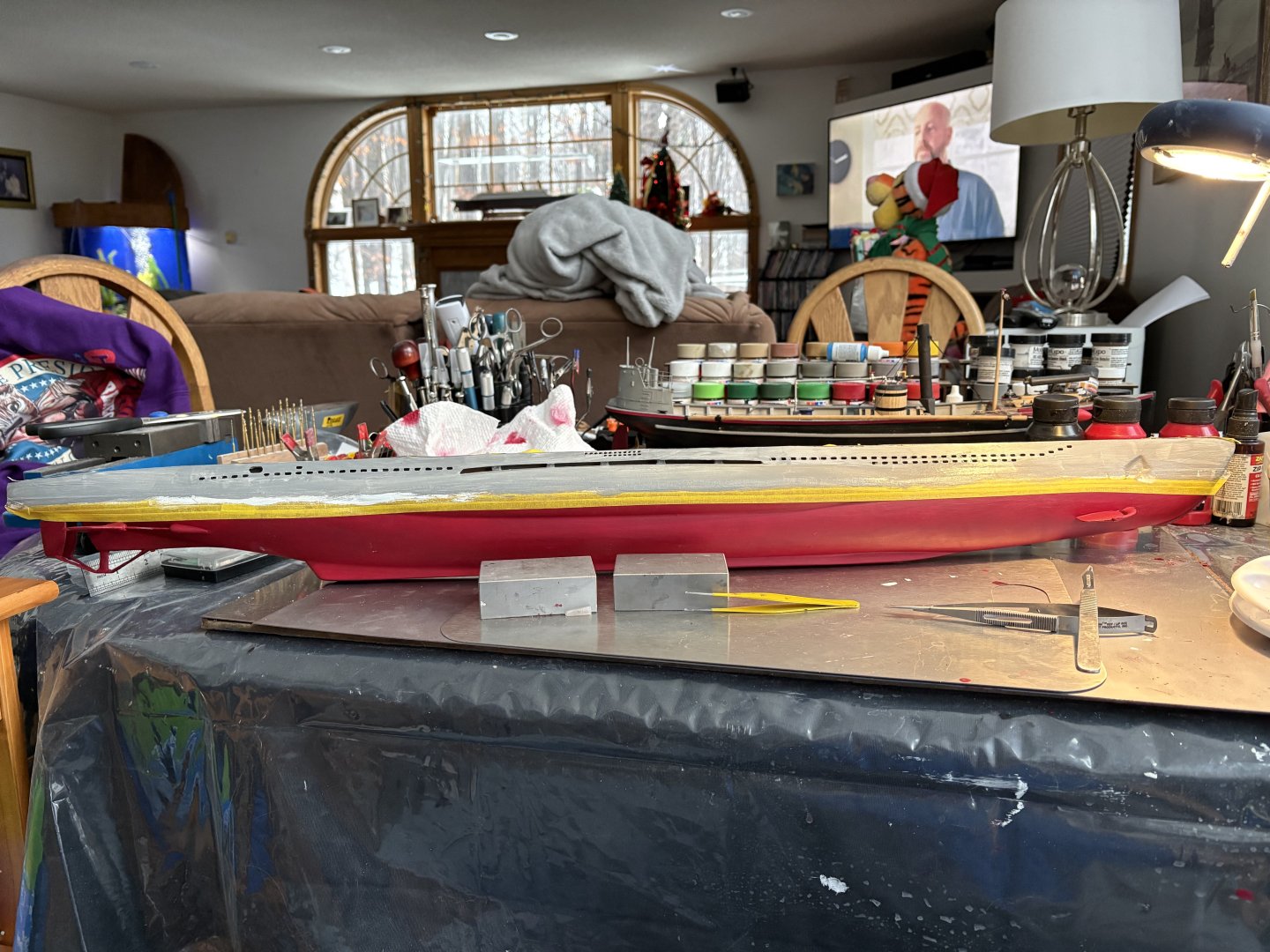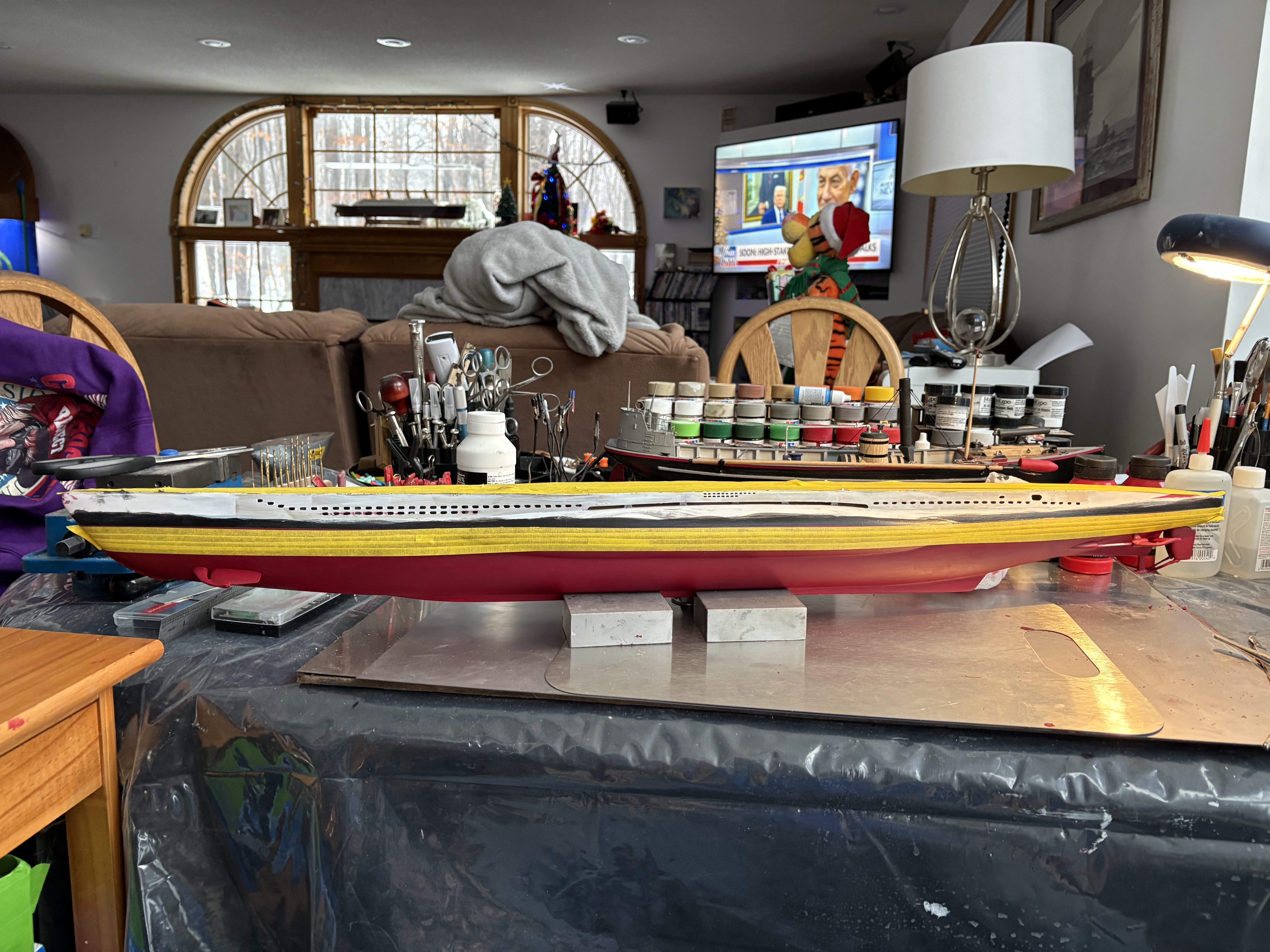 Sun is just coming up with light snow in the sub shipyard. Crew is working on the waterline. 1/16” 3M Vinyl masking tape has been applied over the black painted yesterday. The tape was then painted over with the same black to seal it and set aside to dry. When dry the crew will paint the hull bottom dark red. A brass cutwater was added to the bow and blended with the hull with red spot putty. Morning update from the Admiral