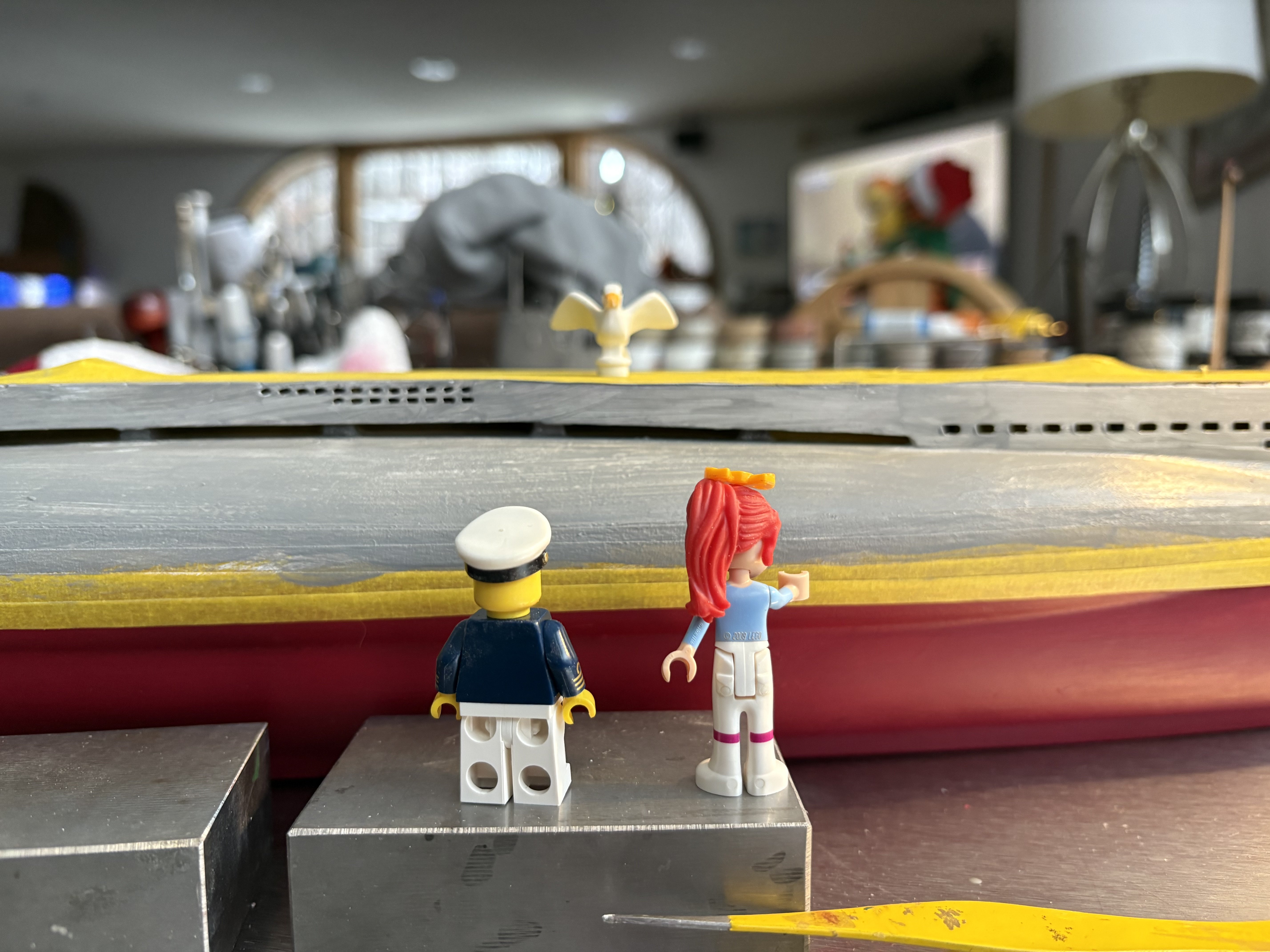 Well the crew finally got some color to the hull above the waterline after masking the area. We all pray the sea gull stays out of the paint. Update 11:00 The Admiral