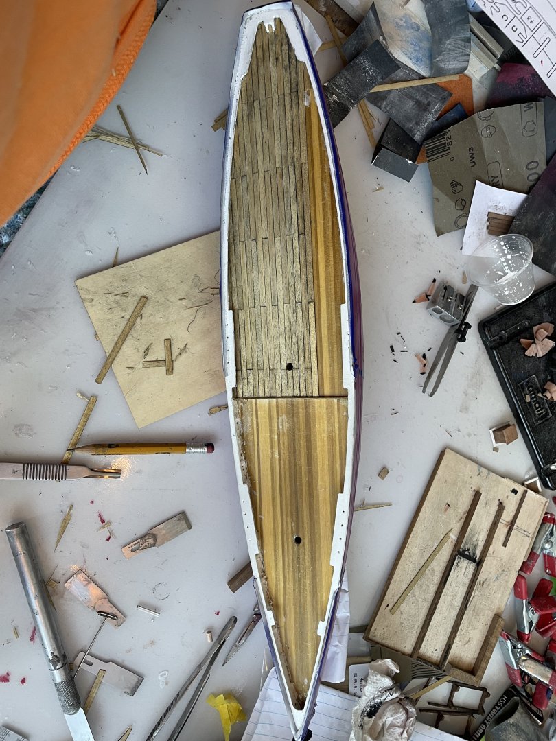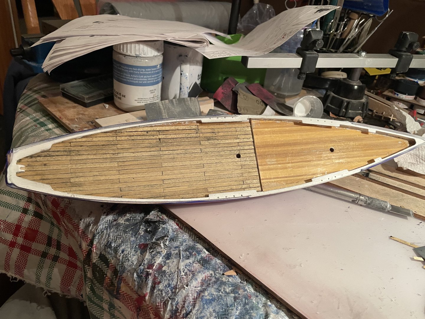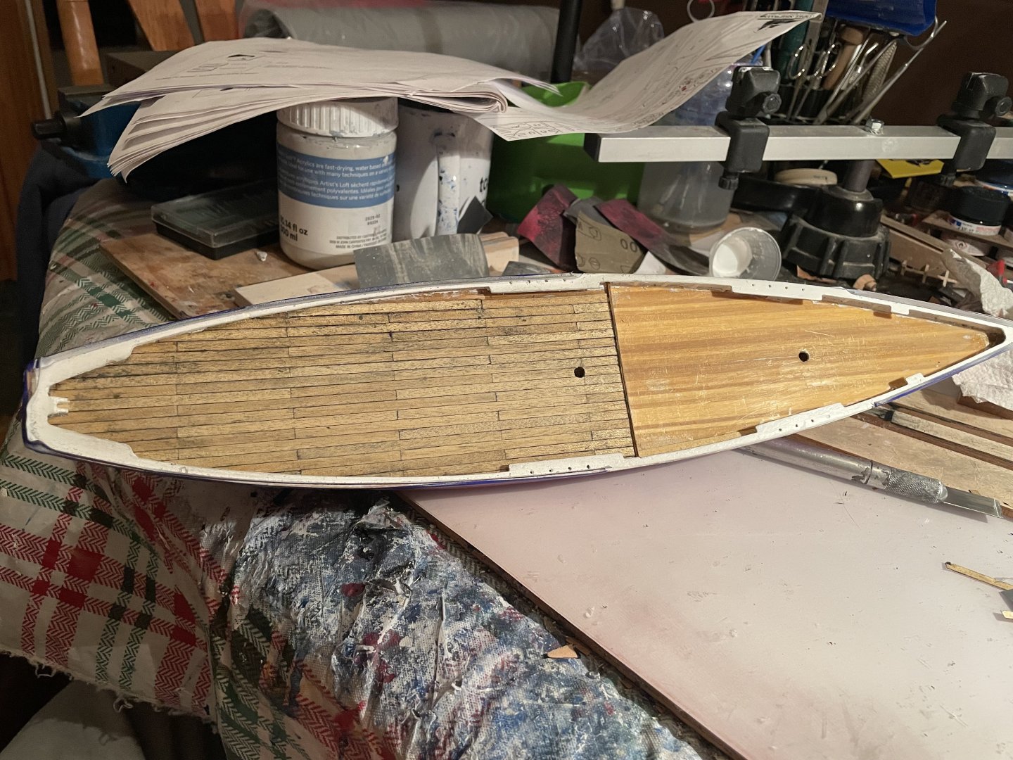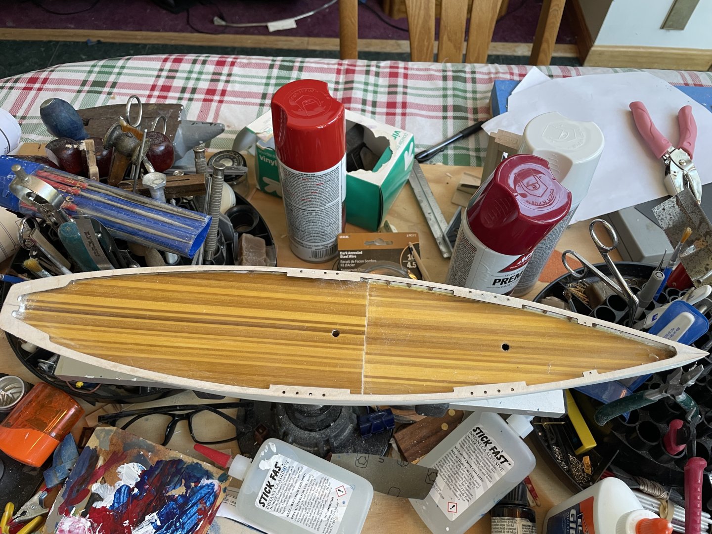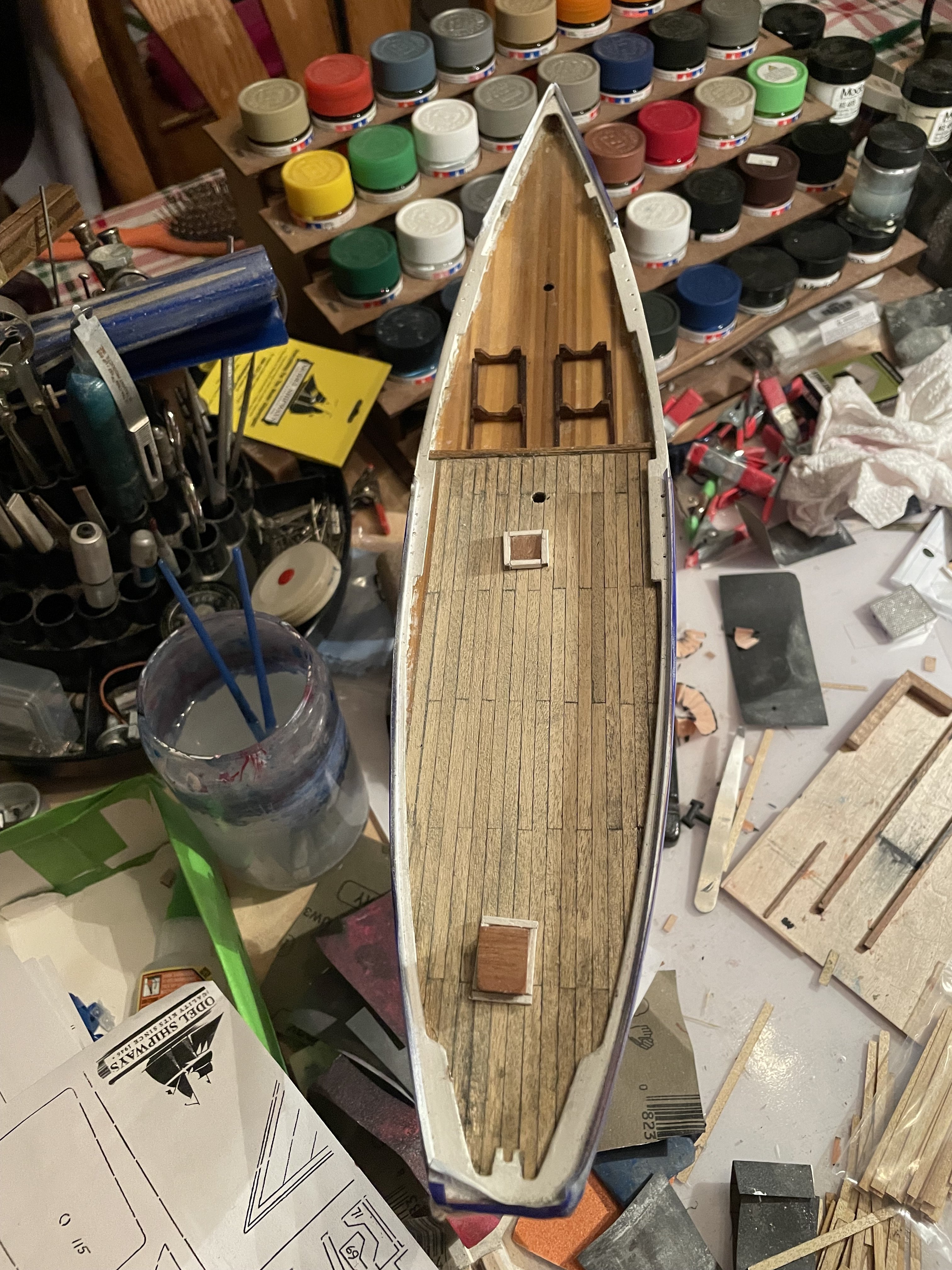 This was an abandoned kit for sale on EBay. It appears to have been abandoned after a planking attempt. As you can see from the pictures it has broken and missing parts. After a very low offer it was accepted. The kit arrived 2 days ago. After cataloging the contents it appears to have a broken false keel with a section missing. Most other parts are with the kit. The attempted planking will require some filling. The deck planking was done well but the color and vanish is atrocious. Any suggestions on correcting it short of sanding it down 1/32” and replanking it will be highly appreciated. Since numerous Bluenose histories are on MSW I will only post the limited history that’s is on the front of the box.