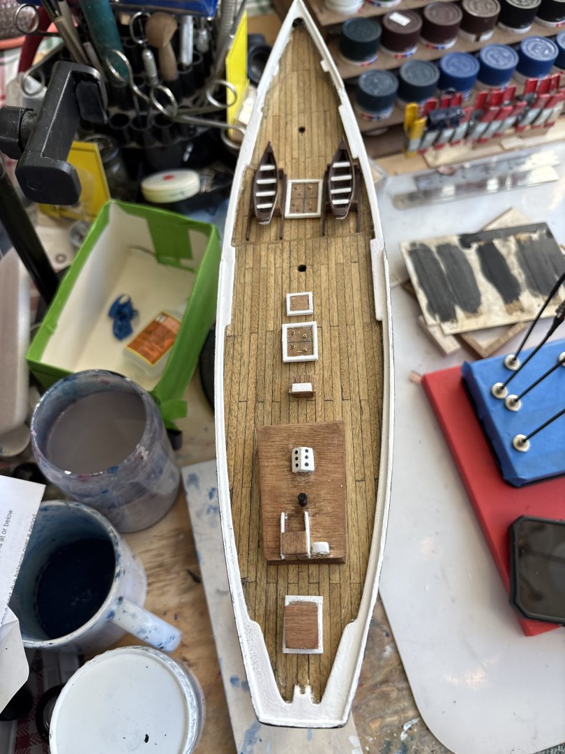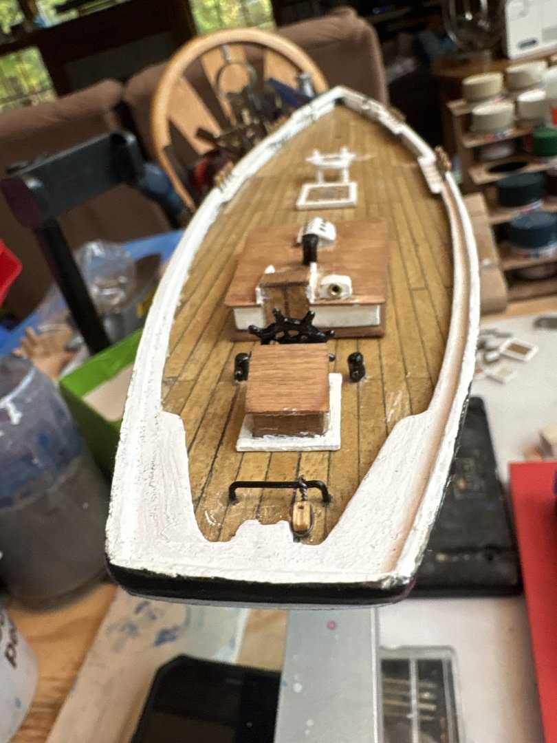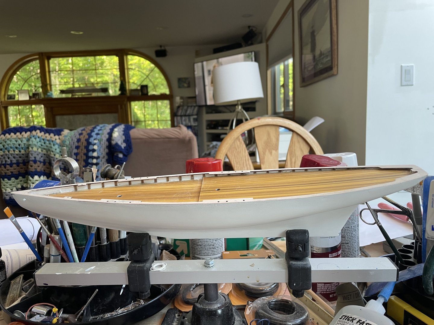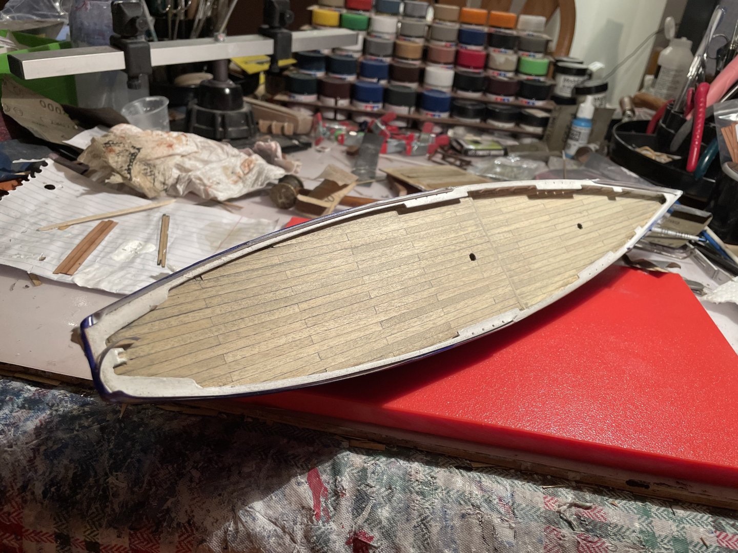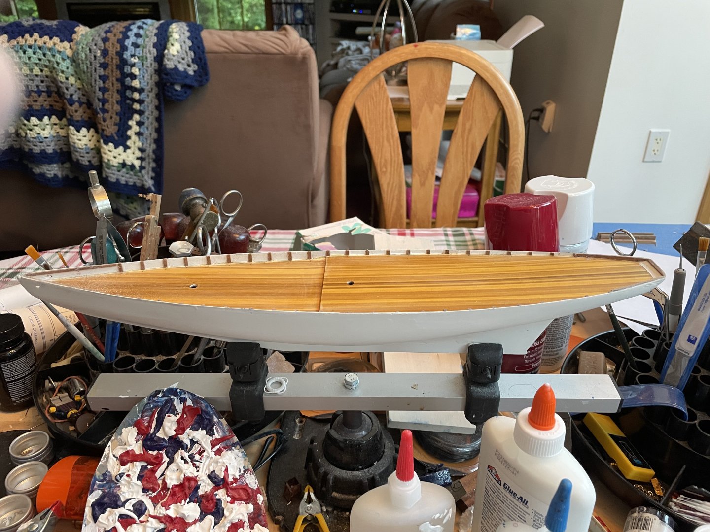 This was an abandoned kit for sale on EBay. It appears to have been abandoned after a planking attempt. As you can see from the pictures it has broken and missing parts. After a very low offer it was accepted. The kit arrived 2 days ago. After cataloging the contents it appears to have a broken false keel with a section missing. Most other parts are with the kit. The attempted planking will require some filling. The deck planking was done well but the color and vanish is atrocious. Any suggestions on correcting it short of sanding it down 1/32” and replanking it will be highly appreciated. Since numerous Bluenose histories are on MSW I will only post the limited history that’s is on the front of the box.