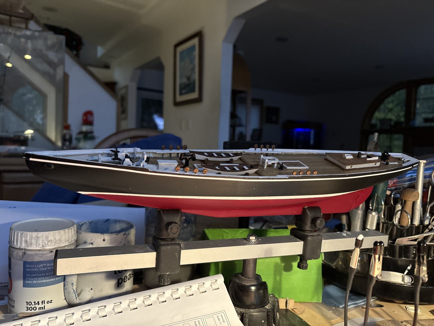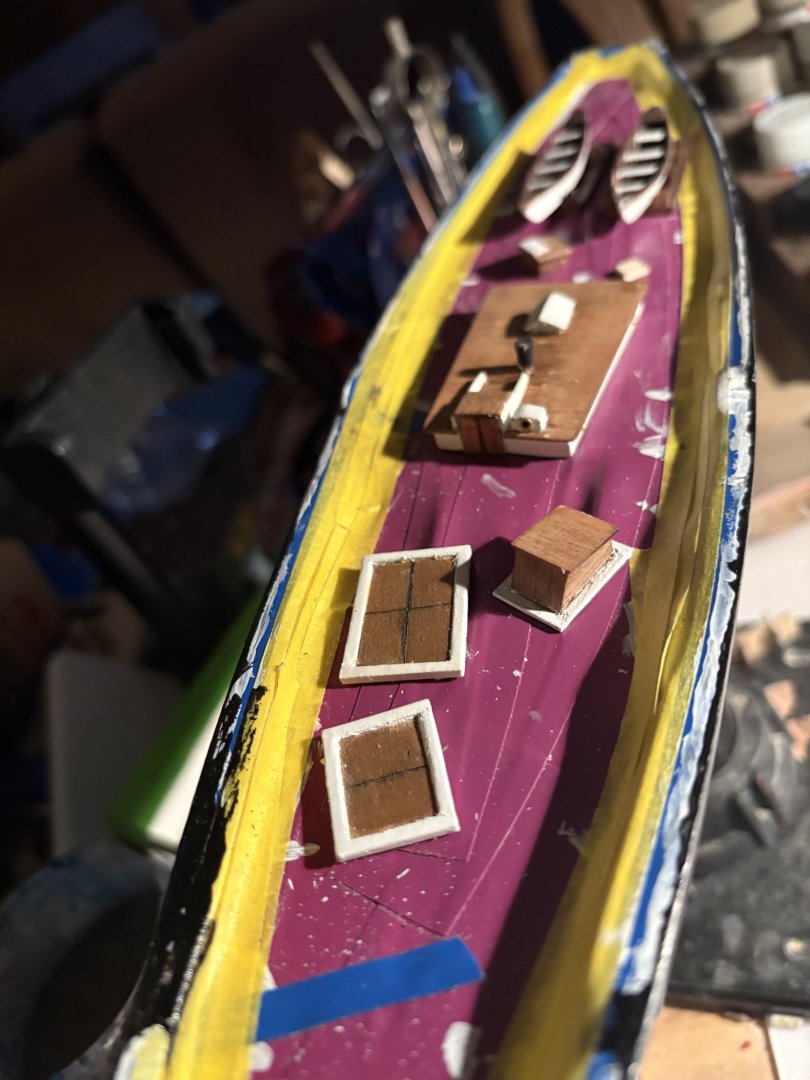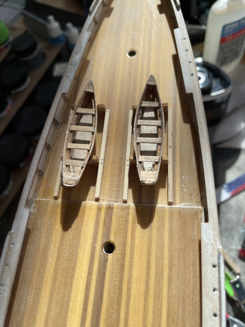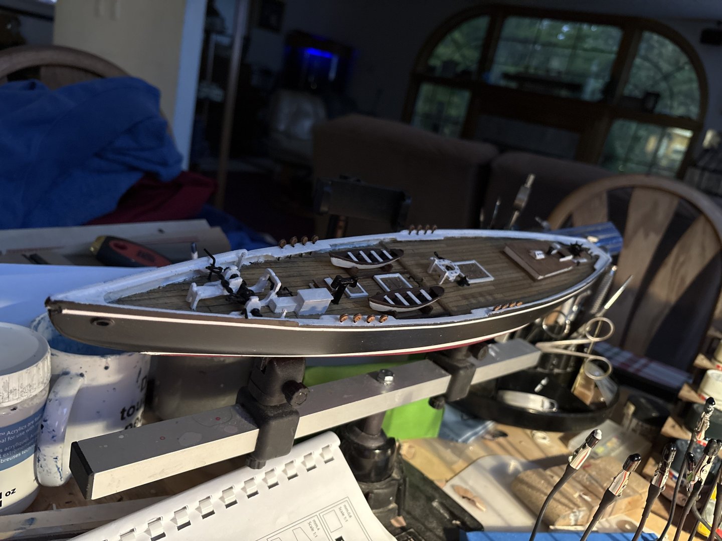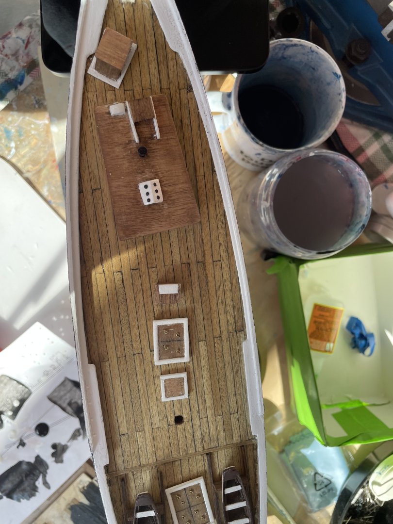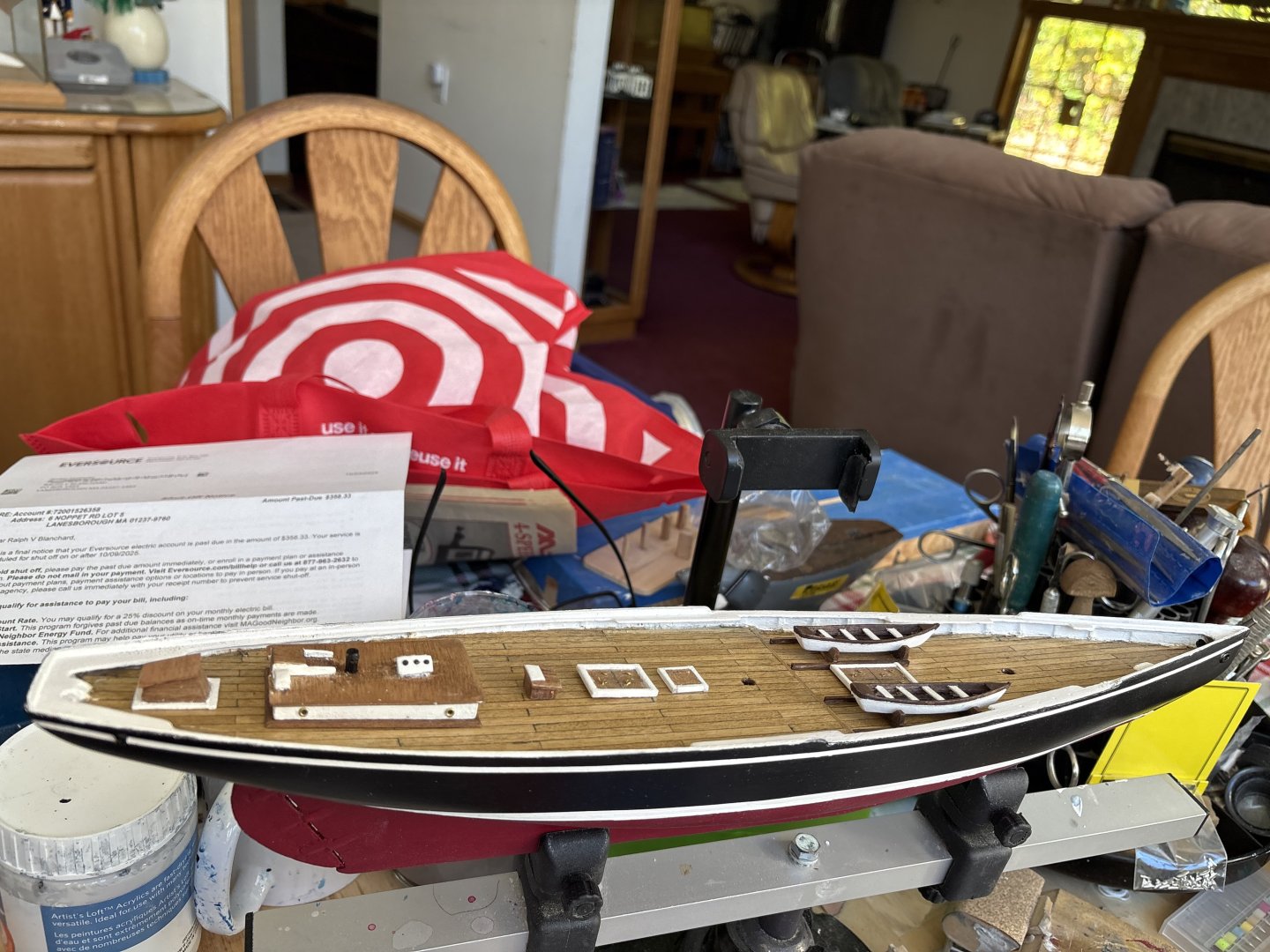 This was an abandoned kit for sale on EBay. It appears to have been abandoned after a planking attempt. As you can see from the pictures it has broken and missing parts. After a very low offer it was accepted. The kit arrived 2 days ago. After cataloging the contents it appears to have a broken false keel with a section missing. Most other parts are with the kit. The attempted planking will require some filling. The deck planking was done well but the color and vanish is atrocious. Any suggestions on correcting it short of sanding it down 1/32” and replanking it will be highly appreciated. Since numerous Bluenose histories are on MSW I will only post the limited history that’s is on the front of the box.