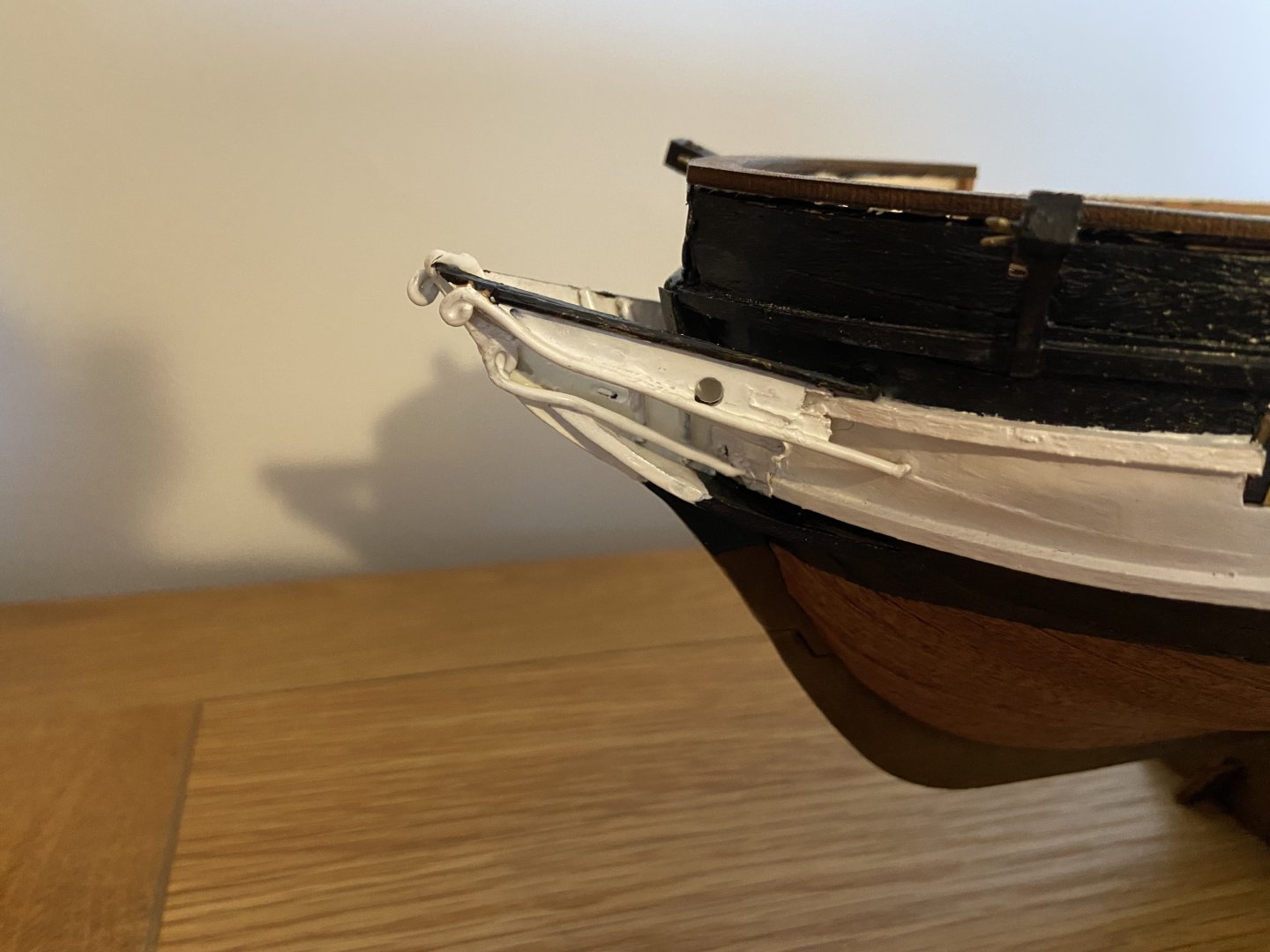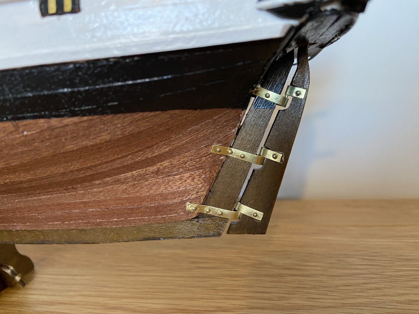 Fairly decent progress. I fit the rudder, the most challenging part of the process turned out to be cutting the nails down to a suitably small size and then gluing them into the pre-drilled holes without creating too much of a mess with the super glue. Judging from other builders’ logs, this seems to be a fairly common headache, regardless of kit, so it’s nice to know I’m not the only one who wrestled with it. I also finished up the bow decorations, which turned out to be a fairly enjoyable task overall. The 1.5 mm brass wire was easy enough to work with, though the real challenge came when trying to get both sides to look identical, which I failed at rather miserably. That said, I’m not too concerned, since only one side of the ship will ever be visible when on display. So if one side looks a little different, no one will ever know… apart from me. In hindsight, I think using laser-cut wood, as some manufacturers do, would be a preferable approach here. It’s a bit more precise than trying to get artistic with metal wire. Still, I really enjoyed the painting aspect, lining everything up with the black and white stripes on the hull was quite satisfying, and it gives a lovely sense of continuity across the whole ship. I made slow but steady progress on the gun ports. These tiny wooden squares were cut from the gunwales, then veneered front and back, painted black, varnished, and fitted with four pieces of PE brass each. A very fiddly job, especially since every tiny brass piece needed a slight trim to fit properly. The instructions seem to suggest applying a black wash over the brass, but not feeling confident, I skipped that. The bright metal adds a nice bit of contrast and visual interest, and since this build is more decorative than strictly accurate, I don’t mind a touch of shine. You can see I've also made a start on the chain plates. I absolutely love adding these. So much visual interest and three dimensional detail....