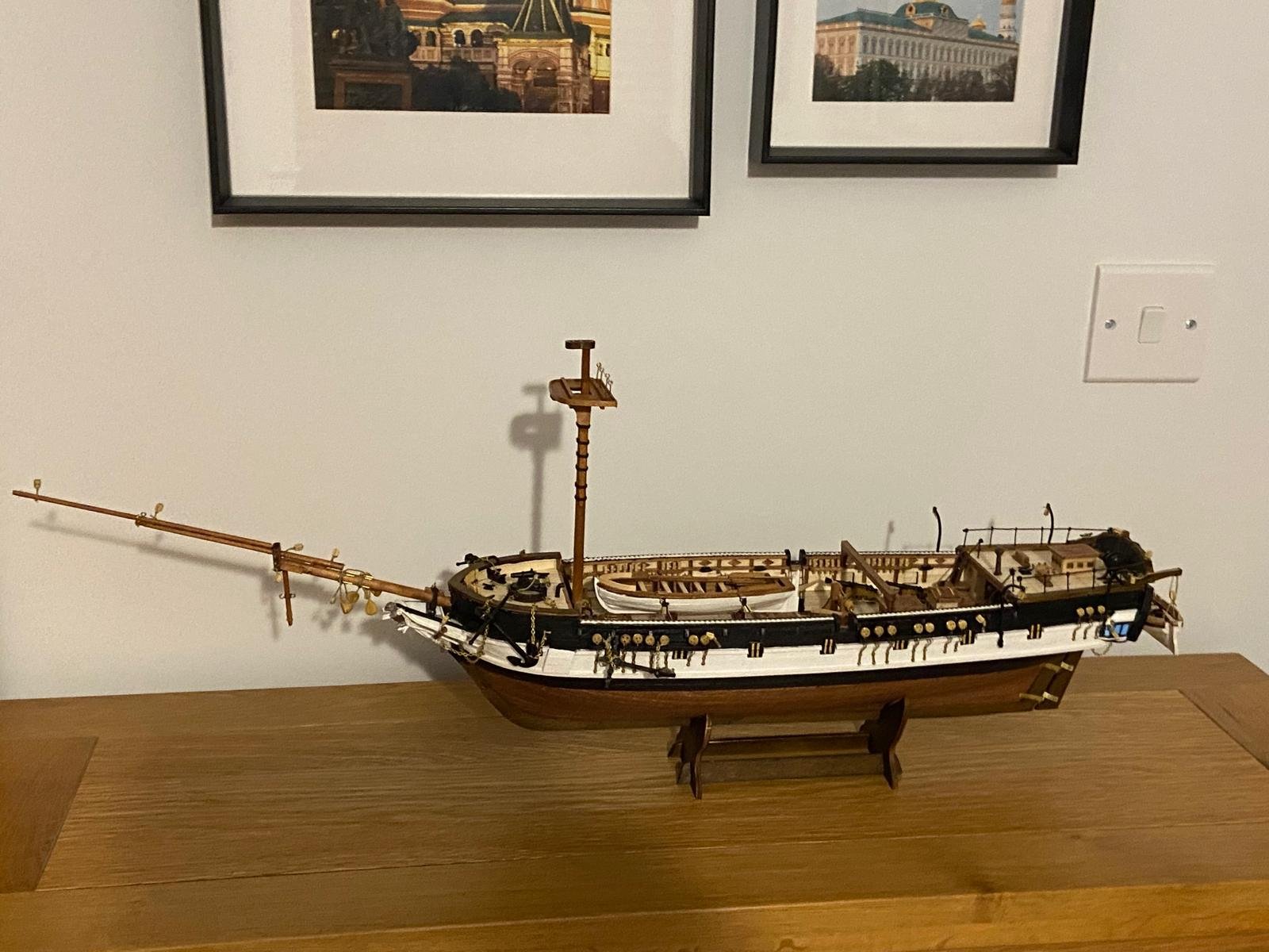 I’ve ticked off a nice milestone this month by completing the Jolly Boat and attaching it to the stern of the ship. It’s a satisfying detail to have finished, but the really exciting progress has been starting work on the masts. I began with the bowsprit, which is now glued and tied in place. The trickiest part of this stage was creating the hole at the front of the ship without damaging the delicate work in that area. To tackle this, I picked up some wood-carving bits for my Dremel and used the smallest, most precise ones I could find. Even then, it required a very careful touch, the Dremel can jump if you’re not paying attention. Even more enjoyable has been starting on the foremast. In the photo it’s temporarily fitted into the ship, purely to check that it seats properly in the mast hole before I add the finer details. I’m really liking how the model is beginning to look now that proper masts are going in, and I can already see how much more impressive it will be once the main mast and mizzen mast are added. This is one of the things I love most about this hobby. Every so often you add a single component and it completely transforms the model, suddenly pushing it much closer to looking like a real ship.