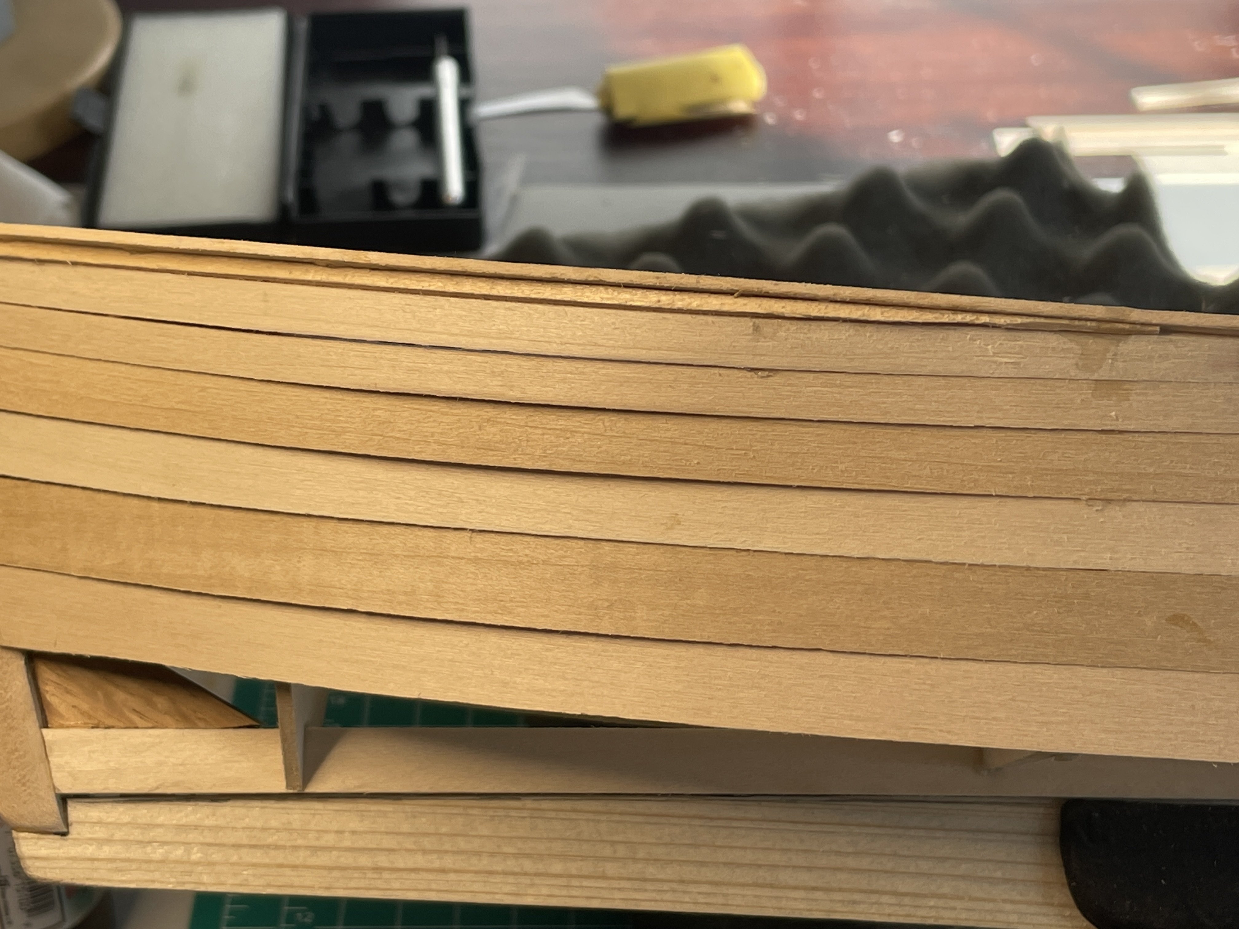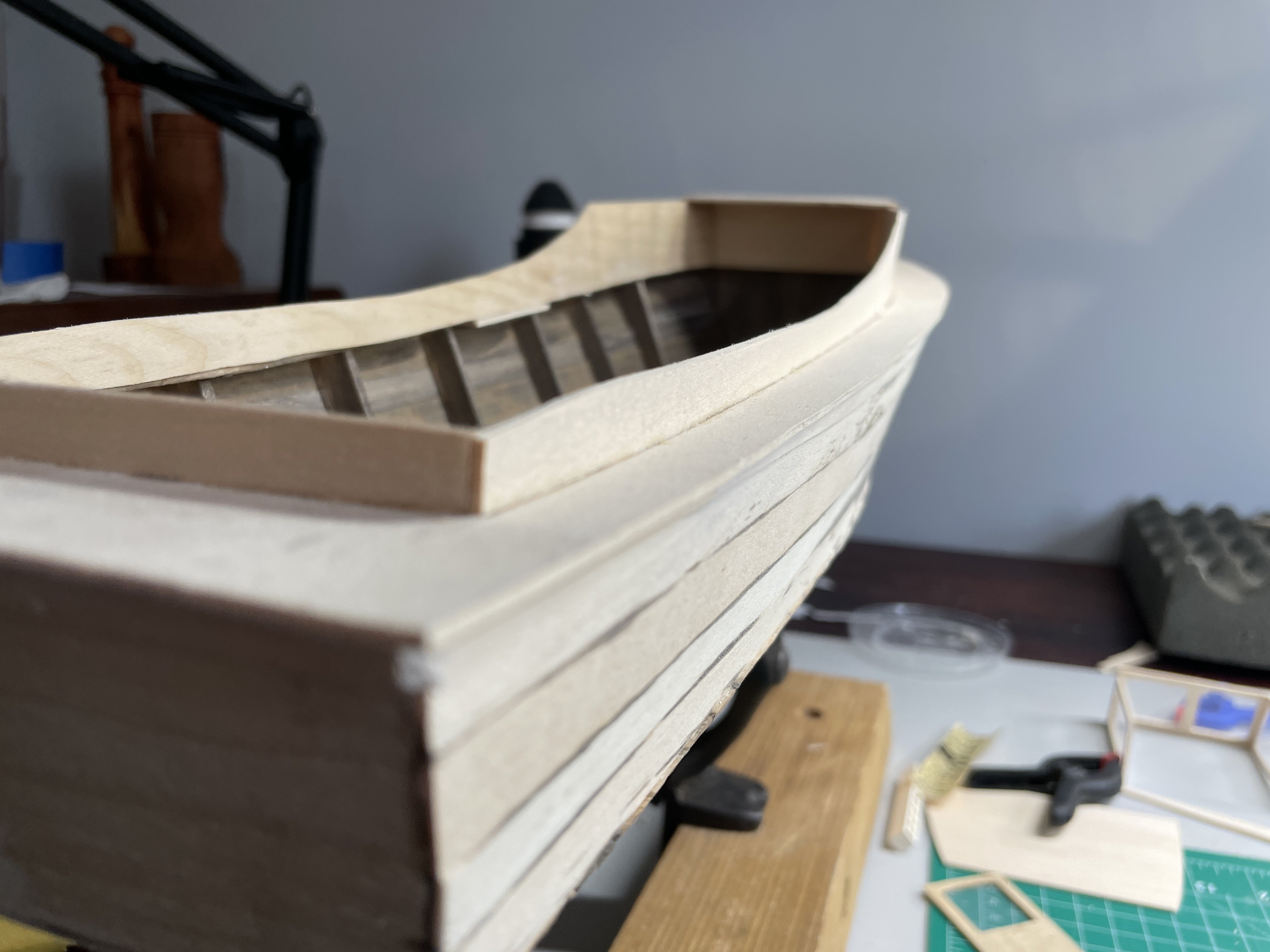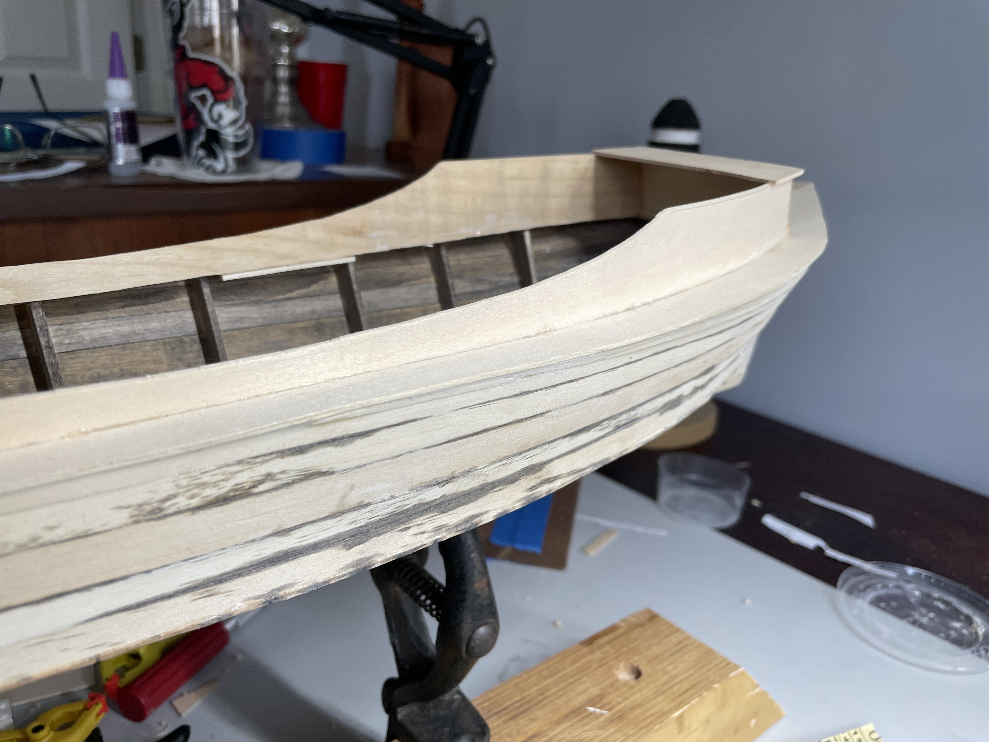 Individually fit bottom planks. Fitting planks for the bow will require soaking and shaping. I did that with 2 planks and it seemed to work. I’m pleased with how the bottom looks, hope it won’t be too hard to trim all the overhang. I don’t think it will need much filler. I’ll work on the bow next. Build time ~2.5 hrs