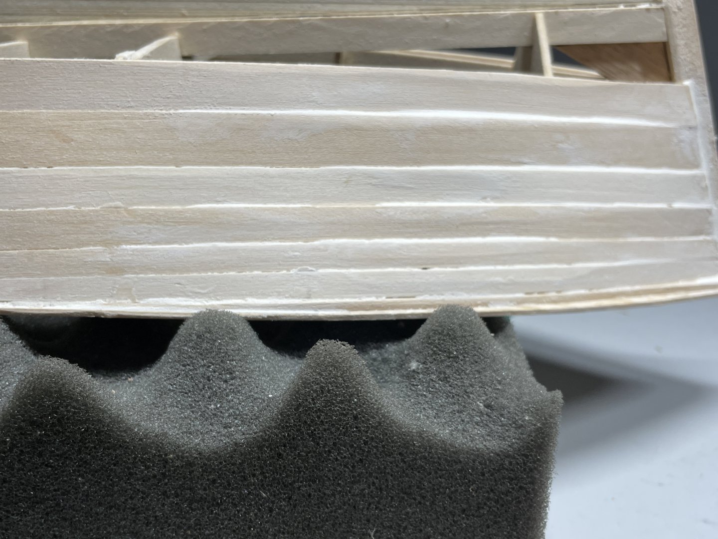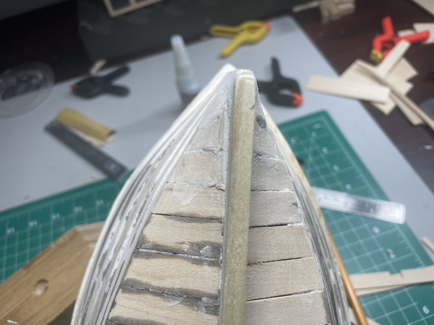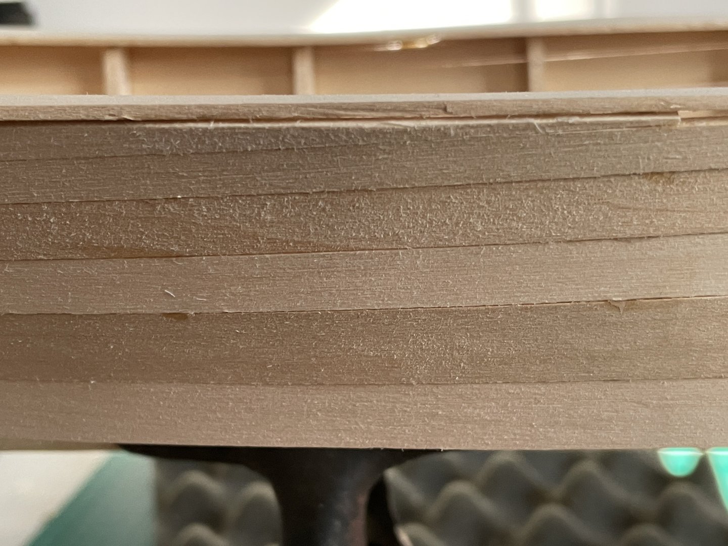 Individually fit bottom planks. Fitting planks for the bow will require soaking and shaping. I did that with 2 planks and it seemed to work. I’m pleased with how the bottom looks, hope it won’t be too hard to trim all the overhang. I don’t think it will need much filler. I’ll work on the bow next. Build time ~2.5 hrs
