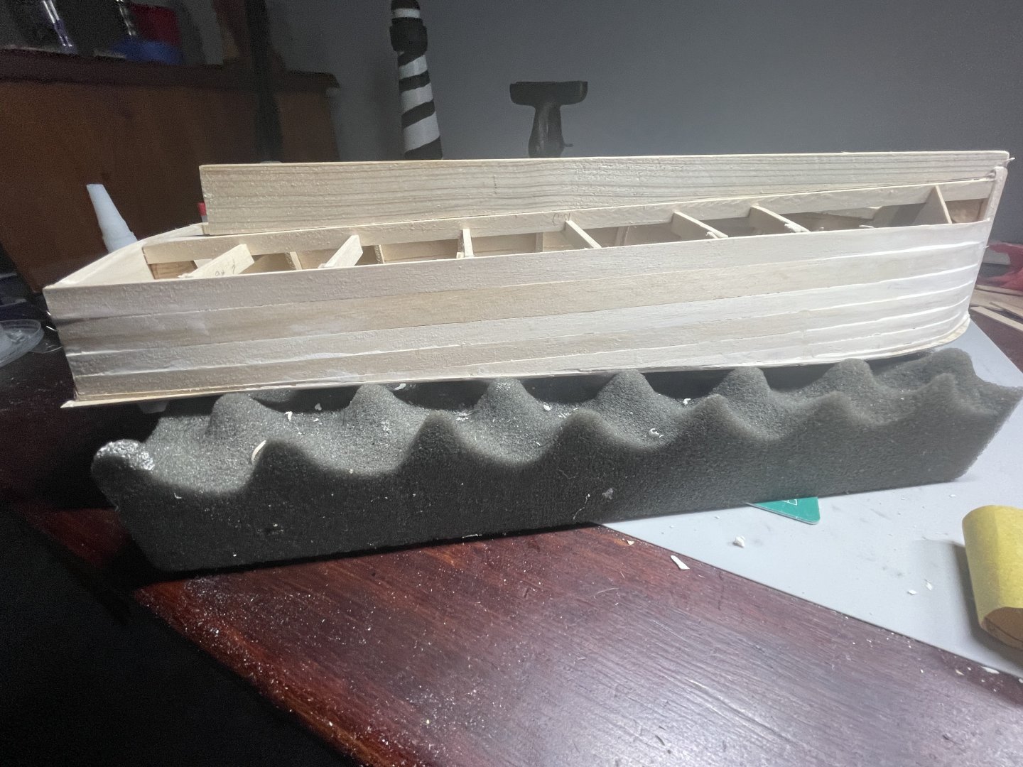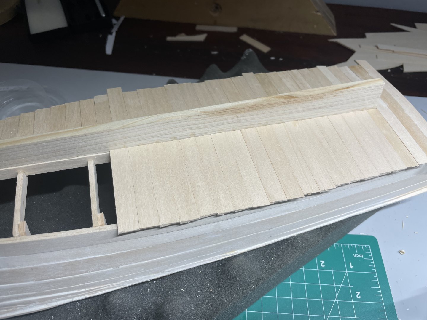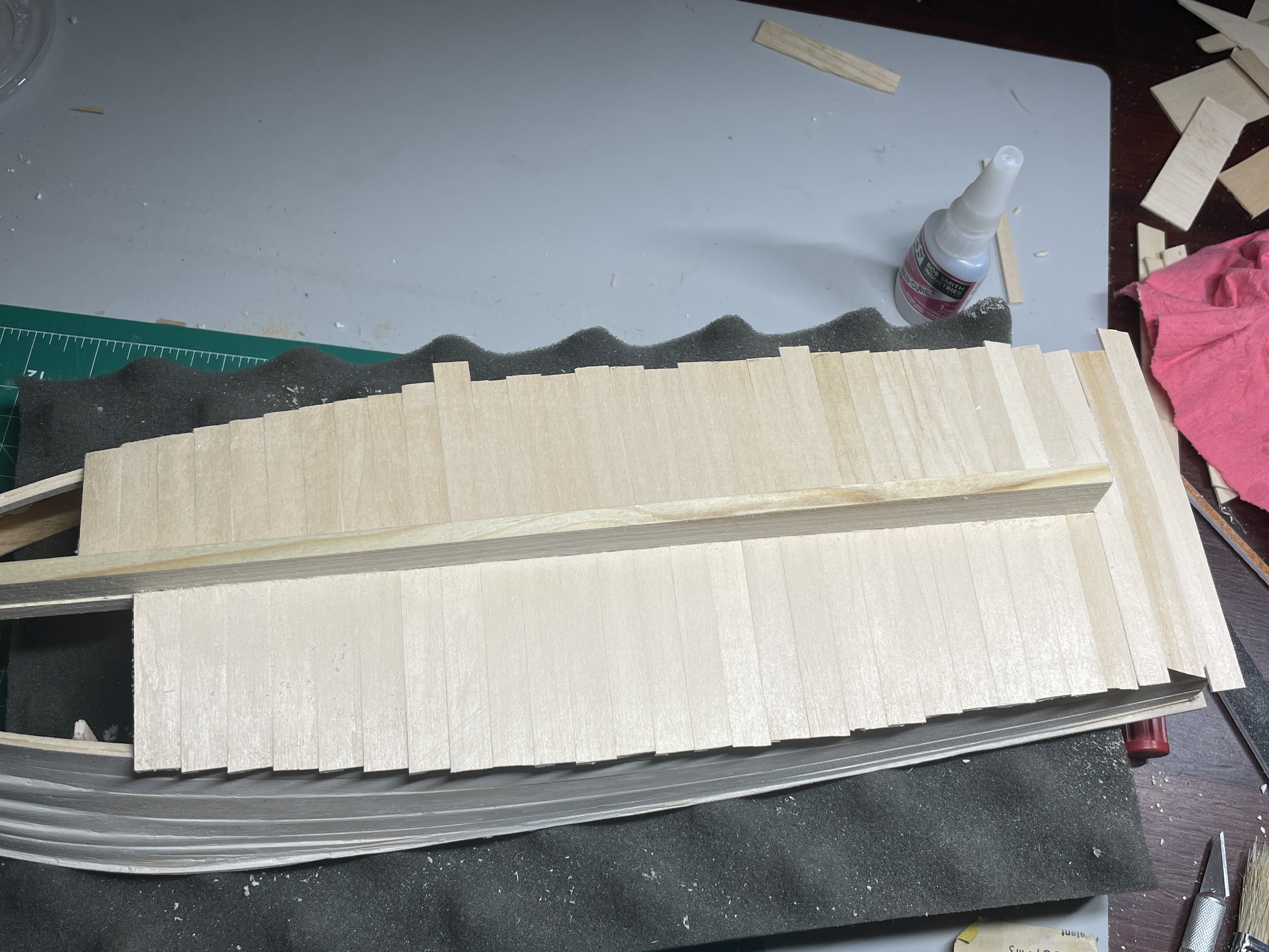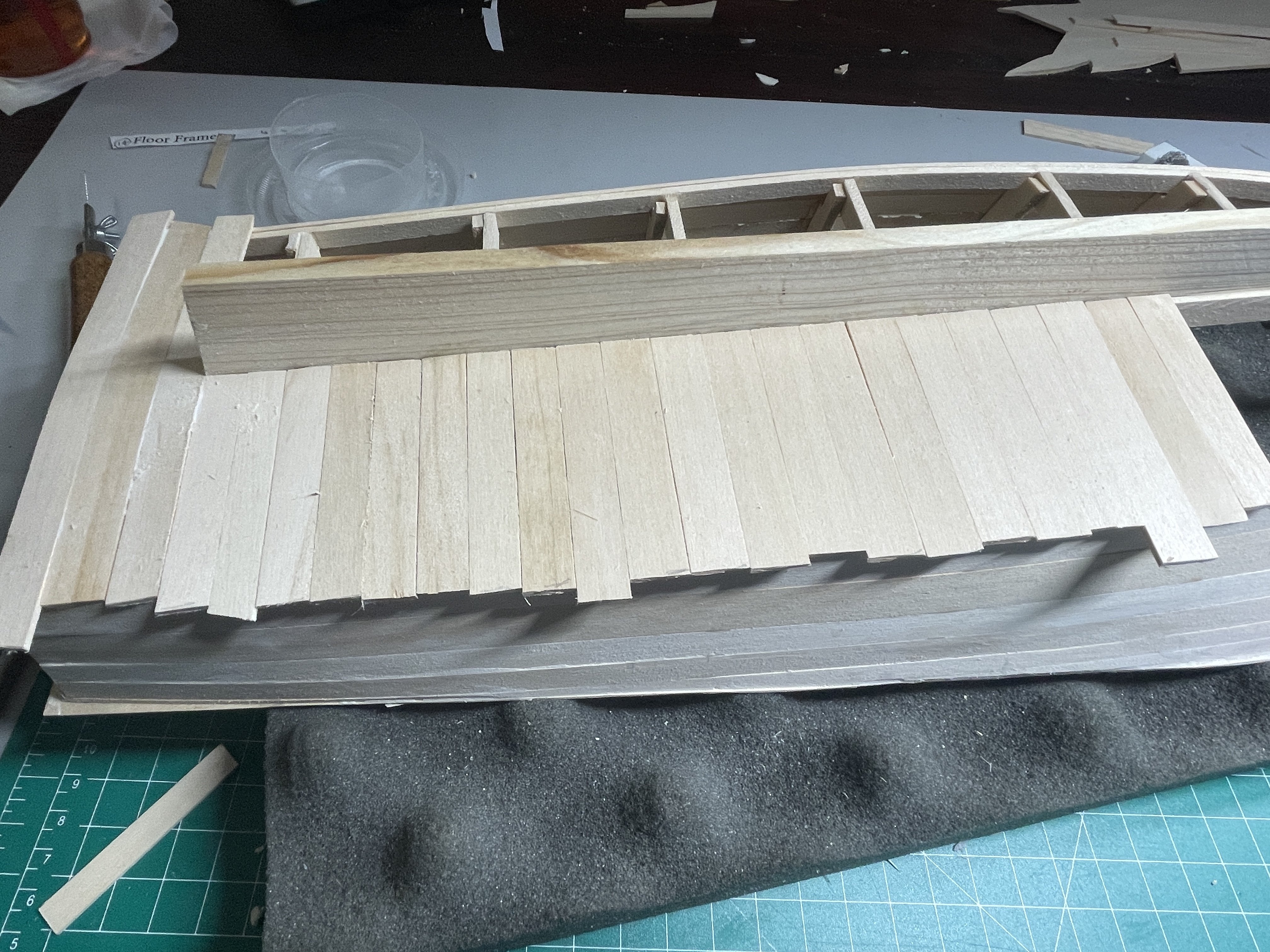 Cut floor frames for the other 4 members which had to be individually fit to the chine on the port and starboard side. Positioned and glued remaining frames to the keelson and chines. Several of the floor frames were high so were plained down so the floor will lie flat. Next, the 2 pieces of the deck were joined with a cross brace at the bulkhead and at the transom. Positioned and glued the deck to the bow stem, bulkhead and transom. Shaped the keel to fit flush to the keelson and glued. Cut and glued individual deck supports at each floor frame. The angle and position of these braces relative to the edge of the deck needs to be consistent so that when all planks are attached, their position relative to the deck is consistent. Installed one 1/2” hull plank to each side. In review of material provided, determined that 1/8” wide strips were provided instead of 3/8” wide. I will need additional 24” strips of 1/2” or 3/8” wide to complete the hull planks. Time for this build ~4 hours.