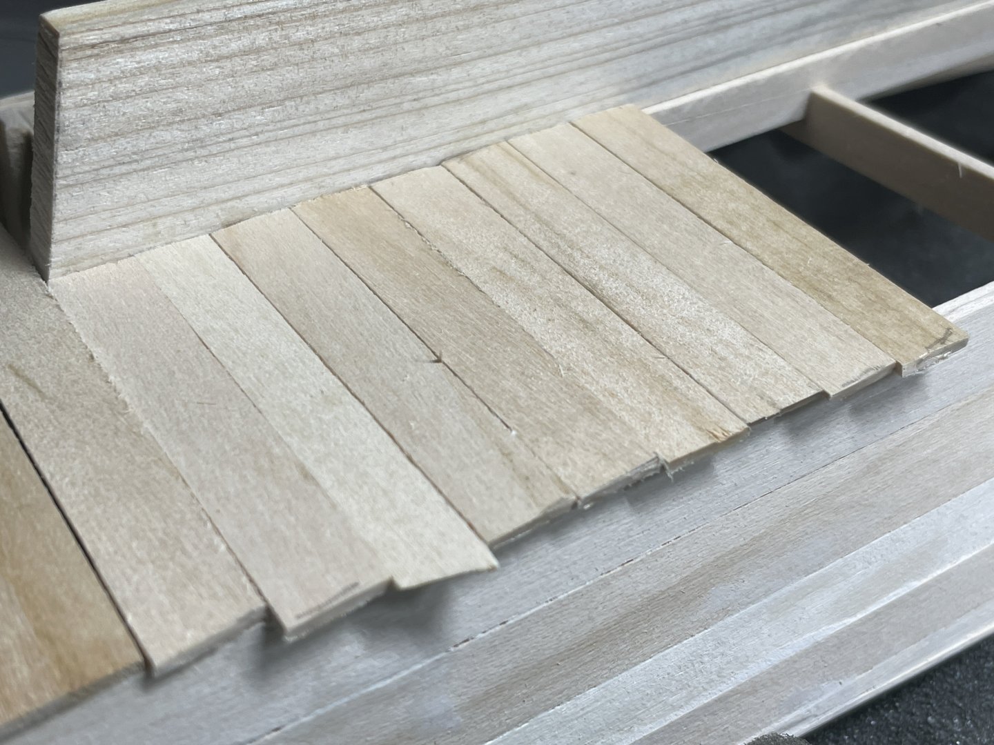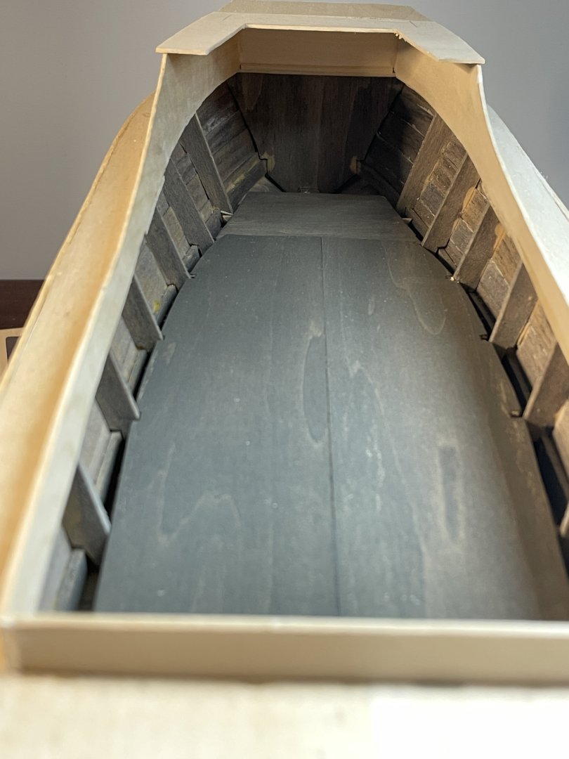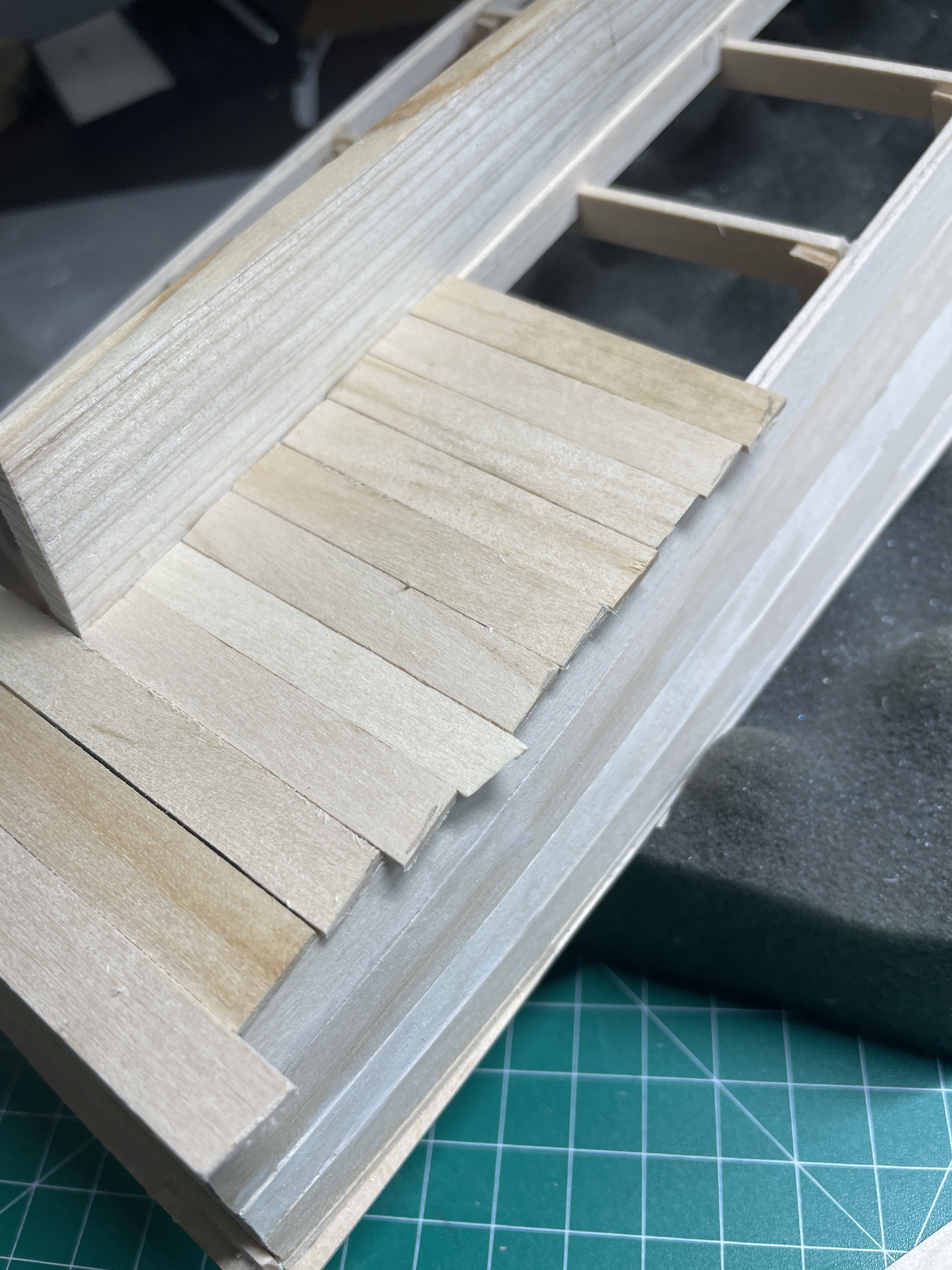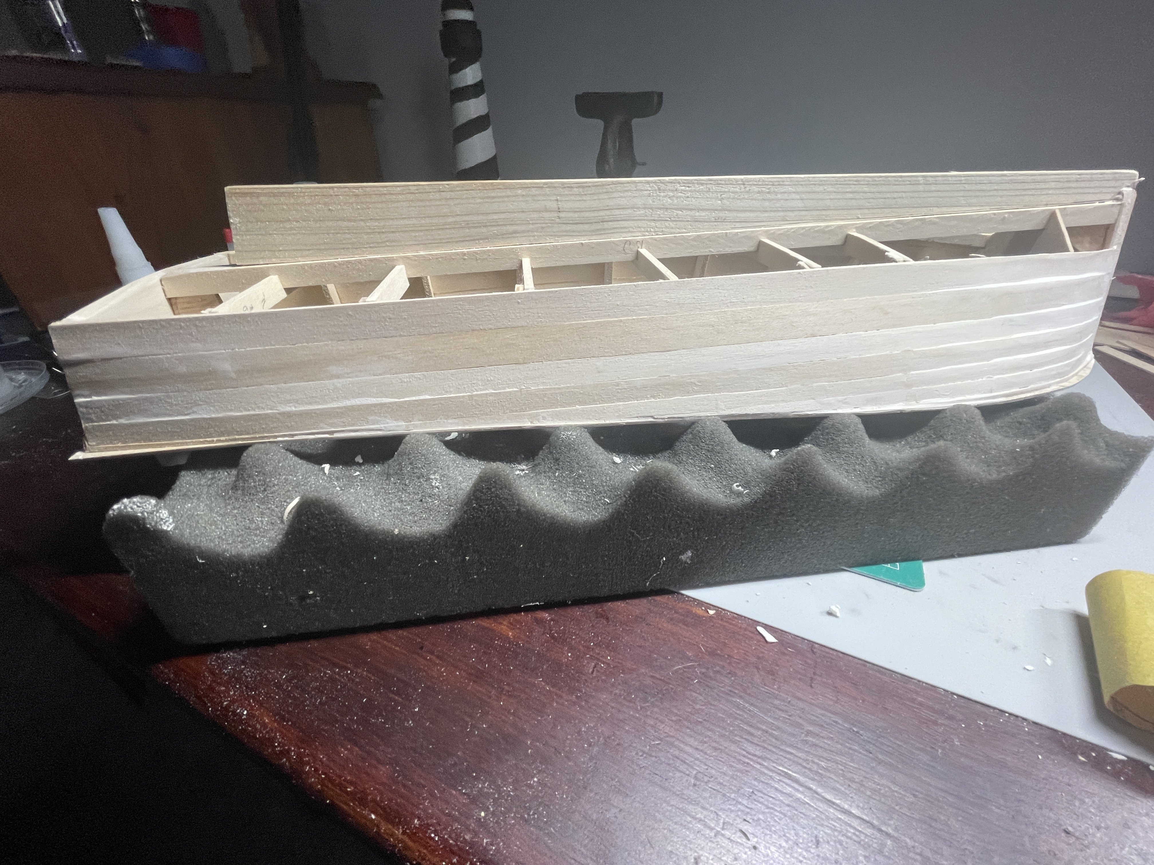Cut floor frames for the other 4 members which had to be individually fit to the chine on the port and starboard side. Positioned and glued remaining frames to the keelson and chines. Several of the floor frames were high so were plained down so the floor will lie flat. Next, the 2 pieces of the deck were joined with a cross brace at the bulkhead and at the transom. Positioned and glued the deck to the bow stem, bulkhead and transom. Shaped the keel to fit flush to the keelson and glued. Cut and glued individual deck supports at each floor frame. The angle and position of these braces relative to the edge of the deck needs to be consistent so that when all planks are attached, their position relative to the deck is consistent. Installed one 1/2” hull plank to each side. In review of material provided, determined that 1/8” wide strips were provided instead of 3/8” wide. I will need additional 24” strips of 1/2” or 3/8” wide to complete the hull planks. Time for this build ~4 hours.