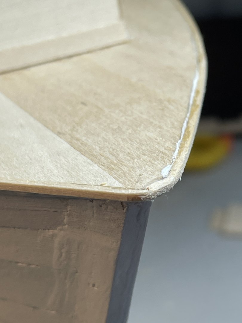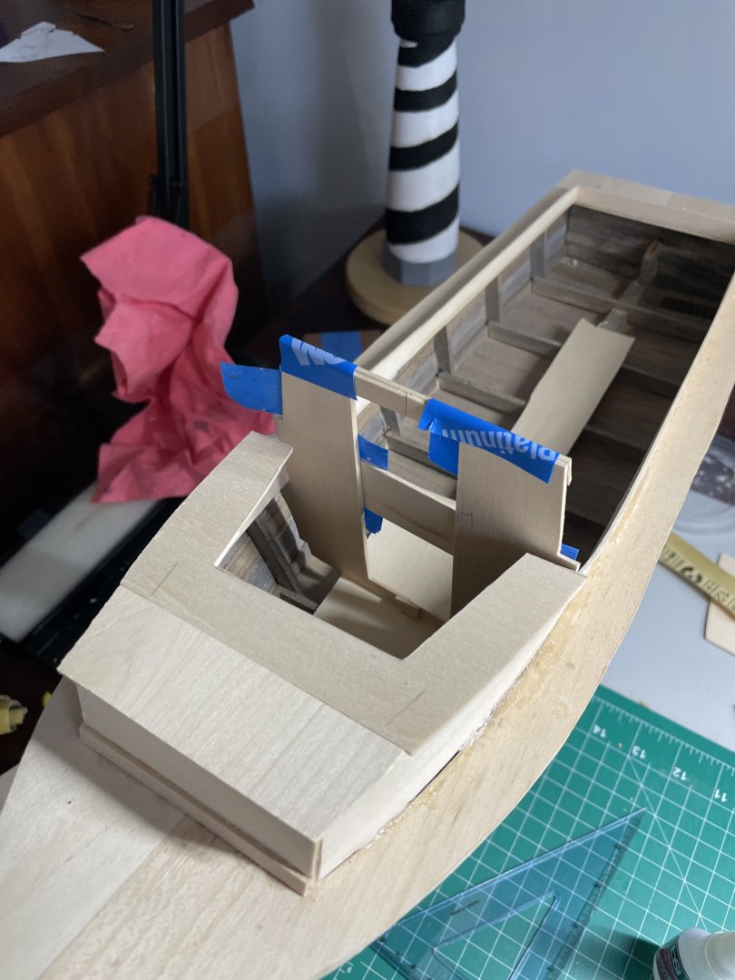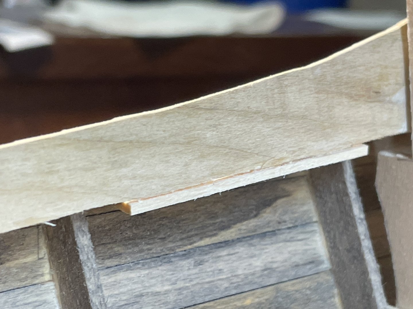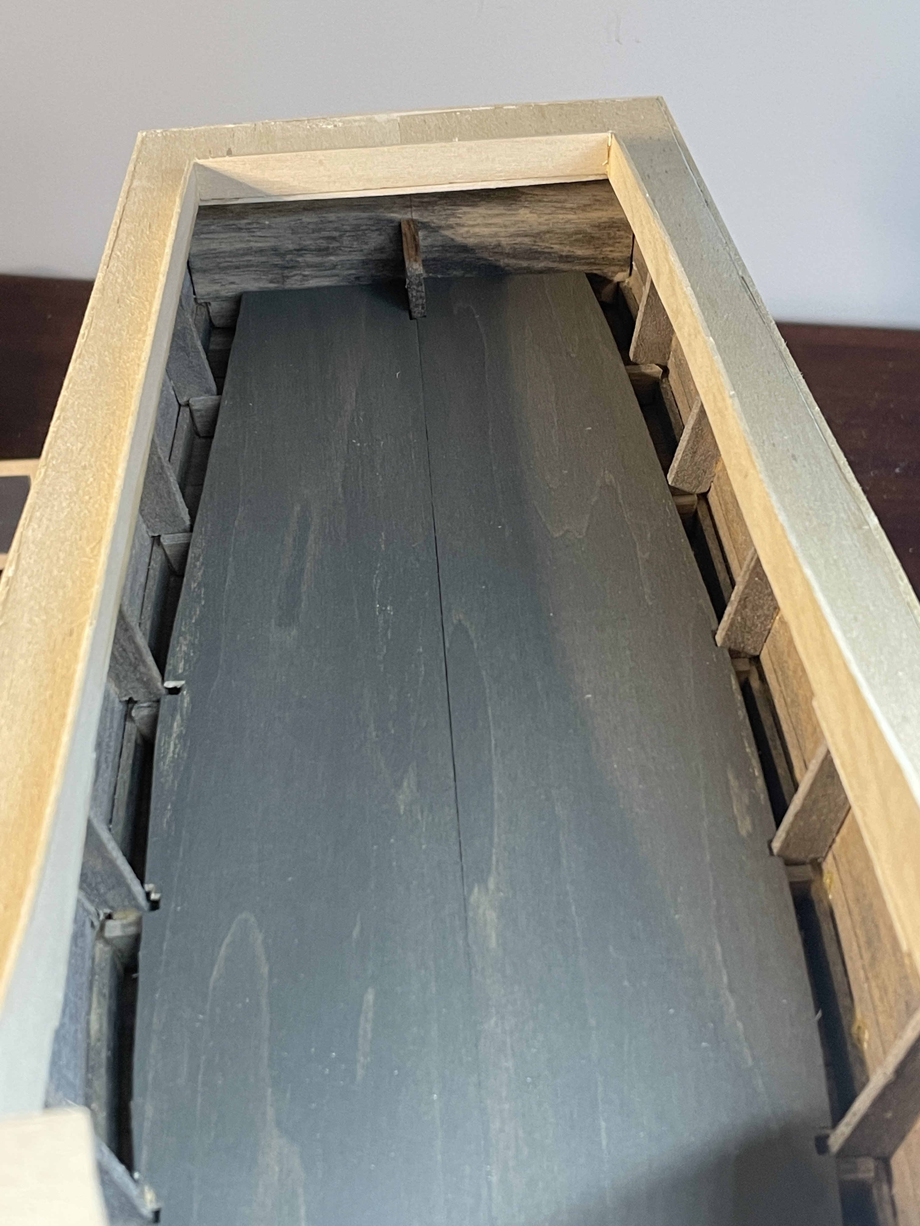 Cut floor frames for the other 4 members which had to be individually fit to the chine on the port and starboard side. Positioned and glued remaining frames to the keelson and chines. Several of the floor frames were high so were plained down so the floor will lie flat. Next, the 2 pieces of the deck were joined with a cross brace at the bulkhead and at the transom. Positioned and glued the deck to the bow stem, bulkhead and transom. Shaped the keel to fit flush to the keelson and glued. Cut and glued individual deck supports at each floor frame. The angle and position of these braces relative to the edge of the deck needs to be consistent so that when all planks are attached, their position relative to the deck is consistent. Installed one 1/2” hull plank to each side. In review of material provided, determined that 1/8” wide strips were provided instead of 3/8” wide. I will need additional 24” strips of 1/2” or 3/8” wide to complete the hull planks. Time for this build ~4 hours.