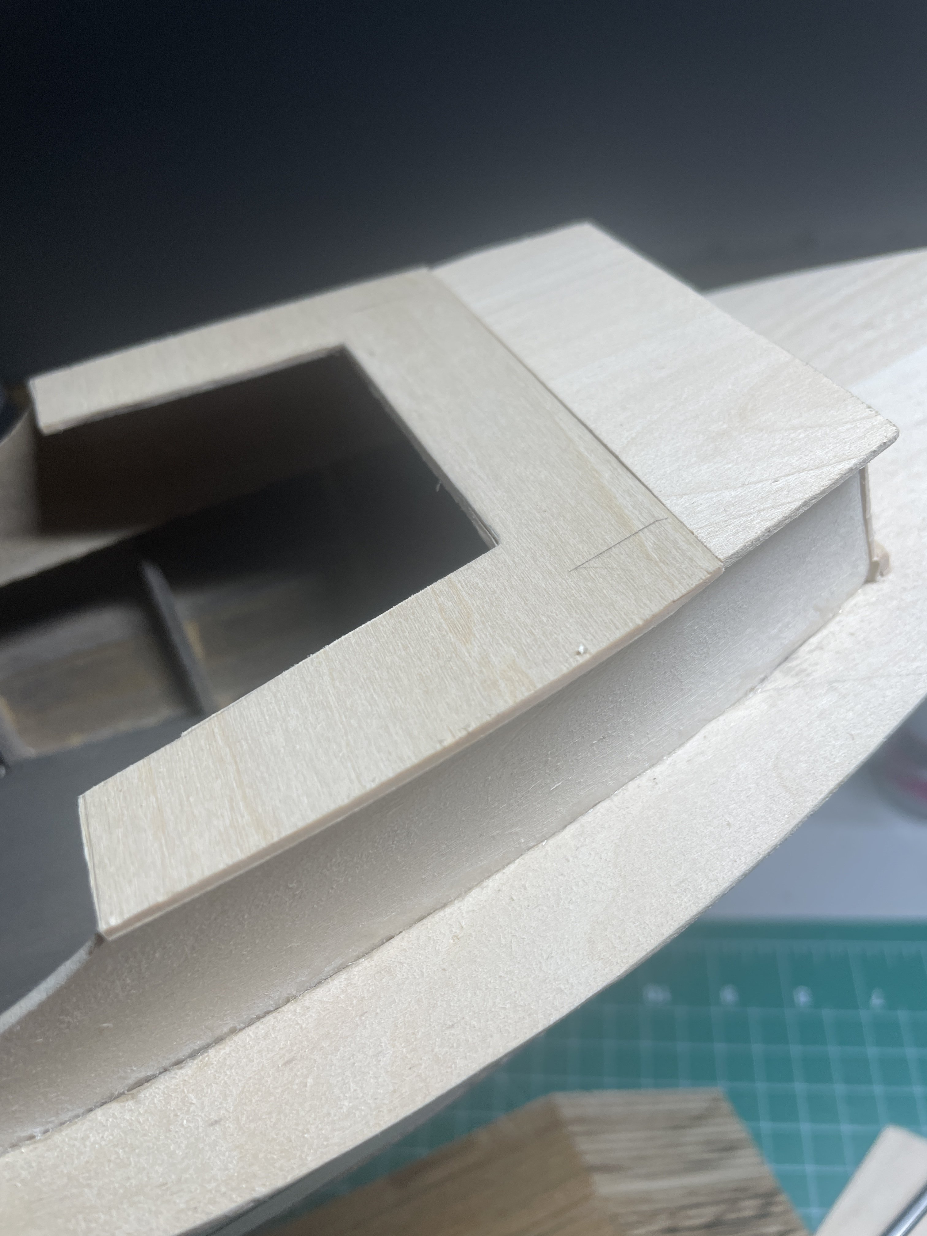 I prepared the cowling by soaking and shaping. I was concerned that trying to glue the cowling to a 1/16 inch thick deck board was gonna be next to impossible. I added support plates under the deck at the bow, stern, and on either side midship. It turns out that this worked OK – I could’ve used more support along both sides. Any overhang on the support can be trimmed flush with the cowling. I had to recut the lower cabin front to fit as the plans were too short. As an afterthought, cutting many of the pieces early may result in ill fitting situations although this is the first to short (several have been long). The lower cabin roof was installed. I needed to add to the roof in order to get back to the rear of the cabin and to have someplace for the front and side windows of the upper cabin to sit on. Had to make adjustments to the rear cabin on each side to fit the hull and cabin roof line. I assembled the rear cabin and decided to cut a space for the door out of the center. I added supports on the top and bottom of the rear cabin in order to join the two pieces together. Before I finish up the cabin, I need to decide on what accessories for the cabin I want if any. I’m thinking as a minimum a helm and seat in the cabin and also some pre-cut items for the deck. If that’s the case, I’ll have to find some to order before I complete the cabin build. Build time 4.5 hours.
