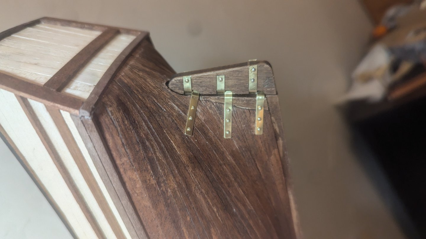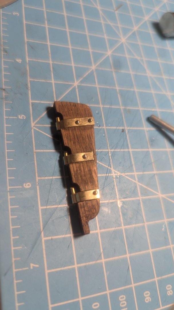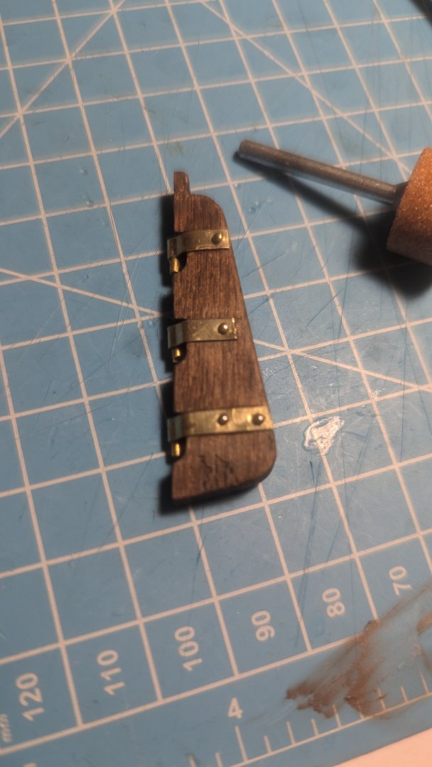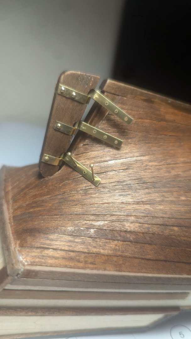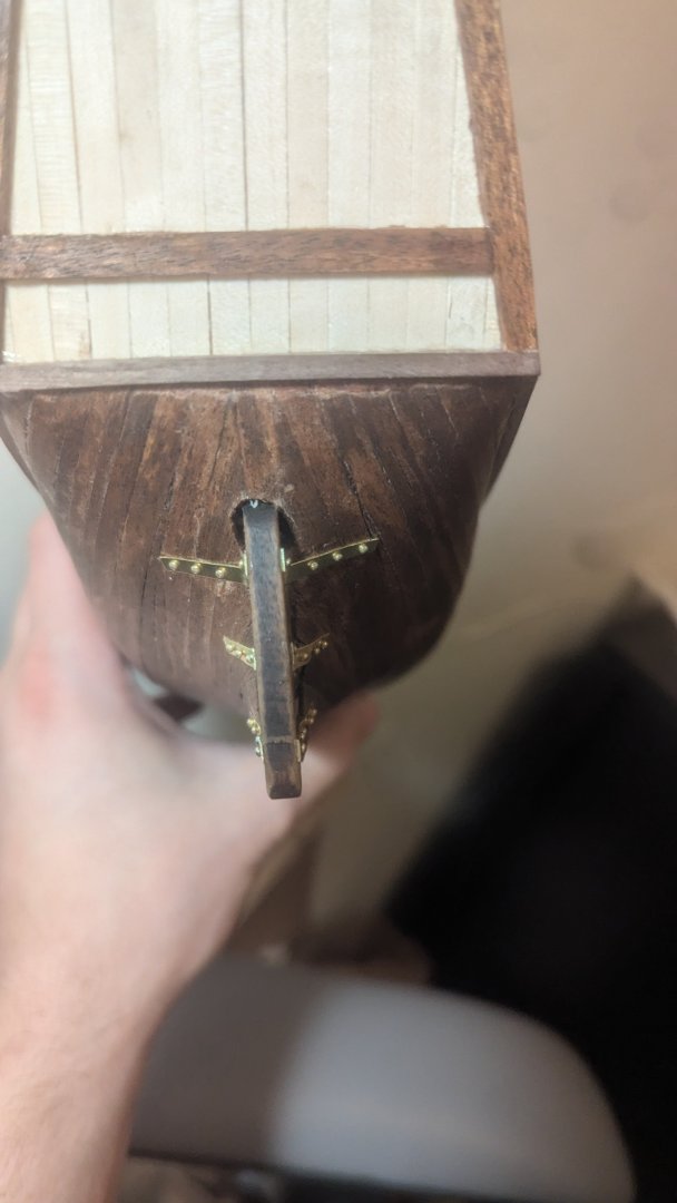 Hello all, thank you for the lovely responses and welcomes. I've been working on it throughout the day, though based off of what was accomplished you wouldn't have guessed that. I did the rudder! I glued the bracings then nailed them in, clipping the nails short so they wouldn't go through. What a hassle. I yearn for a pin pusher, having to hammer dulled nails in took forever. I have an hour long time lapse of me trying to get ONE pin in. Doing something over and over expecting a different result.... I hope that's not a definition for anything. I put the hull braces on the pins, they seemed to stay in place alright so I was able to fix the rudder with them on it And then I nailed! Mostly I didn't have to cut the nails short which was nice. I didn't put glue as I feel the nails did the job. Should I have? I know the hole for the rudder is wonky, I'm not sure how to fix that, I'll think of something but if you have ideas let me know! Best, James Also I'm varnishing the hull right now and it's a bit chaotic wish me luck