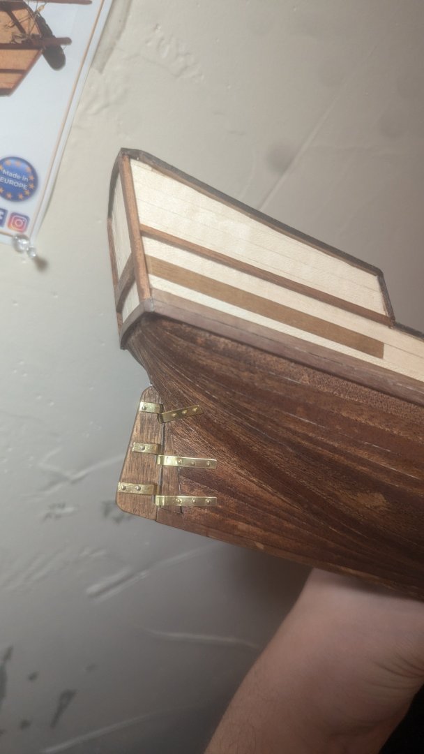 Hello all! I have been trying to get a lay of the land here for a few days before posting and think I am starting to get it (92 % sure I'm posting this in the correct place)! I will post more about my story and why I got into modeling in a new member introduction post, but I wanted to get this build log started for the OcCre Albatros first. I am a good way into the assembly of the hull, I made a few early mistakes that are pretty laughable and ai can't wait to show you. I am brand new to modeling in general, but still feel proud of where it's at, despite the flaws! Fair warning I venture off the instructions at one point to add a different type of wood from my dad's leftover model scraps, he passed last year and this is my way of honoring him, it feels very good (more on this will be posted in the introduction forum). ANYWAY let's get to the ship! I'll post everything I've done so far in this post, then start updating it regularly. Feedback and friends more than welcome, you all seem so nice. Assembly of the hull structure This was relatively straightforward, I will say at the time I wasn't super concerned with achieving a perfect 90° angle, BUT thankfully I used the deck piece to align the frames, and I believe that worked to get the angle. There are some mistakes I made early on in the build that are simply due to me not researching and understanding the process beforehand, I am better now(mostly). Deck planks were also glued with no mishaps woohoo! (Dad's urn in the back, it has Albatross birds engraved in the metal, very poetic) Bulwarks Ok, this is the biggest mistake I've made on this ship, it has caused a lot of other issues but solving them as they come up has been a big part of the fun:) Lot of creativity to be had with mistakes and it feels amazing. Ahhh I snapped a bulwark, and also glued them in place not completely flush with the deck slots. I don't have any pictures here because I wasn't very proud of this blunder. I, being ignorant to modeling in general, saw the bend at the bow and assumed, "Well the instructions say to put it here, so surely the wood will survive the bend". The wood said, "Don't call me Shirley" and broke. This was when I learned I was an idiot and should probably be researching more. Anyway I glued it the best I could and lined it over with planks, and it looked passable for now. I also lined the rest of the deck. First Planking Alright, on to the fun stuff, man did I brute force the planks, giving me tiny nails was a mistake. LUCKILY I did wet the wood, however I did NOT taper the ends and without the nails, glueing these would've been impossible. After seeing other builds here, this looks pretty rough, but I'm not going to lie to you, I'm still proud of it. It's flawed but I did it and took great satisfaction from the work. Will do better next time but THIS time, I'm enjoying the process and learning my lessons. Wood filler and sandpaper will be my salvation. I also lined the outside of the bulwarks and the stern of the ship, mostly covering the break in the port side bulwark but they are both still bent poorly. The one segment of off color wood in this next picture (towards the stern of the bulwark) is a piece from my dad's old kit scraps! It's off the book but still looks great there, a little piece of him. I used Minwax wood filler, and good lord this stuff stinks, got a headache and made my partner appropriately mad for making the whole house smell like chemical for a day. An appropriate penance for imperfection. I served my sentence stoically. Keel After much sanding I planked the stern, again the bulwarks aren't completely flush and the link is imperfect. I decided to put in the keel early to help with aligning the second layer of planks Oooh wouldn't you know it, the bulwark mistake haunting me again, when the keel is flush with the false keel (sorry if these are incorrect terms) it goes up too high on the bow, and covers the premade hole in the bulwarks meant for the foremast. Problem for later. Second planking Alright, this is the real deal, no covering these with a third layer of planks. I was much more careful and even started tapering the ends, though I didn't do it as soon as I should've. Still, ended up looking pretty good and again, I'm happy with it for a first attempt. Perfect? No. But I love it. There's a little piece here, right behind the stern keel, that I put in straight, rather than bending the planks around to meet behind where the rudder will be attached. I have to ask, is this taboo? It made it easier to cover everything. Please let me know! Aaaand my favorite part ... STAIN I used a dark walnut stain after sanding the planks with a fine sandpaper. Dang doesn't that wood look amazing? I know I should focus on the flaws but agh I can't help but admire it. It feels so good to just stare at something YOU CREATED and look on it with admiration, I'm sure many of you enjoy this feeling with greater works. This hobby is so fun. I regret not getting into it sooner to discuss it with my dad, or to build one with him. He'd be proud of this one I think, he always was generous with his pride. Rubbing Strakes and Lining Anyway, on to some finer details. I invested in some proper clamps, I only had one good one before now, here are some fun (delusional) clamping setups I had to do: Laugh all you want they worked! Rubbing Strakes and rail (stained)- And here is where I currently am! Rudder is next, I'm looking forward to it. Sorry for the extra long post but there was a lot to get through! I will post more updates as I continue work on this and I'm looking forward to hearing from you! Again advice and friends are welcome. Best, James
