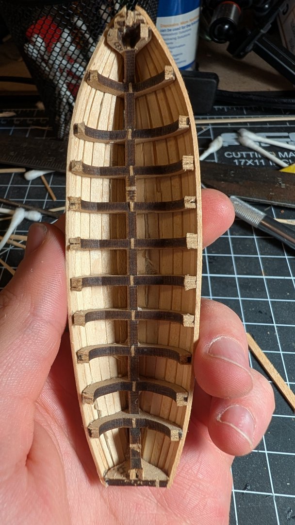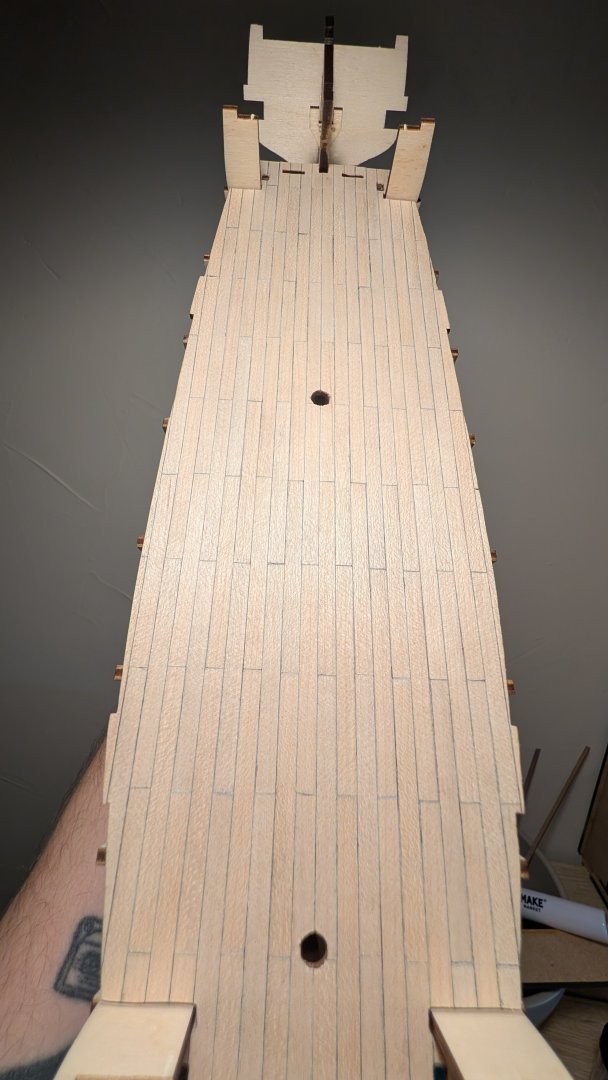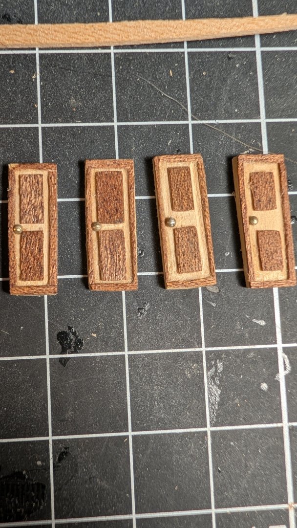 Yo ho all, I wanted to share a quick progress update before leaving for Chicago tomorrow! The planking is done! I have to admit this Beagle model is much smaller than I thought it'd be. Just joking, but the planking on one of the ships boats is done! It's good to get some practice in, It started so well then got a bit messy towards the garboard strake. Lessons learned! As for the ship itself, I did install the deck planks, cutting 60mm strips and gluing individually instead of imitating planks with pencil on full length strips. I rubbed a pencil on the edges before installing each piece for the calking. I liked this at first, but I was misled by the OcCre videos on the butting pattern, also the scale is too big. I have ordered 3mm wide cherry veneer strips to use instead of the 5mm wide kit strips. I will just put these on top of the current planking. I also want to imitate the pattern from the anatomy of a ship book as much as possible for this second layer. Since I can't do much more on the boat until I'm back in town, I wanted to try making the doors as well. Just experimenting for now. I think the two on the left are my favorites so far! Anyway, I'm off to the Windy City, and will hopefully be able to visit the Chicago Maritime Museum while I'm there. Happy holidays and I look forward to seeing your builds progress! Best, James