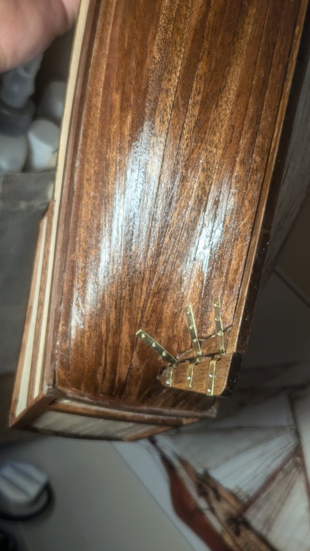 Hello all! I have been trying to get a lay of the land here for a few days before posting and think I am starting to get it (92 % sure I'm posting this in the correct place)! I will post more about my story and why I got into modeling in a new member introduction post, but I wanted to get this build log started for the OcCre Albatros first. I am a good way into the assembly of the hull, I made a few early mistakes that are pretty laughable and ai can't wait to show you. I am brand new to modeling in general, but still feel proud of where it's at, despite the flaws! Fair warning I venture off the instructions at one point to add a different type of wood from my dad's leftover model scraps, he passed last year and this is my way of honoring him, it feels very good (more on this will be posted in the introduction forum). ANYWAY let's get to the ship! I'll post everything I've done so far in this post, then start updating it regularly. Feedback and friends more than welcome, you all seem so nice. Assembly of the hull structure This was relatively straightforward, I will say at the time I wasn't super concerned with achieving a perfect 90° angle, BUT thankfully I used the deck piece to align the frames, and I believe that worked to get the angle. There are some mistakes I made early on in the build that are simply due to me not researching and understanding the process beforehand, I am better now(mostly). Deck planks were also glued with no mishaps woohoo! (Dad's urn in the back, it has Albatross birds engraved in the metal, very poetic) Bulwarks Ok, this is the biggest mistake I've made on this ship, it has caused a lot of other issues but solving them as they come up has been a big part of the fun:) Lot of creativity to be had with mistakes and it feels amazing. Ahhh I snapped a bulwark, and also glued them in place not completely flush with the deck slots. I don't have any pictures here because I wasn't very proud of this blunder. I, being ignorant to modeling in general, saw the bend at the bow and assumed, "Well the instructions say to put it here, so surely the wood will survive the bend". The wood said, "Don't call me Shirley" and broke. This was when I learned I was an idiot and should probably be researching more. Anyway I glued it the best I could and lined it over with planks, and it looked passable for now. I also lined the rest of the deck. First Planking Alright, on to the fun stuff, man did I brute force the planks, giving me tiny nails was a mistake. LUCKILY I did wet the wood, however I did NOT taper the ends and without the nails, glueing these would've been impossible. After seeing other builds here, this looks pretty rough, but I'm not going to lie to you, I'm still proud of it. It's flawed but I did it and took great satisfaction from the work. Will do better next time but THIS time, I'm enjoying the process and learning my lessons. Wood filler and sandpaper will be my salvation. I also lined the outside of the bulwarks and the stern of the ship, mostly covering the break in the port side bulwark but they are both still bent poorly. The one segment of off color wood in this next picture (towards the stern of the bulwark) is a piece from my dad's old kit scraps! It's off the book but still looks great there, a little piece of him. I used Minwax wood filler, and good lord this stuff stinks, got a headache and made my partner appropriately mad for making the whole house smell like chemical for a day. An appropriate penance for imperfection. I served my sentence stoically. Keel After much sanding I planked the stern, again the bulwarks aren't completely flush and the link is imperfect. I decided to put in the keel early to help with aligning the second layer of planks Oooh wouldn't you know it, the bulwark mistake haunting me again, when the keel is flush with the false keel (sorry if these are incorrect terms) it goes up too high on the bow, and covers the premade hole in the bulwarks meant for the foremast. Problem for later. Second planking Alright, this is the real deal, no covering these with a third layer of planks. I was much more careful and even started tapering the ends, though I didn't do it as soon as I should've. Still, ended up looking pretty good and again, I'm happy with it for a first attempt. Perfect? No. But I love it. There's a little piece here, right behind the stern keel, that I put in straight, rather than bending the planks around to meet behind where the rudder will be attached. I have to ask, is this taboo? It made it easier to cover everything. Please let me know! Aaaand my favorite part ... STAIN I used a dark walnut stain after sanding the planks with a fine sandpaper. Dang doesn't that wood look amazing? I know I should focus on the flaws but agh I can't help but admire it. It feels so good to just stare at something YOU CREATED and look on it with admiration, I'm sure many of you enjoy this feeling with greater works. This hobby is so fun. I regret not getting into it sooner to discuss it with my dad, or to build one with him. He'd be proud of this one I think, he always was generous with his pride. Rubbing Strakes and Lining Anyway, on to some finer details. I invested in some proper clamps, I only had one good one before now, here are some fun (delusional) clamping setups I had to do: Laugh all you want they worked! Rubbing Strakes and rail (stained)- And here is where I currently am! Rudder is next, I'm looking forward to it. Sorry for the extra long post but there was a lot to get through! I will post more updates as I continue work on this and I'm looking forward to hearing from you! Again advice and friends are welcome. Best, James