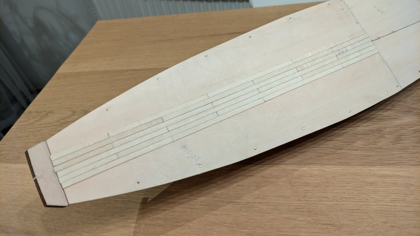 It has been quiet at the shipyard for a while.... Because there was work to do in the maintenance of the house. But today I have laid my first deck planks. I was wondering whether to do the calking or not, but I have chosen to use a pencil to add some little black on the sides of the planks before gluing them on the deck. The next step will be my first bending of planks for the outer planks. For my first modelship I am quite pleased with the result. Maybe I have to do one or two wipes with sandpaper. I am wondering one thing. My "biggest fear" is getting stains of the graphite when sanding the deck planks. How big will the risk be for that? Any tips to avoid that? One thing I can think of is sanding in the length direction of the planks.