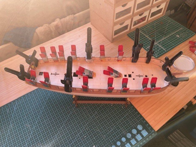 Welcome to my build log for HM Adder by Vanguard Models. This is my third ship and I have already started it. I apologise for presenting a build log that will not cover the start of construction. Before I go any further, I must extend my gratitude to @Glenn-UK, @DB789 and @ECK for their fantastic build logs which have helped me with my build so far. Here is Adder where she currently stands. Any and all advice is welcome. Bulwark patterns have been glued in place with watered down PVA (Occre PVA). After 24 hours, I removed all bulkhead tabs and sanded down using 240 grit sand paper. Using a tip from @Glenn-UK build log. I made a template of Adders deck to check the fit of my engraved deck. After adjusting the engraved deck, I then glued (PVA) and clamped it in place. Here ends my first build log post. Thank your for taking the time to read it. Regards Geordie