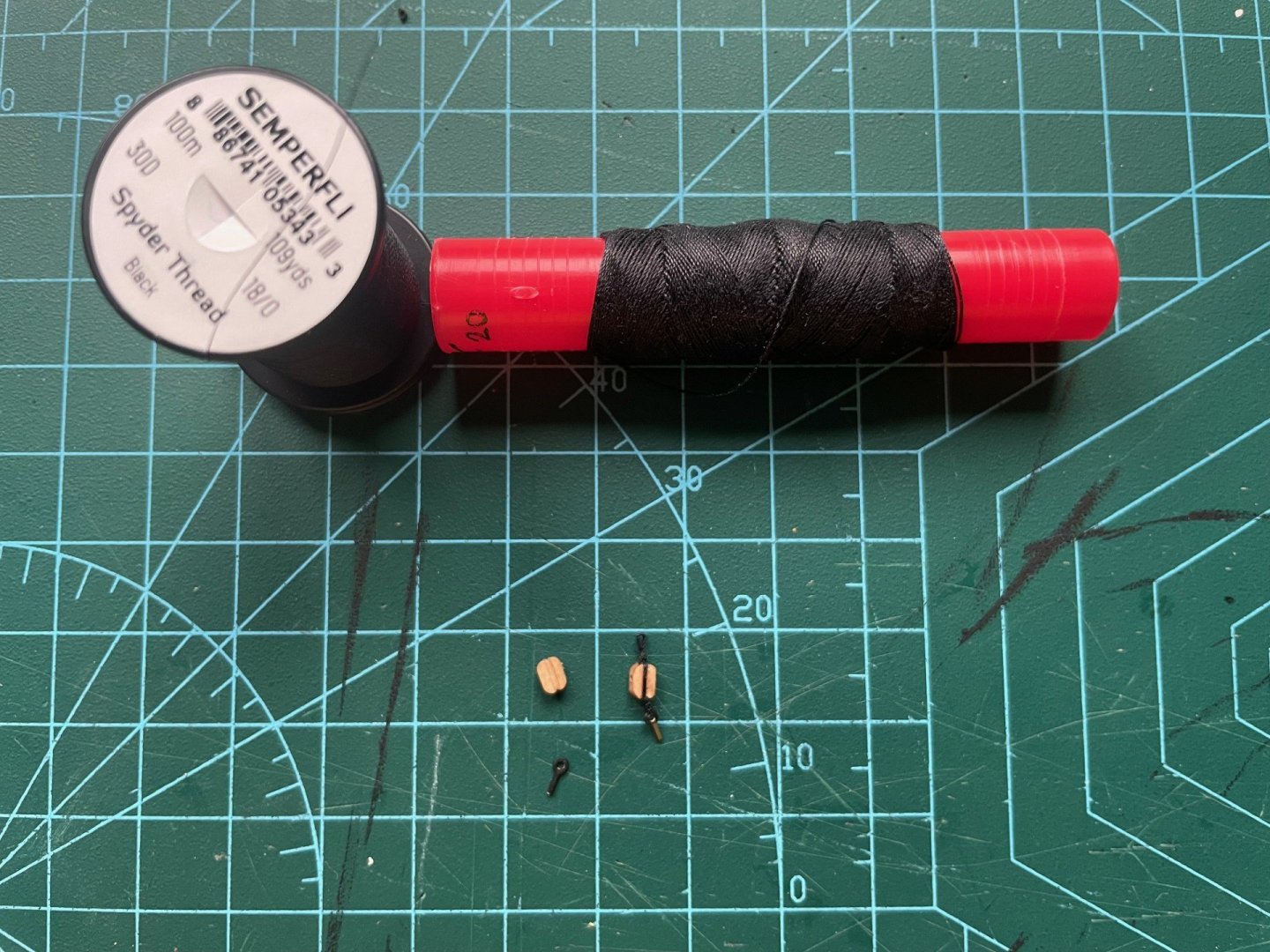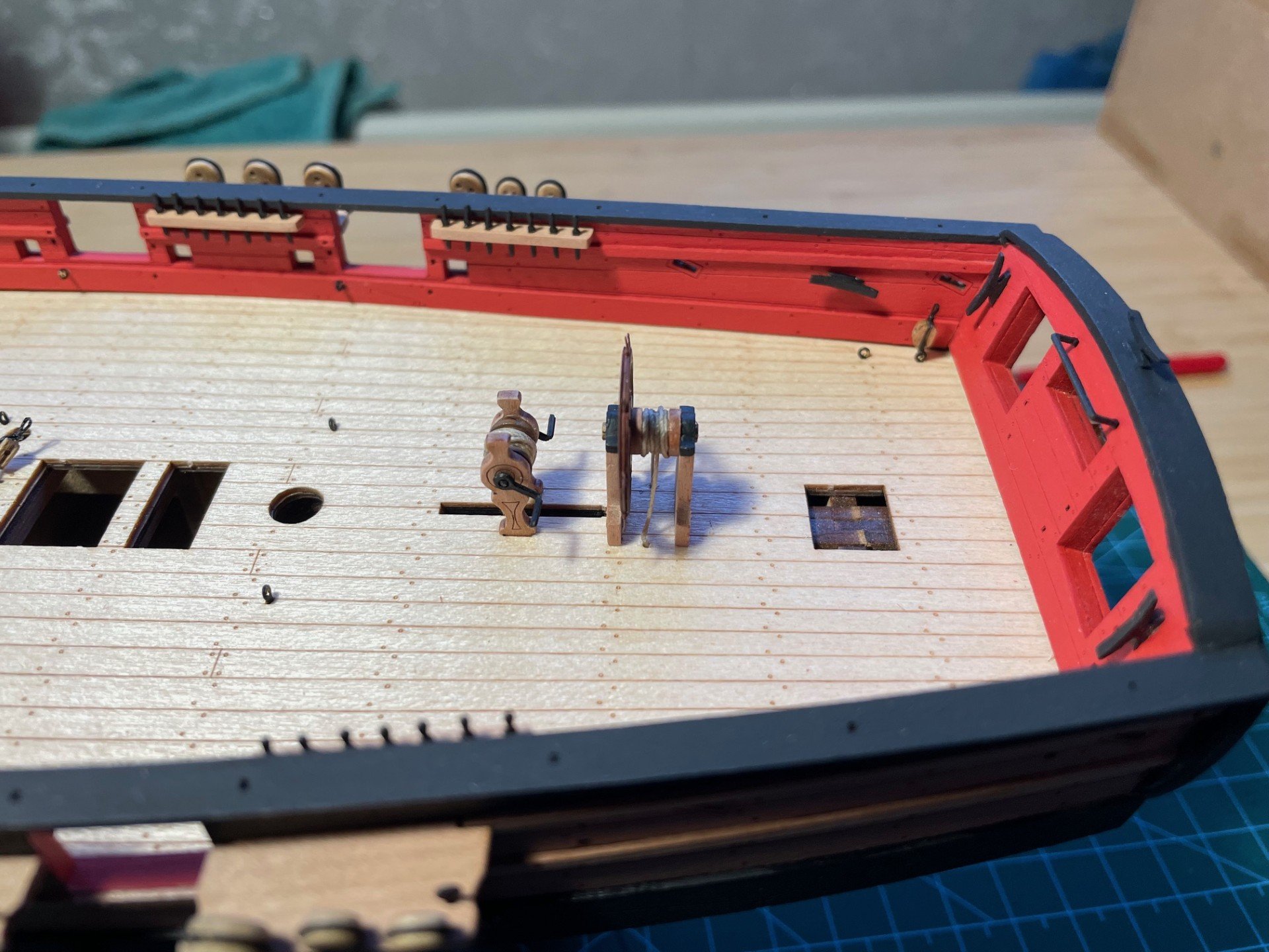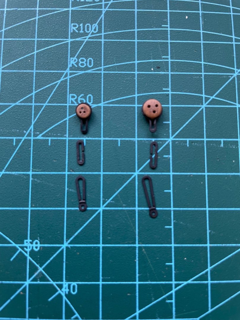 Build Log Seven - Deadeyes,Strops,Blocks,Ship Wheel and Drop Keel Winches. Happy New Year everyone! I hope it is a good one for you and yours. Below is the bit or work my limited time in the workshop has allowed me to get done. One thing that caught me out on Sherbourne was the fact I had not looked ahead at the rigging plan. Specifically if blocks needed Beckets attached ahead of time. This led to a few choice words as i tried to rig these blocks after they had been secured to the deck. This time I made sure that was not the case. I created a small loop at the top of the block for the Becket, then I sized it with Semperfli Fly fishing thread. I then secured it with a small dab of PVA glue. Once this was dry, I secured the block to the eyebolt and attached them to the deck. I then attached the 5mm and 3mm Deadeyes to the strops. The photo etch was then touched up after some paint chipping. In hindsight I should have waited until I had attached the Deadeyes to the model. The Deadeyes were then attached to the channels. I have not secured the pins as I will wait until I am happy that they mirror the lay of the Shrouds. I then made up two Drop Keel Winches. The Drop Keel in place. I will have to touch up the Drop Keel and Keel once I don't have to handle the model as much. The Ship Wheel was then assembled. Using a 0.10 drill piece I carefully drilled two holes for the thread to pass through the deck. Beside the Ship Wheel is one of the finished Drop Keel Winches. Thank you for taking the time to read my build log. Regards