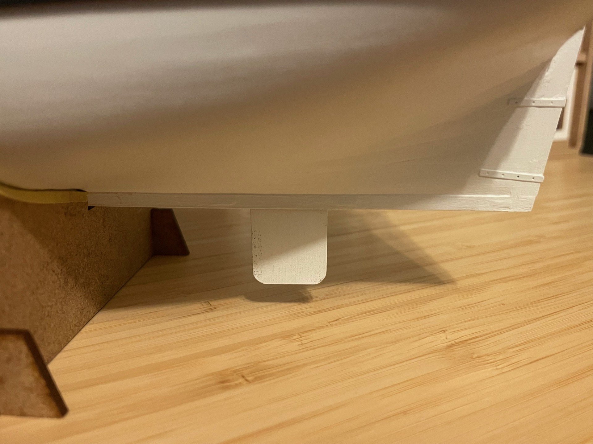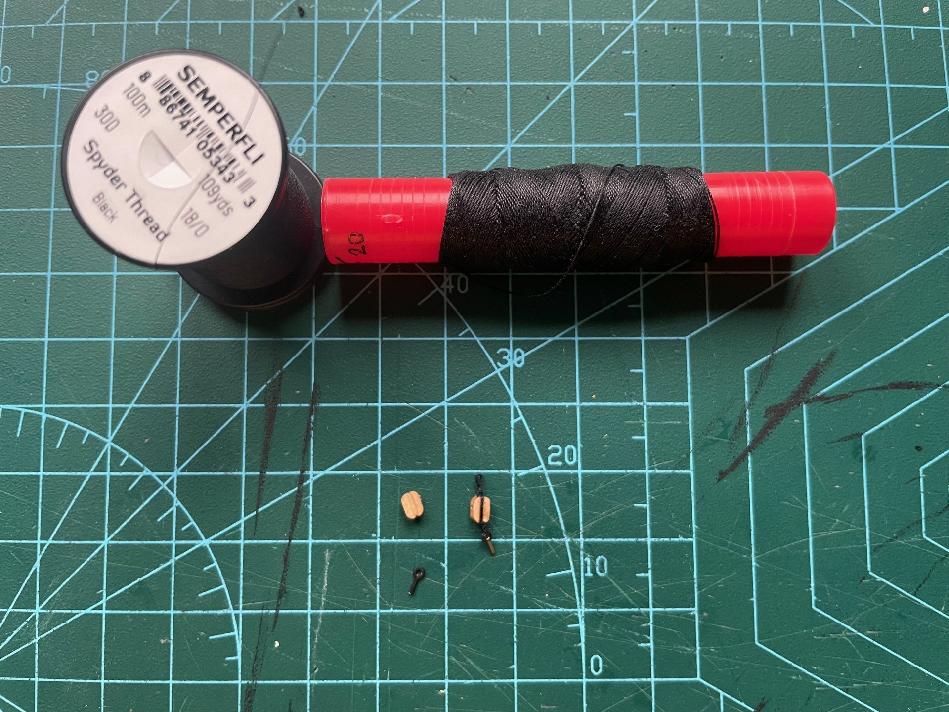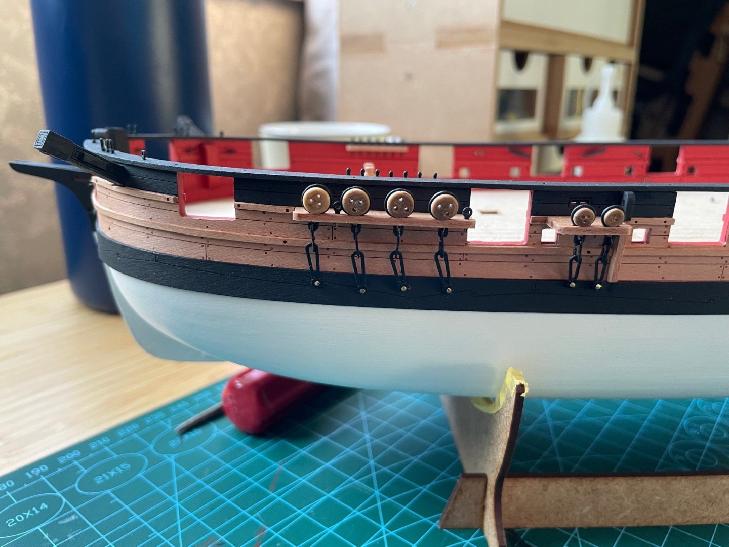 Build Log Seven - Deadeyes,Strops,Blocks,Ship Wheel and Drop Keel Winches. Happy New Year everyone! I hope it is a good one for you and yours. Below is the bit or work my limited time in the workshop has allowed me to get done. One thing that caught me out on Sherbourne was the fact I had not looked ahead at the rigging plan. Specifically if blocks needed Beckets attached ahead of time. This led to a few choice words as i tried to rig these blocks after they had been secured to the deck. This time I made sure that was not the case. I created a small loop at the top of the block for the Becket, then I sized it with Semperfli Fly fishing thread. I then secured it with a small dab of PVA glue. Once this was dry, I secured the block to the eyebolt and attached them to the deck. I then attached the 5mm and 3mm Deadeyes to the strops. The photo etch was then touched up after some paint chipping. In hindsight I should have waited until I had attached the Deadeyes to the model. The Deadeyes were then attached to the channels. I have not secured the pins as I will wait until I am happy that they mirror the lay of the Shrouds. I then made up two Drop Keel Winches. The Drop Keel in place. I will have to touch up the Drop Keel and Keel once I don't have to handle the model as much. The Ship Wheel was then assembled. Using a 0.10 drill piece I carefully drilled two holes for the thread to pass through the deck. Beside the Ship Wheel is one of the finished Drop Keel Winches. Thank you for taking the time to read my build log. Regards