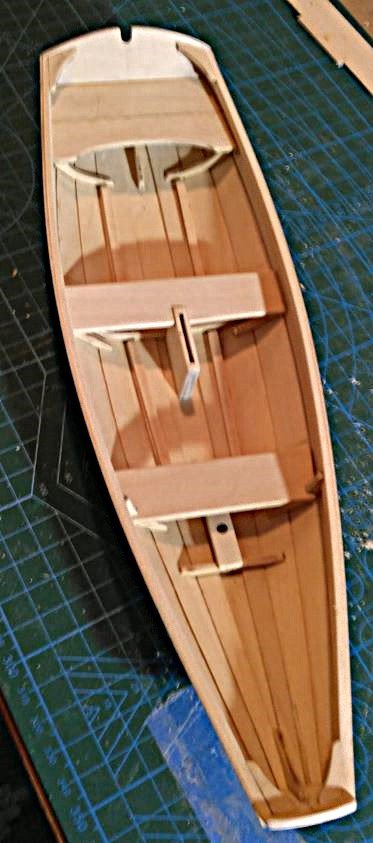 Currently the floor cleats are drying after a soak in boiling water, but I am pretty sure I will have to rebend them as bending them over the hull isn't working well, due to their short length. I think I will soak them then run them thru one of my new plank benders, aka my wife's hair straightener. Other progress was finishing fitting the seat supports and thwarts, and stern sheets. I glued a cleat to the underside of the two stern pieces, and got the dagger board thwart fitting quite well. The fore thwart required so much trimming that I made a template from light card stock. Even after using that to trim the thwart to length I found I had to aggressively relieve the underside of the notches for the thwart to nestle into place correctly. This is where I am now, with the thwarts temporarily in place. Next steps are installing the floor cleats and test fitting the floor boards, fitting and gluing the rub rails, and trimming/shaping the transoms. I did have to break out the isopropyl to detach the starboard bow transom knee as the angle was off and did not line up with the port knee. This got a bit fiddly and I think I will need some filler after the sanding is complete. But having knock knees on the bow looked dreadful. This outcome is acceptable.