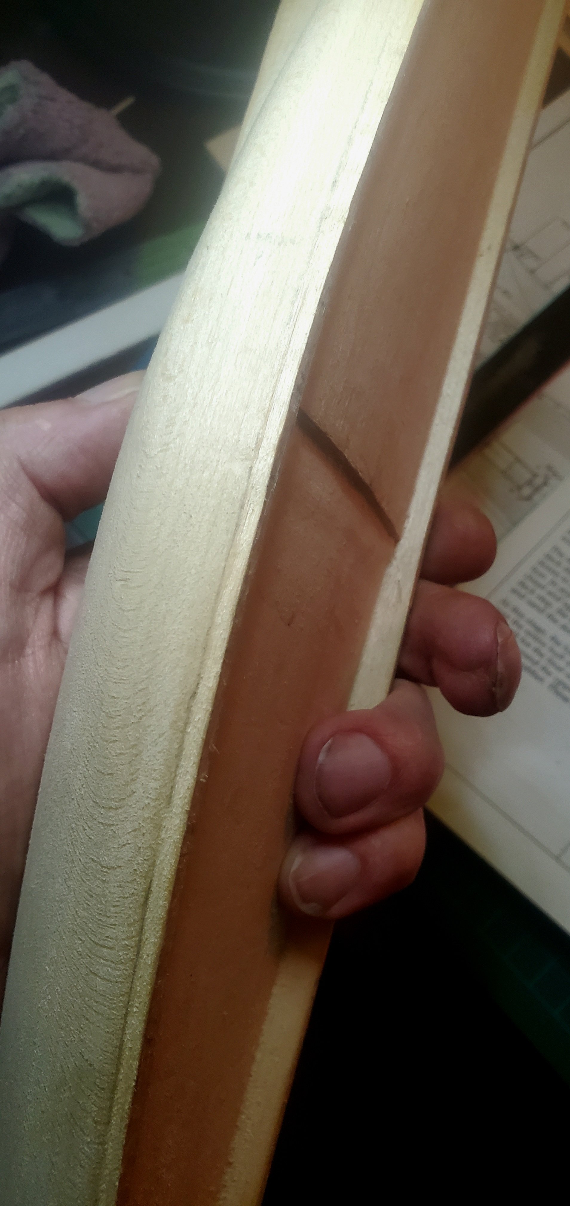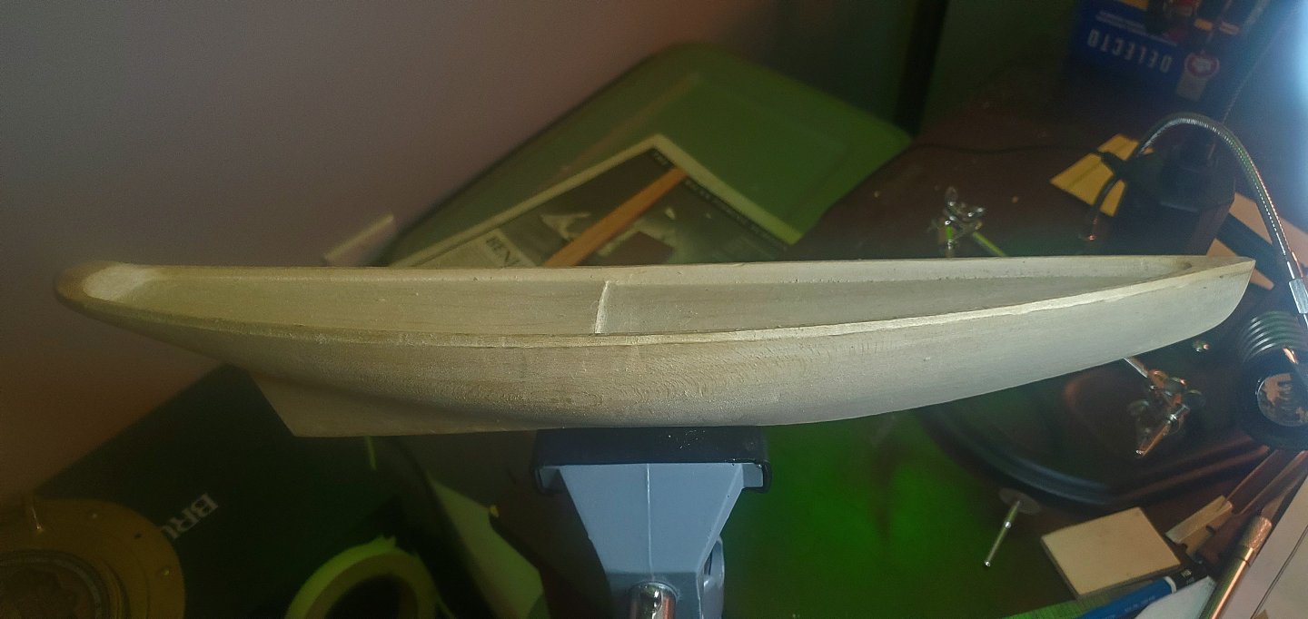 With her being a solid hull it requires a lot of carving and sanding. Seems to take forever to get the templates to fit. The step at the waist is challenging. Between getting the bulwarks straight inside to allow the Timberheads to be straight and the small size of the waist. Found it a little tough. Bulwark after all the sanding and shaping is supposed to be 1/32. Finished to allow the proper size main rail. I persevered and got it pretty close. Hull is ready for a final sanding.