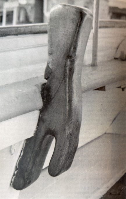 Cleats and Bollards In addition to belaying pins, also various types of cleats are distributed around the ship. Their type and location had to be reconstructed from various sources, such as models and early photographs. On paintings of such vessels, they are generally not visible. The first type concerns very large cleats that stretch across two bulwark stanchions. They are used for belaying heavy ropes, such as the main sheet. If they have a fairlead in middle, they also serve as mooring cleats. Mooring cleat (old photograph from unidentified book) The photograph was imported into my 2D CAD program (EazyDraw) and the outline traced and scaled to size. This served as the basis for the laser-cutting file. Material for two cleats was cut. The cleats are laminated from four layers of Canson-paper (if I had a more powerful laser, of course, they could have been cut from some 0.6 mm thick material in one go). The resulting part was finally filed to shape. The fairlead is a copper rivet. The completed mooring cleats I am not sure, whether the pipe of the fairlead is in some way supported in the space between the cleat and the bulwark planking. I have not been able to find any photographs that show this detail. However, for practical reason I inserted a square piece of polystyrene with an appropriate hole drilled through. This allows me to insert a shortened hollow rivet from each side and hide the seam conveniently. As the cleats will be represented in varnished wood, as can be seen on the above photograph and various models, it allows me to locate the cleats after all the painting is done. Fairleads from the outside Looking at the close-up photographs, I think the fairleads should have been turned a bit smaller on the outside diameter, but I am going to leave them like this. I also realised that my planking looks pretty awful and needs to be worked over … There are also several heavy cleats needed to belay for instance the backstays or the ropes used to secure the anchors. They are of a type that seems to have fallen out of modern use, namely half-cleats combined with a bollard Combination of bollard and half-cleat (old photograph from unidentified book) The shape was developed in the 2D CAD program and measurements for the machining derived from this. The rough shape was milled out of some 1 mm x 3 mm polystyrene profile. In fact the enveloppe is only 1 x 1.5 mm, but the additional material is needed initially to be able to hold the part in the vice. Milling the rough shape of the bollard/half-cleat combination Milling the rough shape of the bollard/half-cleat combination – close-up The final shape was given with the aid of various metal- and diamond-files and scraping to remove the fuzz from filing. I am using for this a ‘French’ type of pin-vise, on which I replaced the brass jaws with ones made from wood. One should note that, as they will attach to bulwark stanchions, their back has to be slightly curved. Filing a cleat to shape Roughed-out cleat (top) and finished cleat (bottom) To be continued …