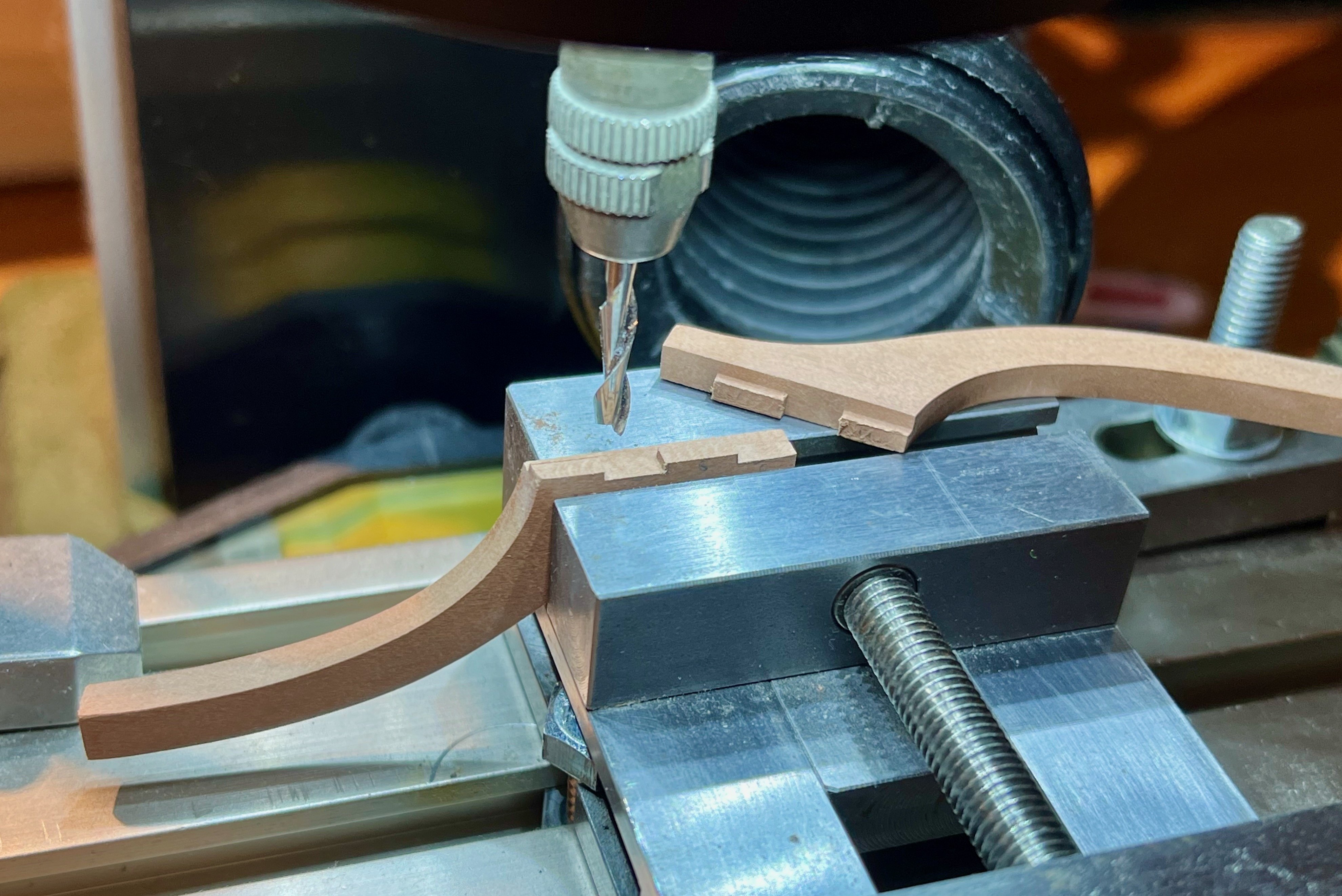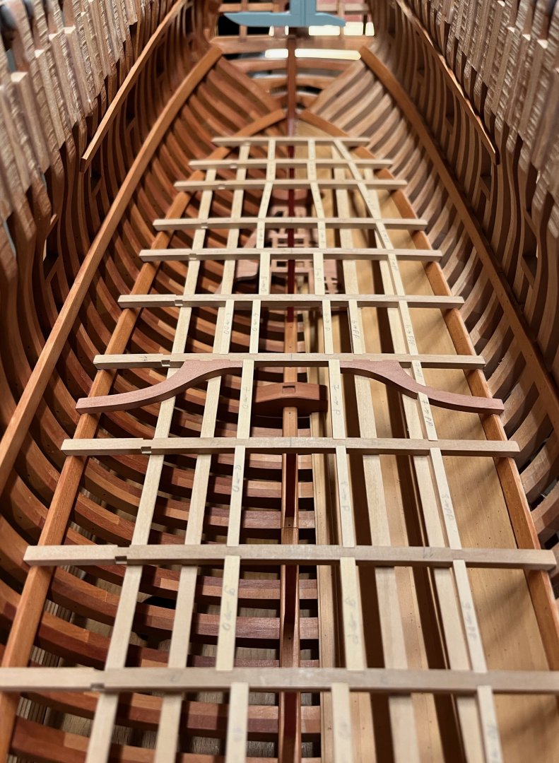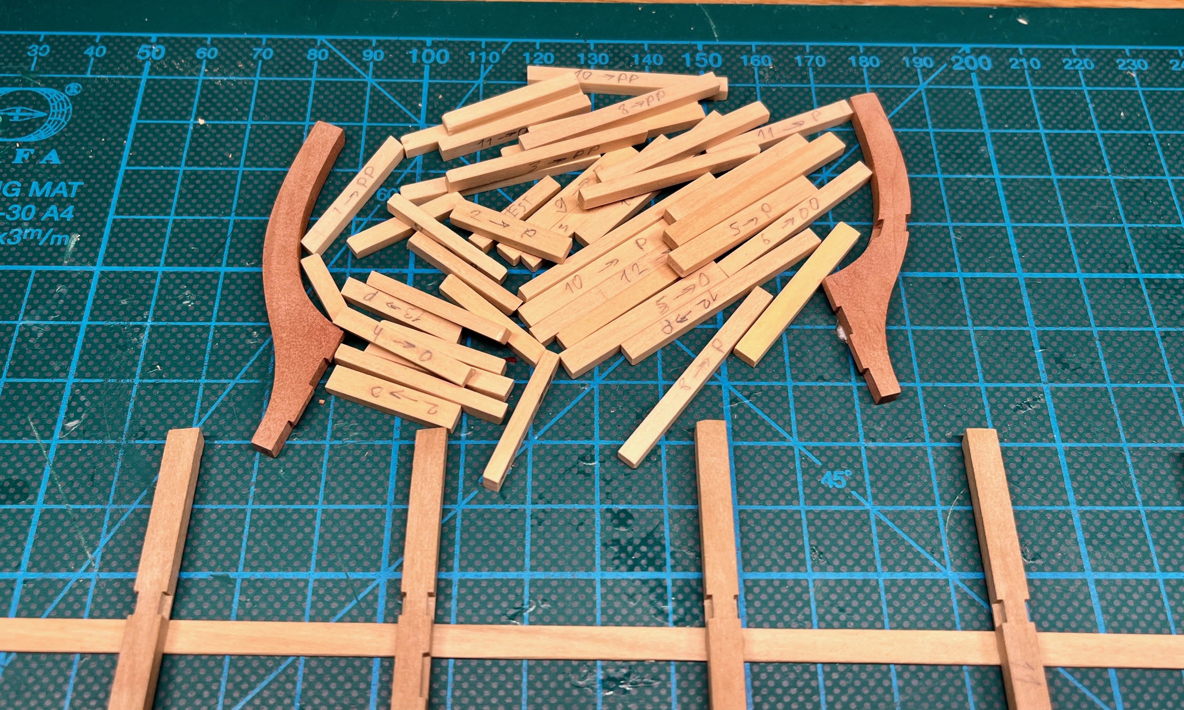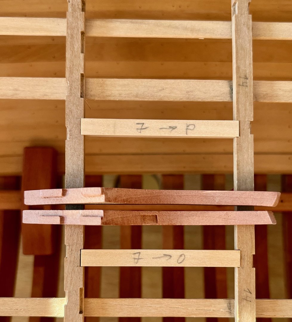 Beam arms Beautiful piece of the deck structure, was waiting for this moment for a while! Tried to use my fancy Vallorbe files, but the easiest way to shape these was a coarse sanding stick followed by a quick pass with finer grit. Then scraping to flatten the edge - and you get a fine finish with very little effort. Just need to be mindful of grain direction to not scrape against the grain Joints are milled, of course. That kind of precision work is where a mill really shines! Speaking of milling - I added a crudely made light into my Proxxon MF70. It is based on strange 3d model that I found online, trimmed off all the strange bits and glued in a cheap USB-powered LED strip, cut into short pieces and soldered with dodgy cuts of solid wire. It works, excellent value for money! Can definitely recommend to spend time on making your own, one of these "I should have done that sooner" moments. There is nothing off the shelf that you can buy for MF70, only some dim LED ring on ebay for way too much money. In other LED updates - got a lamp similar to the one recommended by Chuck (amazon/aliexpress, 50 USD, likely same manufacturer, but smaller size). It is awesome! Angled "ears" allow you to illuminate the piece from multiple angles, which is very handy when carving notches. The light quality (colours, flickering) is very good in my unscientific tests, and makes for a good photo light. The adjustable arm is solid (joints not too tight, not too loose, very elegant), and it is not an eyesore. A lot of adjustability and tilting angles. More than enough brightness, and the adjustable colour temperature is handy. The only downside is that the touch controls are facing forward, so I touch them by accident way too often The arms are slightly curved to follow the deck shape. I over-curved them at first, but luckily had enough margin to smoothen them with some battens. The resulting curve is very gentle: And here they finally glued in. Actually the first part of the deck that is now permanently glued in place! I am avoiding the final glueup as much as possible, feels much better when everything is dry fit Now I have a pile of carlings ready for installation And here they are all in place! Notches on the exposed side are left empty to avoid obstructing the view. I might put some carlings into them later. They needed more care than the non-empty notches, since you want all notch surfaces to look smooth and pretty, no chance to cover them with a carling later on. So I was cutting a smaller notch and then make a few final cuts once it is done, cutting off any tear-out. That concludes the carling phase, next in line are the lodging/hanging knees and ledges!