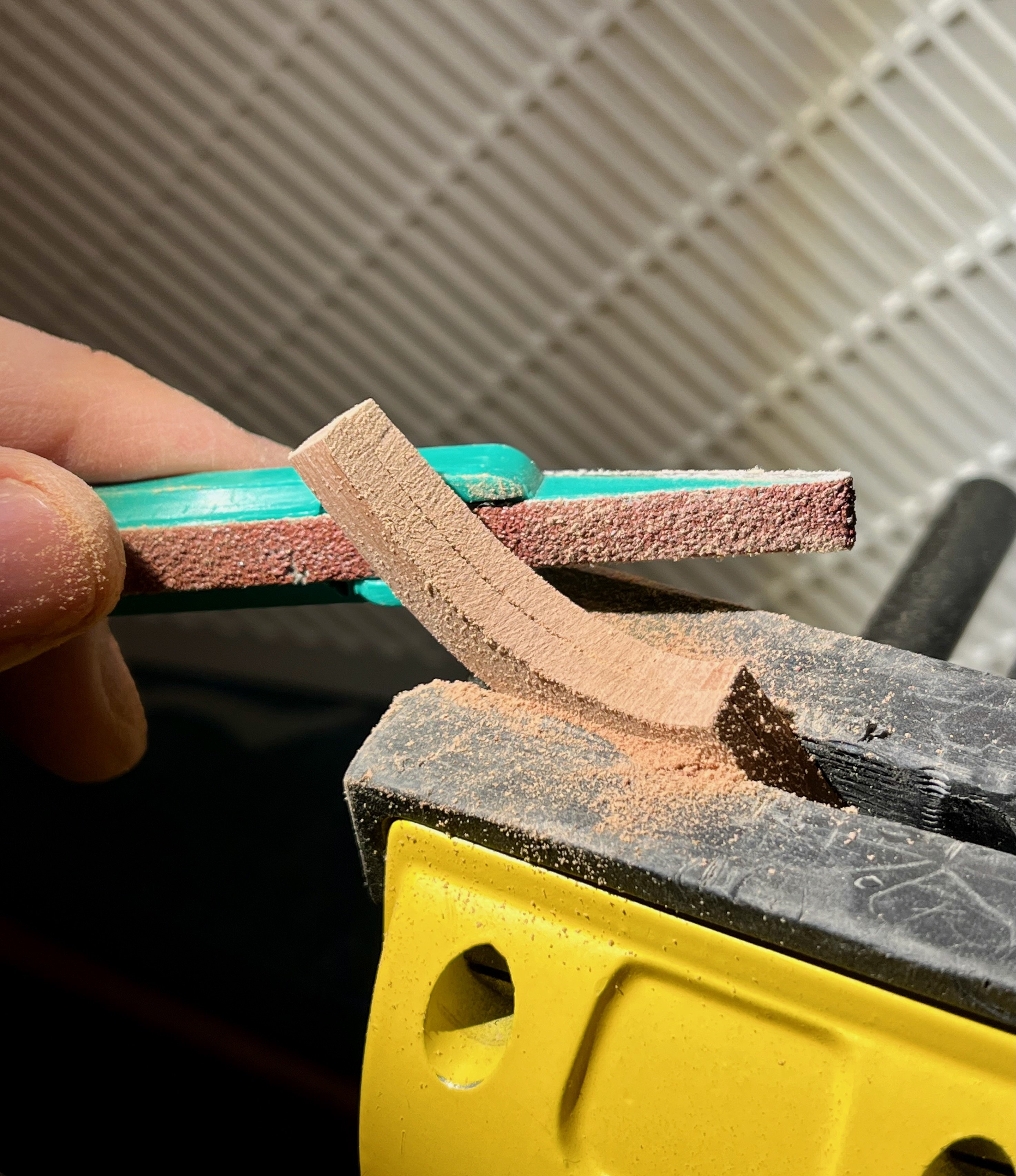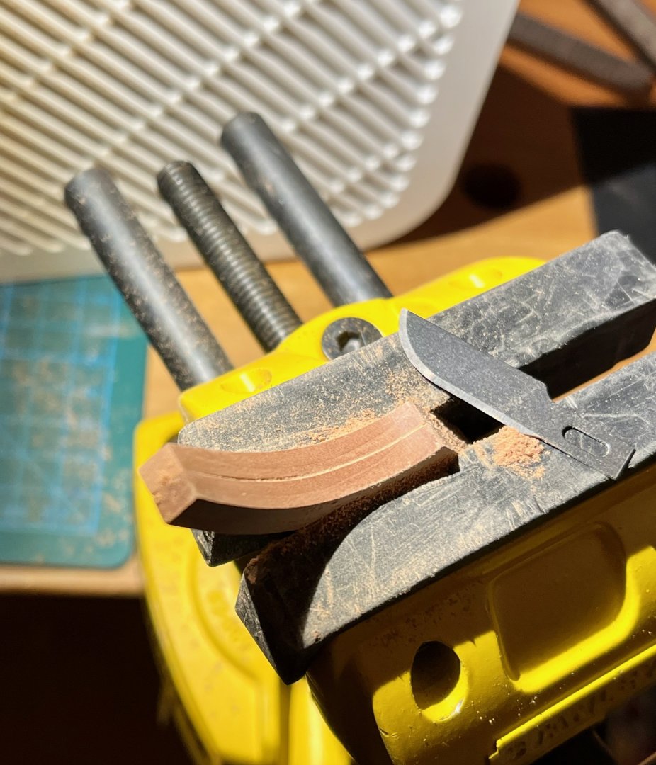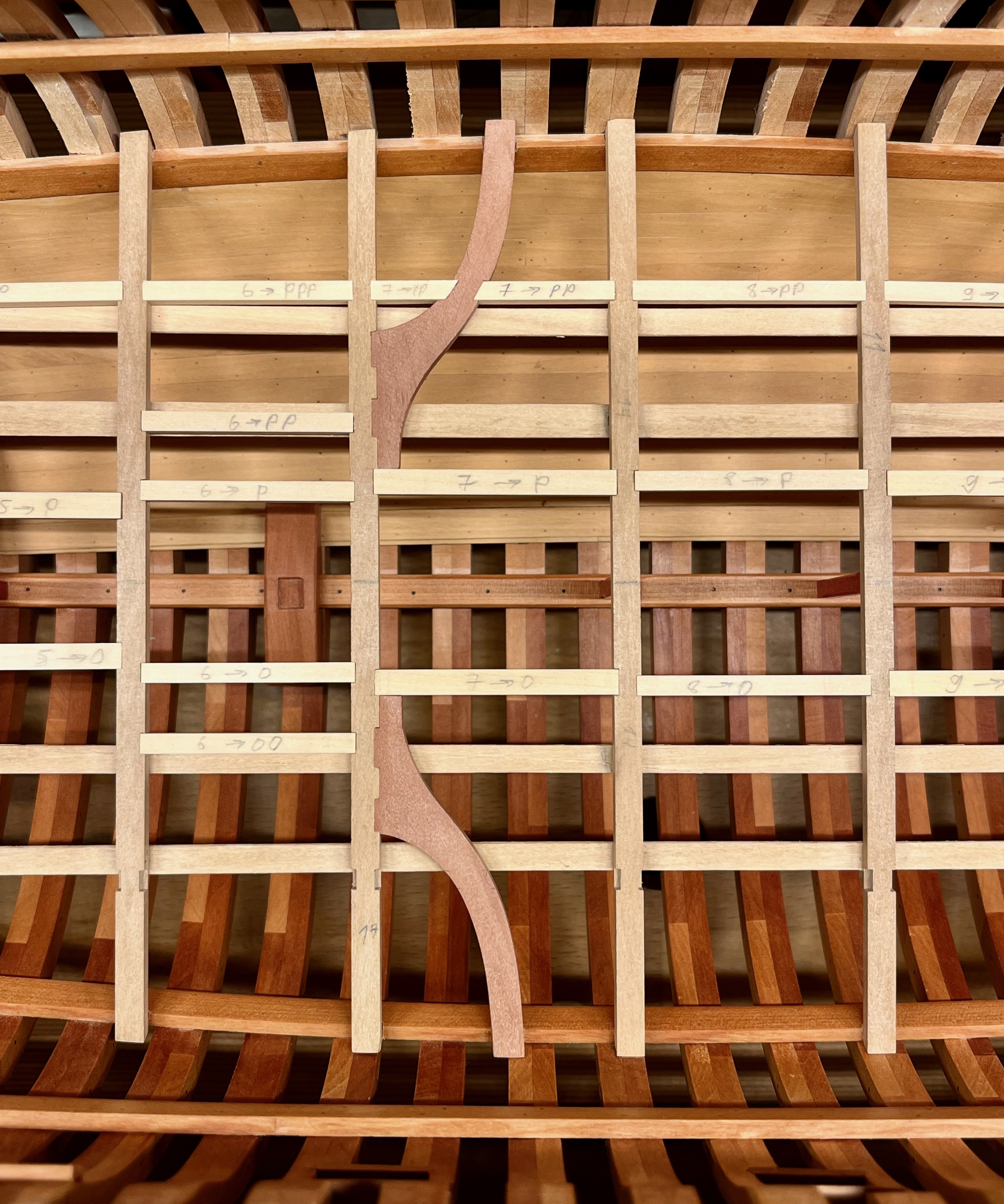 Beam arms Beautiful piece of the deck structure, was waiting for this moment for a while! Tried to use my fancy Vallorbe files, but the easiest way to shape these was a coarse sanding stick followed by a quick pass with finer grit. Then scraping to flatten the edge - and you get a fine finish with very little effort. Just need to be mindful of grain direction to not scrape against the grain Joints are milled, of course. That kind of precision work is where a mill really shines! Speaking of milling - I added a crudely made light into my Proxxon MF70. It is based on strange 3d model that I found online, trimmed off all the strange bits and glued in a cheap USB-powered LED strip, cut into short pieces and soldered with dodgy cuts of solid wire. It works, excellent value for money! Can definitely recommend to spend time on making your own, one of these "I should have done that sooner" moments. There is nothing off the shelf that you can buy for MF70, only some dim LED ring on ebay for way too much money. In other LED updates - got a lamp similar to the one recommended by Chuck (amazon/aliexpress, 50 USD, likely same manufacturer, but smaller size). It is awesome! Angled "ears" allow you to illuminate the piece from multiple angles, which is very handy when carving notches. The light quality (colours, flickering) is very good in my unscientific tests, and makes for a good photo light. The adjustable arm is solid (joints not too tight, not too loose, very elegant), and it is not an eyesore. A lot of adjustability and tilting angles. More than enough brightness, and the adjustable colour temperature is handy. The only downside is that the touch controls are facing forward, so I touch them by accident way too often The arms are slightly curved to follow the deck shape. I over-curved them at first, but luckily had enough margin to smoothen them with some battens. The resulting curve is very gentle: And here they finally glued in. Actually the first part of the deck that is now permanently glued in place! I am avoiding the final glueup as much as possible, feels much better when everything is dry fit Now I have a pile of carlings ready for installation And here they are all in place! Notches on the exposed side are left empty to avoid obstructing the view. I might put some carlings into them later. They needed more care than the non-empty notches, since you want all notch surfaces to look smooth and pretty, no chance to cover them with a carling later on. So I was cutting a smaller notch and then make a few final cuts once it is done, cutting off any tear-out. That concludes the carling phase, next in line are the lodging/hanging knees and ledges!