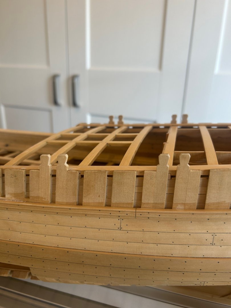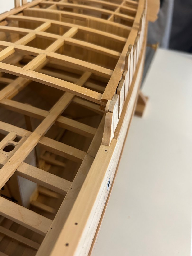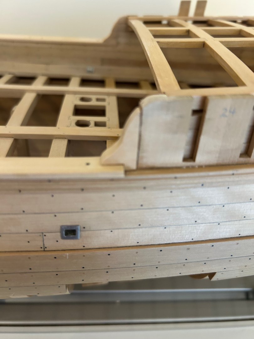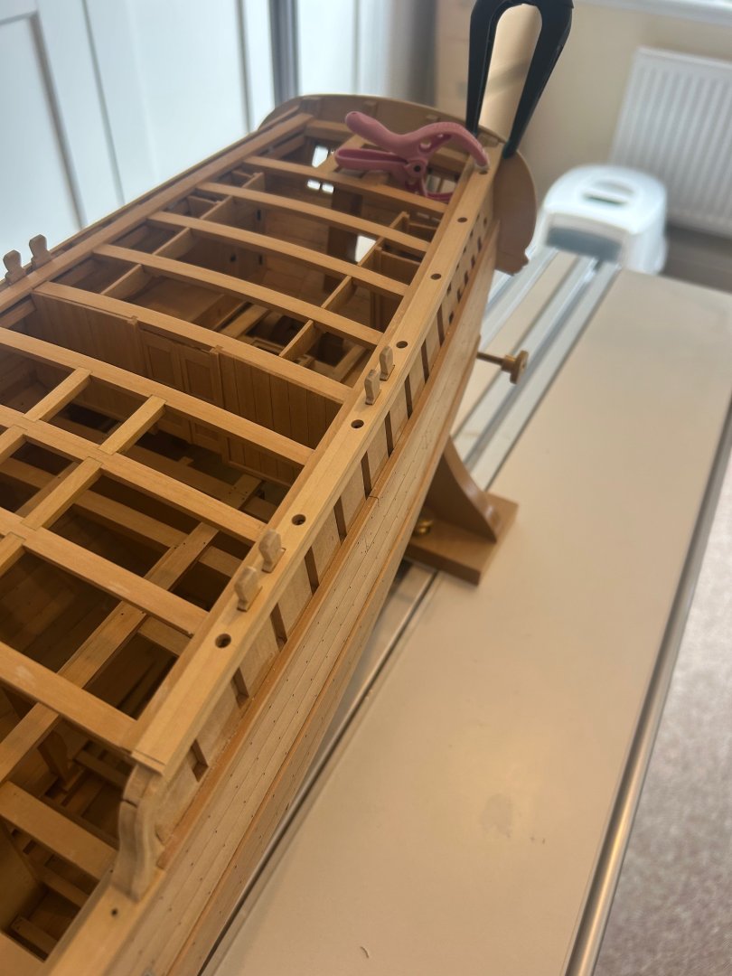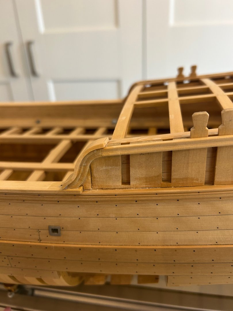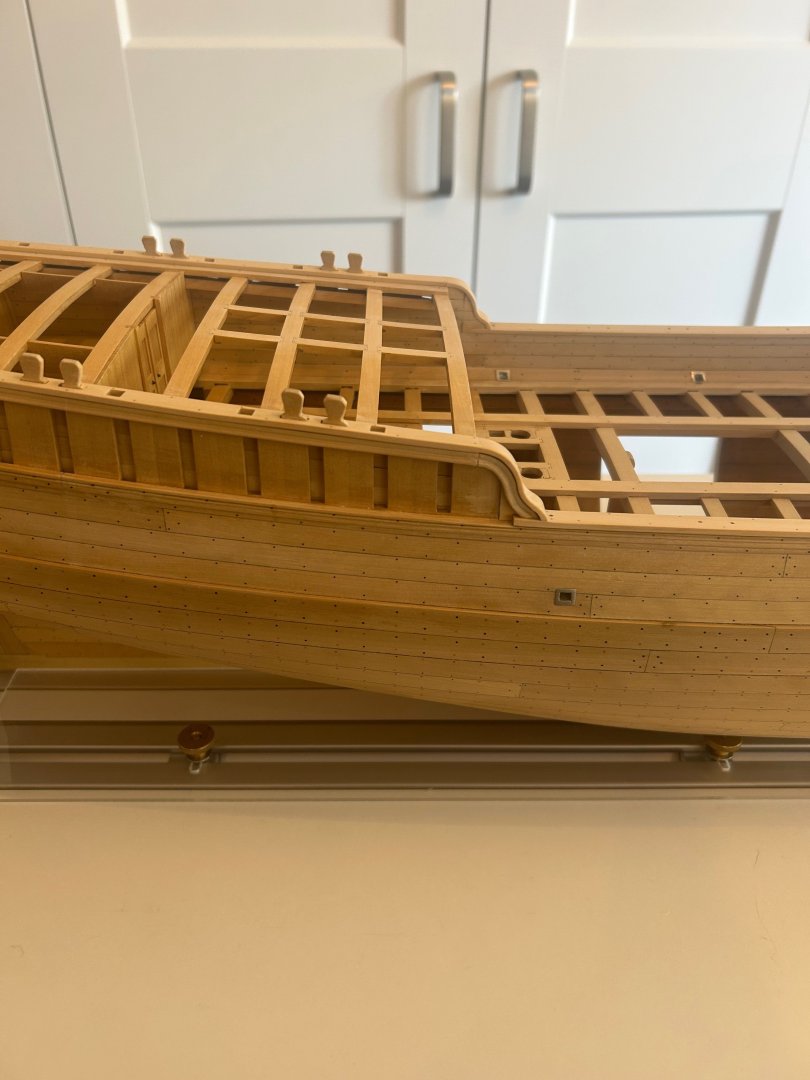 Some more work completed this week - I've been getting on with the planking between the mouldings which will complete the stern planking. I also caught up with quite a bit of nailing that required finishing The ship really is starting to look solid now Finally I made the decorative moulding for the first beam on the quarterdeck I want to make the gratings next but I need to wait for Gerard to confirm whether I have read the drawings correctly or not. It shouldn't take long for a reply and then I can make something I've not made before. Mark