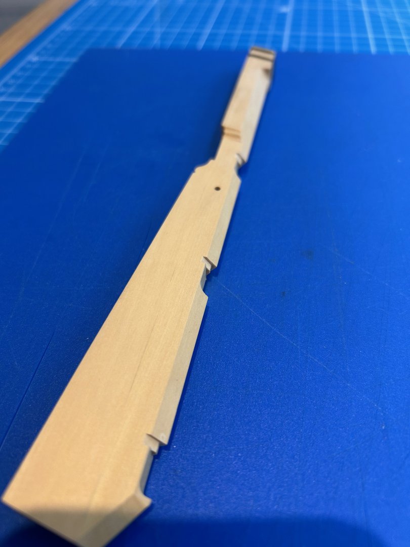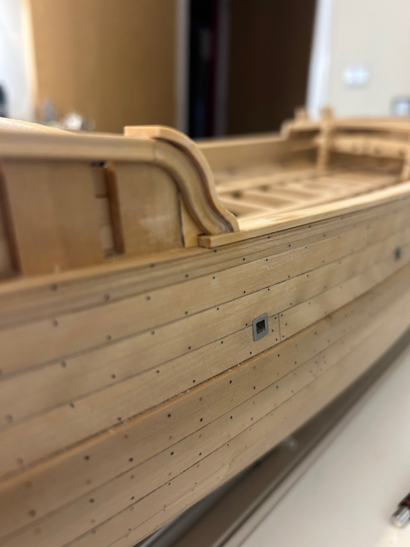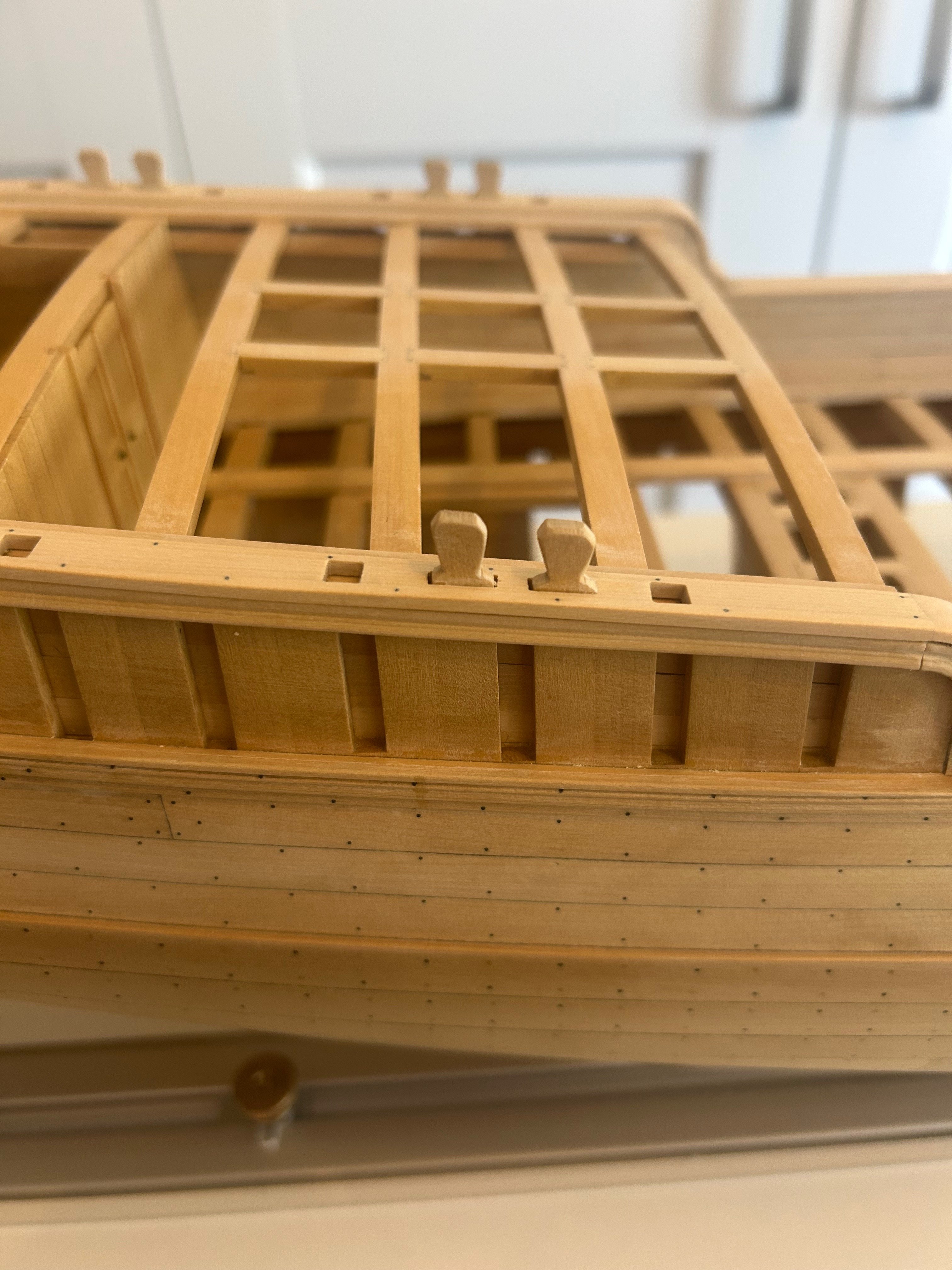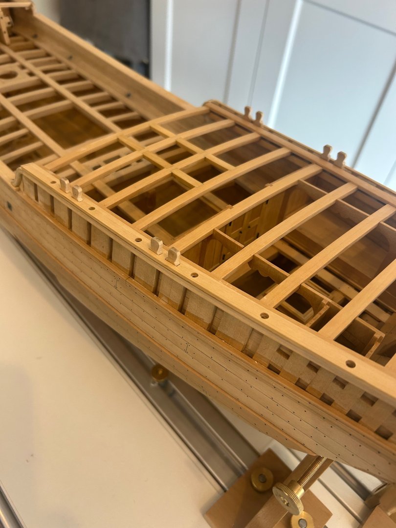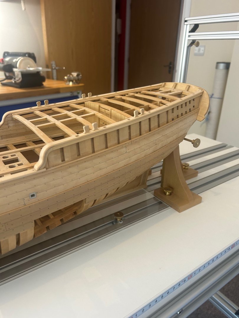 Some more work completed this week - I've been getting on with the planking between the mouldings which will complete the stern planking. I also caught up with quite a bit of nailing that required finishing The ship really is starting to look solid now Finally I made the decorative moulding for the first beam on the quarterdeck I want to make the gratings next but I need to wait for Gerard to confirm whether I have read the drawings correctly or not. It shouldn't take long for a reply and then I can make something I've not made before. Mark