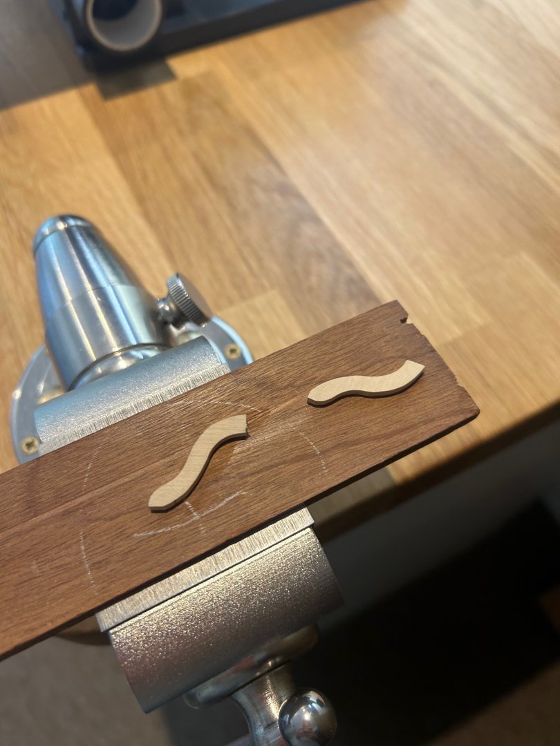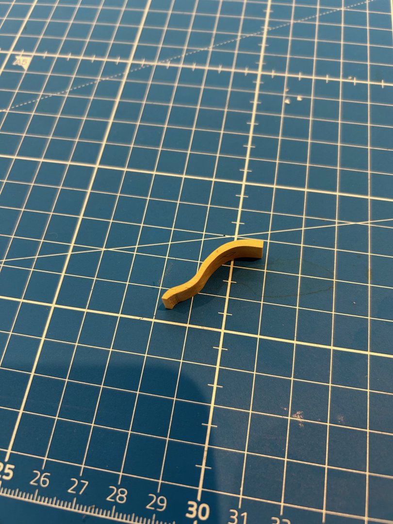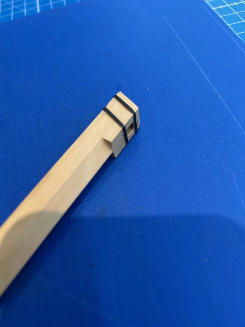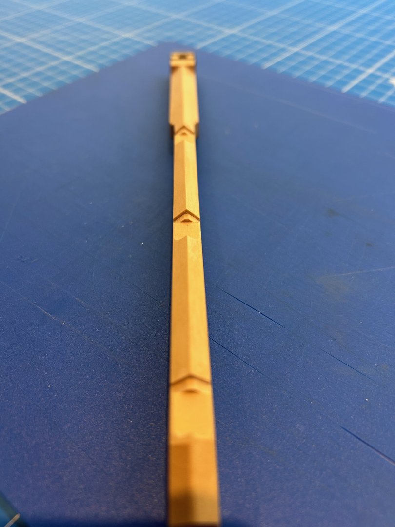 So having discovered that I didn't cut the reliefs for the pintles I thought I'd give it a go. This would have been so much easier when the piece was still square. I got a good result and it needed to be done. The pintles are made out of 1mm x 2.3mm brass so they need to sit flat as trying to force them into shape just will not work and damage the rudder. You can see below the much better beds for them I also have made the iron bands that reinforce the rudder around the tiller hole Thanks for all of the comments and likes they really are inspiring. I'm off to Malta for a week today so I'll catch up with you all when I get back Mark