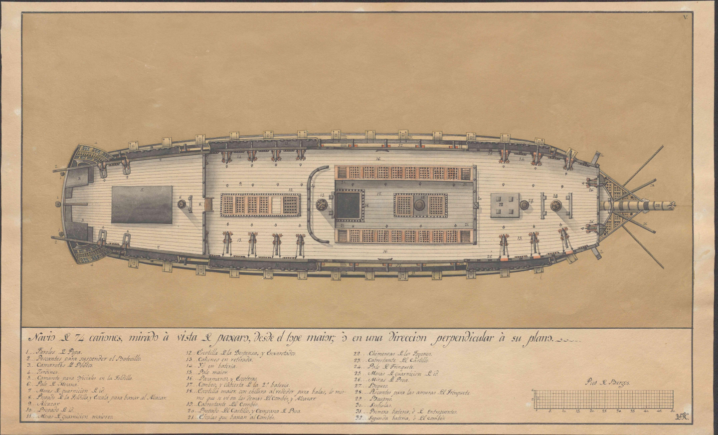 Actually, curved deck planks were not uncommon, especially in the days before powered circular saw mills. Many contemporary models show such planking (nibbed planks only came into fashion the 19th century) as well as deck plans such as are seen in Steel and Rees. A quick web search shows a Spanish example from 1794: However, these planks were most likely naturally curved from the trunks or branches from which they were cut, not edge set. This was a less wasteful method of timber conversion. -