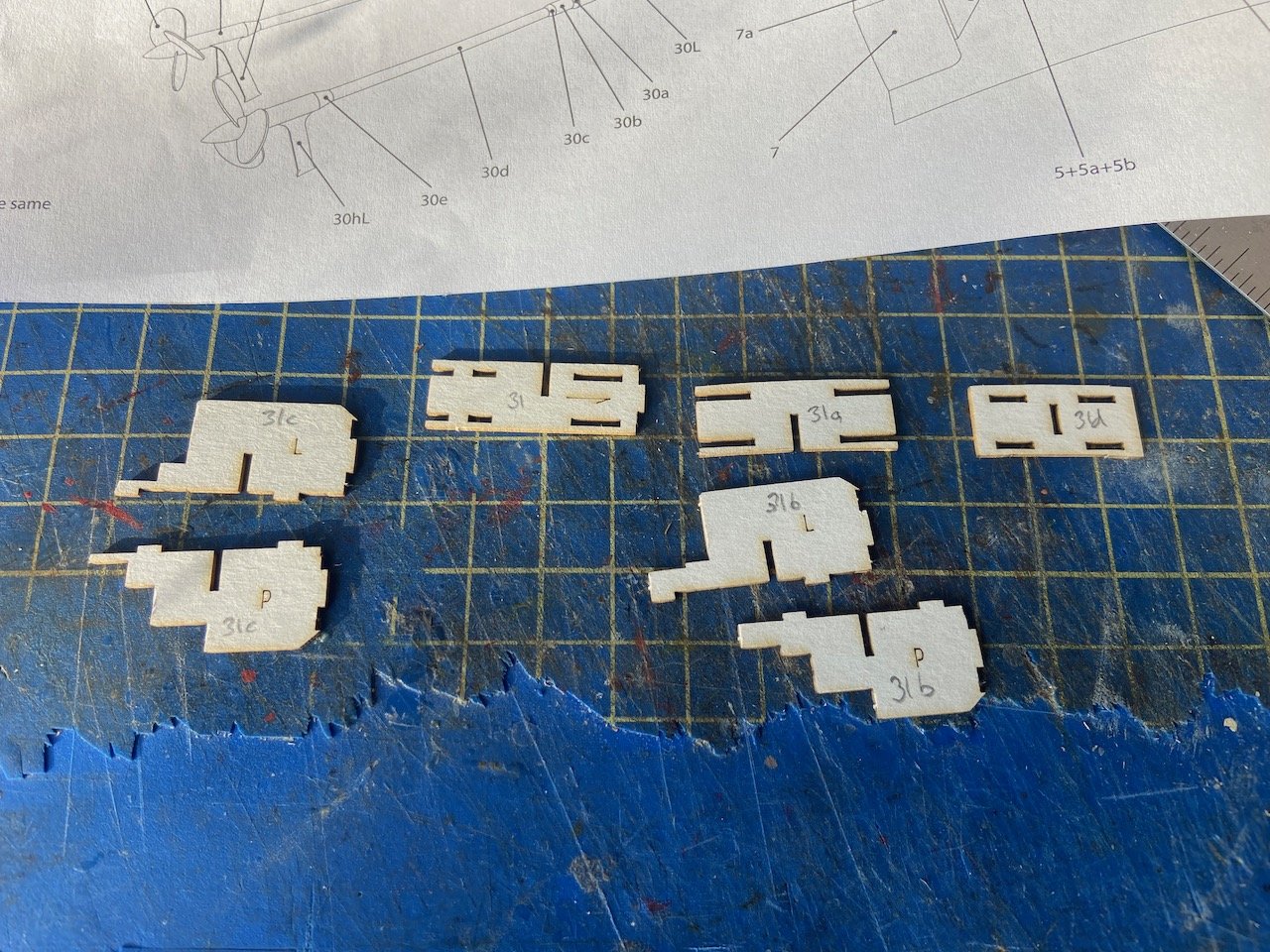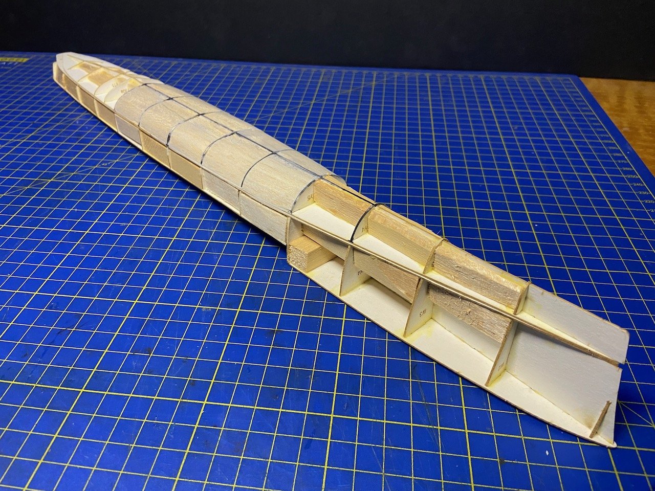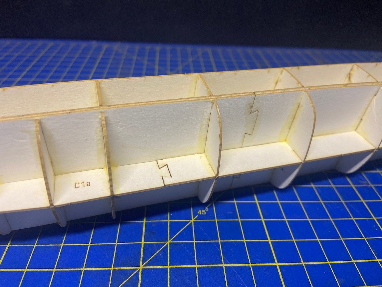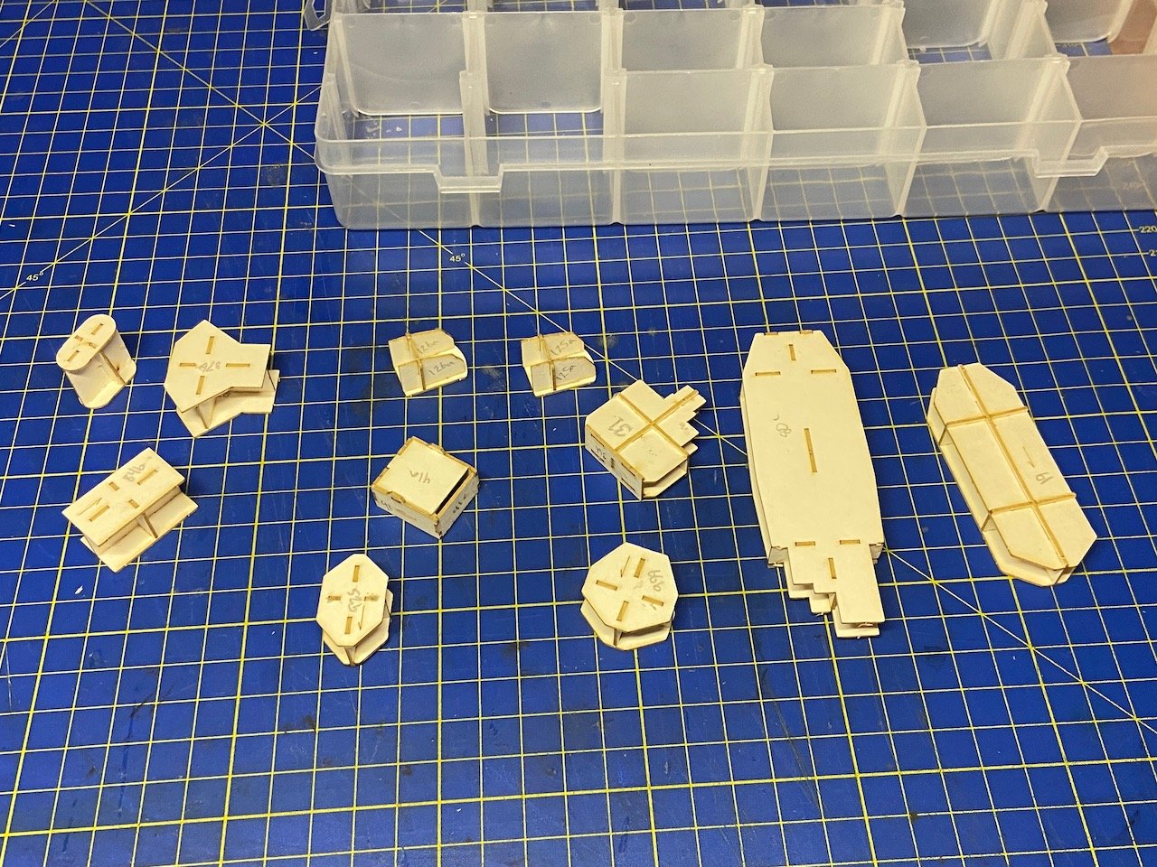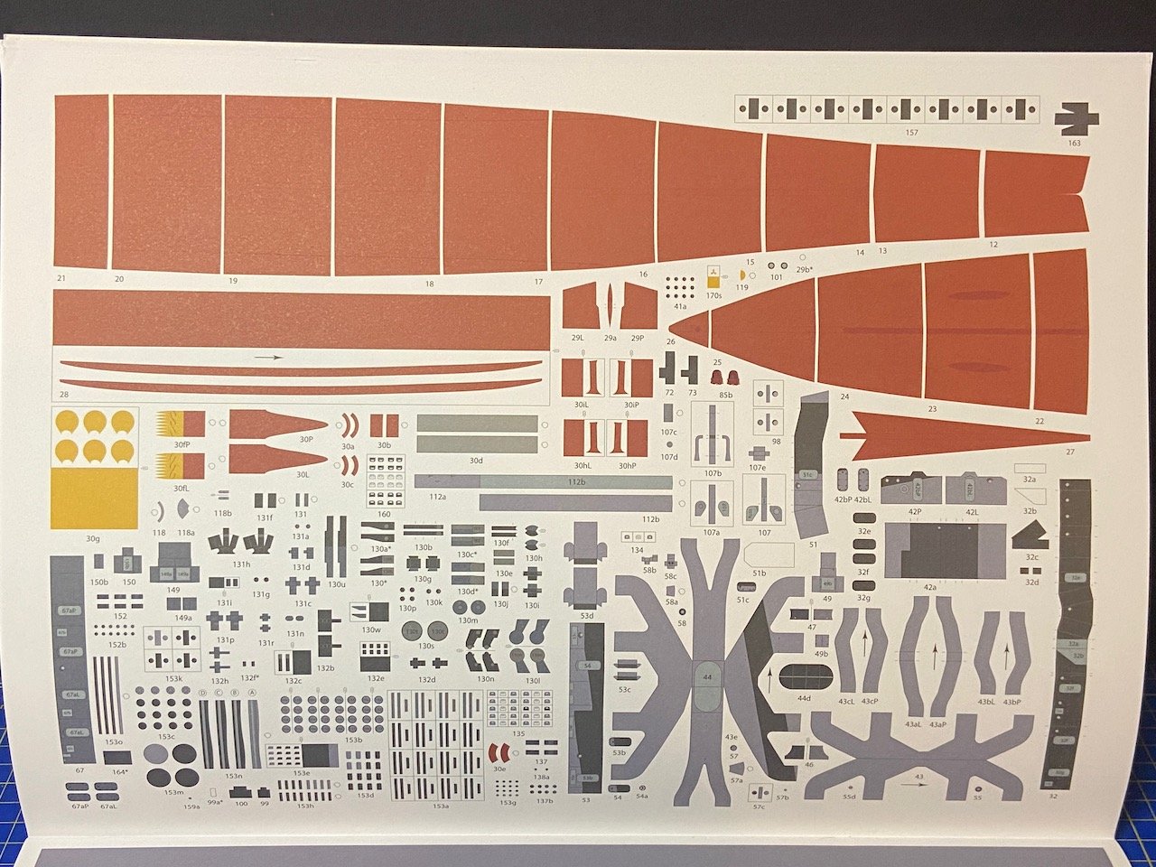 So far, I've really enjoyed doing the easy part. Started making the structures for the subassemblies using the laser-cut frames set. Since most of the part labels were next to the parts themselves, I made sure to write the numbers on the faces of the parts, so I wouldn't screw things up... or at least reduce the chances of me screwing things up. I'm sure I can still do it... And, here are the substructure of many of the subassemblies. Meanwhile, I added some wooden blocks to help stiffen the hull framing. The larger filer blocks are balsa, but I started running out, so I just reinforced sections with some basswood pieces. This should also help to support mounting rods at a later stage. That's what I've done with other paper models, though they mostly been a lot smaller than this one. I'm going to experiment with using some filler to fill and smooth out the hull shape. I've seen some models where the builder used styrofoam instead of the wood blocks or filler. Just never been keen working with that stuff. Worst case with my model hull, I'll ruin it and I'll need another laser-cut frame set. Anyway, I'm considering getting a second kit, because I know I'm going to lose or mess up parts. I've scanned and printed the parts sheets, but the color is off from the original, and the color and part numbers printed on the deck pieces are pretty muddy in the original and hard to read, and even worse in the printed scan.