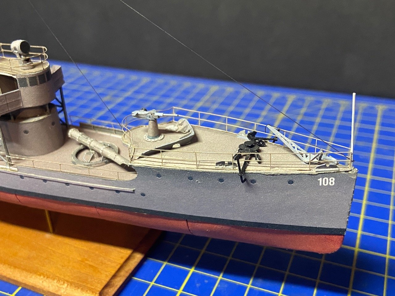 I'm happy to say that I finally put the finishing touches on my V108 model today. My first steel navy paper model is complete. It's not perfect, but I'm pretty happy with how well it turned out. I ended up not detailing the radio aerials as much as I had originally planned. But, between the existing aerials and the photo-etched railings, I think I had enough of a challenge to satisfy me. Today, I finally got around to adding the anchors and cutting out and building a new anchor crane and mounting it into place. I'm much happier with the new one that with my original one. Also, since my last post, I added the new ladder that leads up to the bridge. Again, it's not perfect, but it actually turned out much better than I thought it would. The other item I added was the rangefinder that's mounted up in the little tower, just aft of the aft torpedo launcher. That particular item turned out to be a real challenge to make. I couldn't built it the way the instructions showed, but it's very small, so it's hard to see the details anyway. So now I can move onto the next steel navy paper model project. But, I have so many other things I need to finish. I'll probably go ahead and start that project, so I can see if I can improve my paper ship modeling techniques, but I will probably only work on it in between other projects. Anyway, it's nice to have this one moved into my list of FINISHED models. Next year, I'll probably take it to a couple local IPMS events.