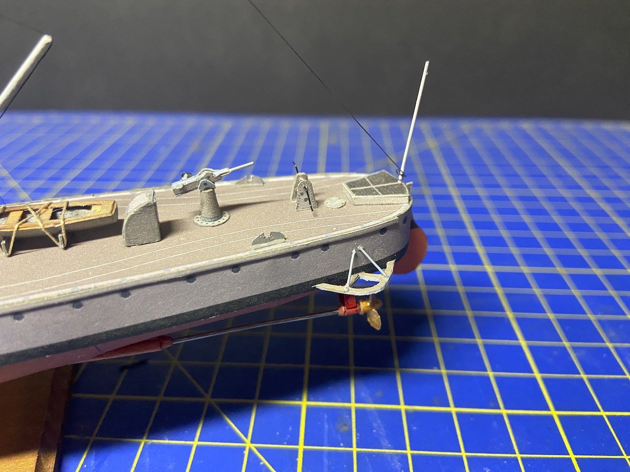 While I'm working on building the searchlight, rangefinder, and a new anchor crane, I added the remaining bridge detail, which included the navigation lights and the wooden grating platforms. I also decided to go ahead and rig the ariels on the masts and mount the masts into place. This work might get a little bit in the way when dealing with the railings, but I just felt that I needed to move the project forward a little more. Also, those radio ariels that run down to the bridge wings in the above photo is not glued into place, it's just an extra long, weighted line that runs through a pinhole I drilled into the bridge deck. So, I can move those out of the way to add the top most railing. The aft mast stays needed a place to secure on deck, so I just drilled pinholes for those. For now, I weighted the stays with binder clips in about the location where they'll need to go. As for the ariels I ran between the masts, that's just "un-educated" guesswork, as this part of the instructions didn't seem detailed enough. I'm happy enough with for this model Next, I'll need to secure the aft mast stays before I start adding the main deck railings. Oh, forgot that I still need to add the supports that run up from the propeller guards to the hull. That shouldn't be too difficult, and I'll probably do them next.