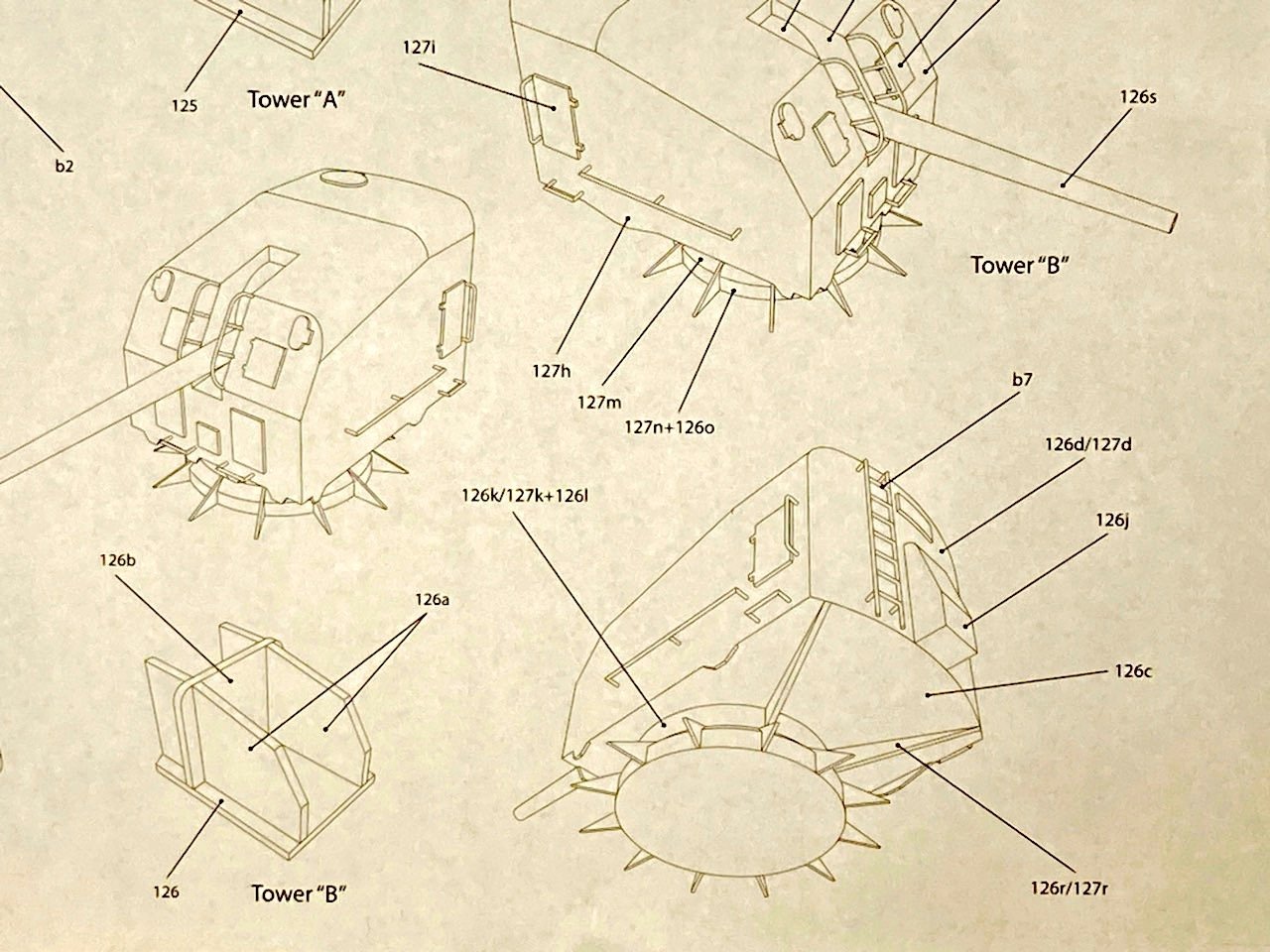 After that, I got a bit brave, but also very curious how the turrets were going to turn out. The assembly is complex, and I've studied the drawings. It took me quite some time to figure out where all the parts were going to go, or where to really begin, as I realized that some of the parts have to be put on before others.
