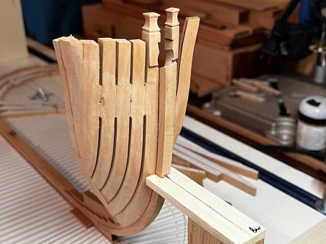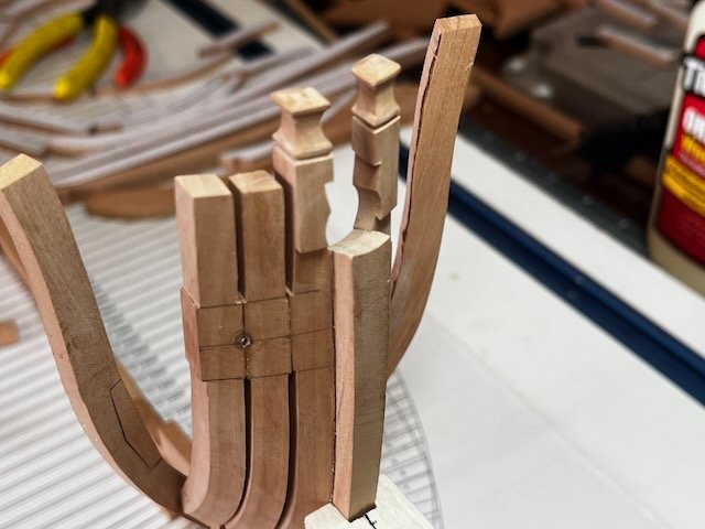 Finally some progress on the pointy end. I cut out the frames in the usual manner. I printed out an extra set of frame drawing, so I could add them to both sides of the frames. I did some pre-beveling, and then glued all the frames together into 2 stacks (not shown). I then did some shaping on the inside and outside of the frames before temporarily attaching to the stem. I marked the heights for the hawse holes and the level of the material that will remain when I cut the air gaps.