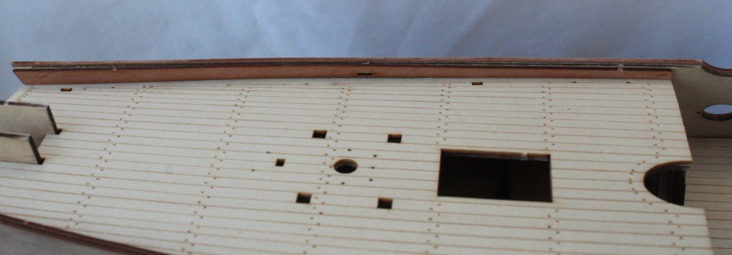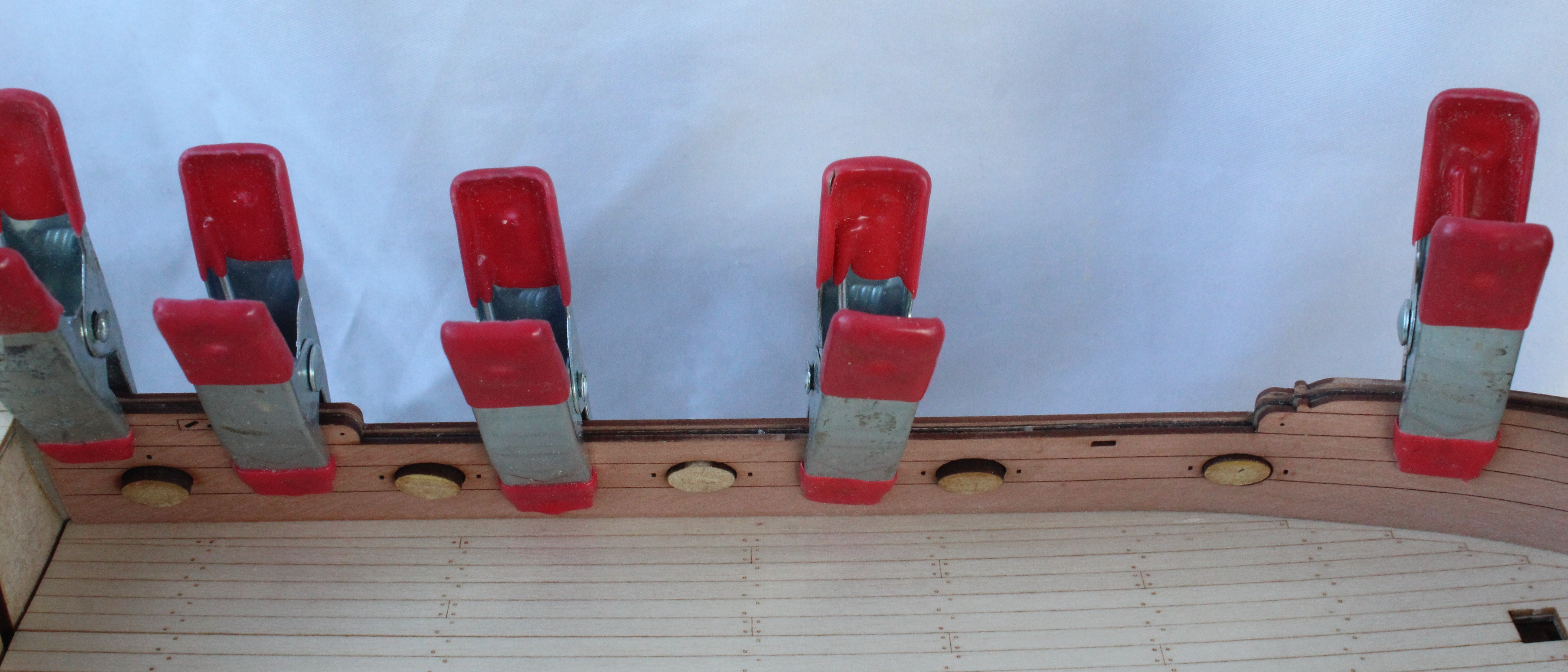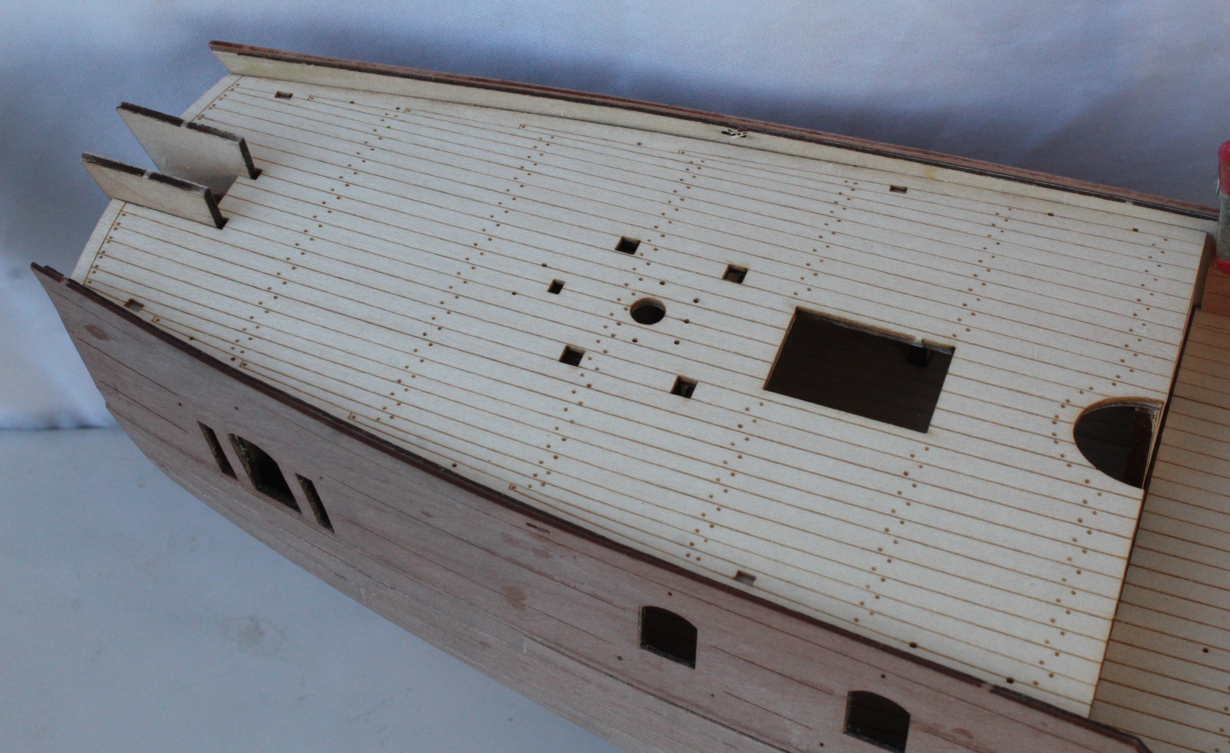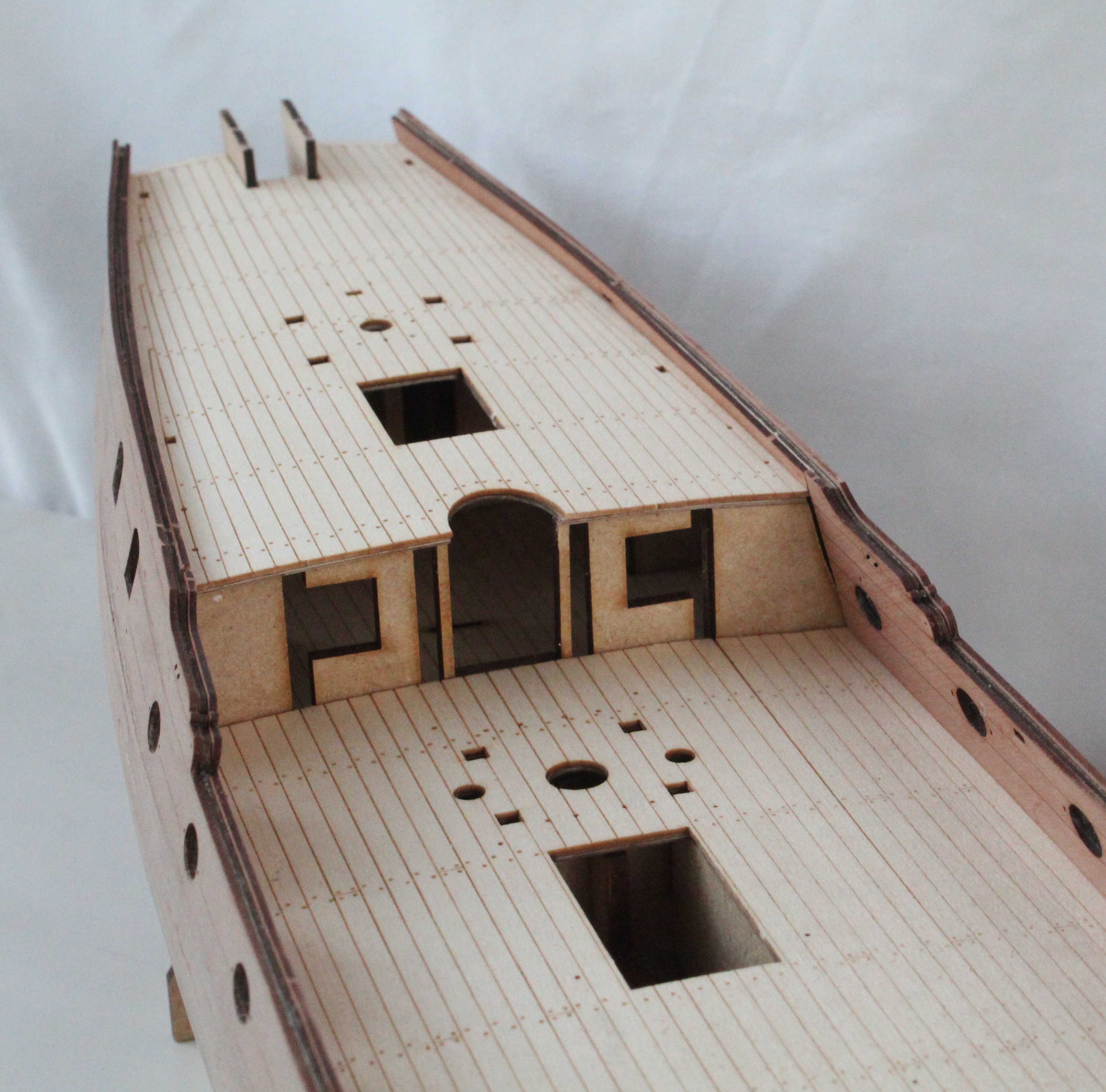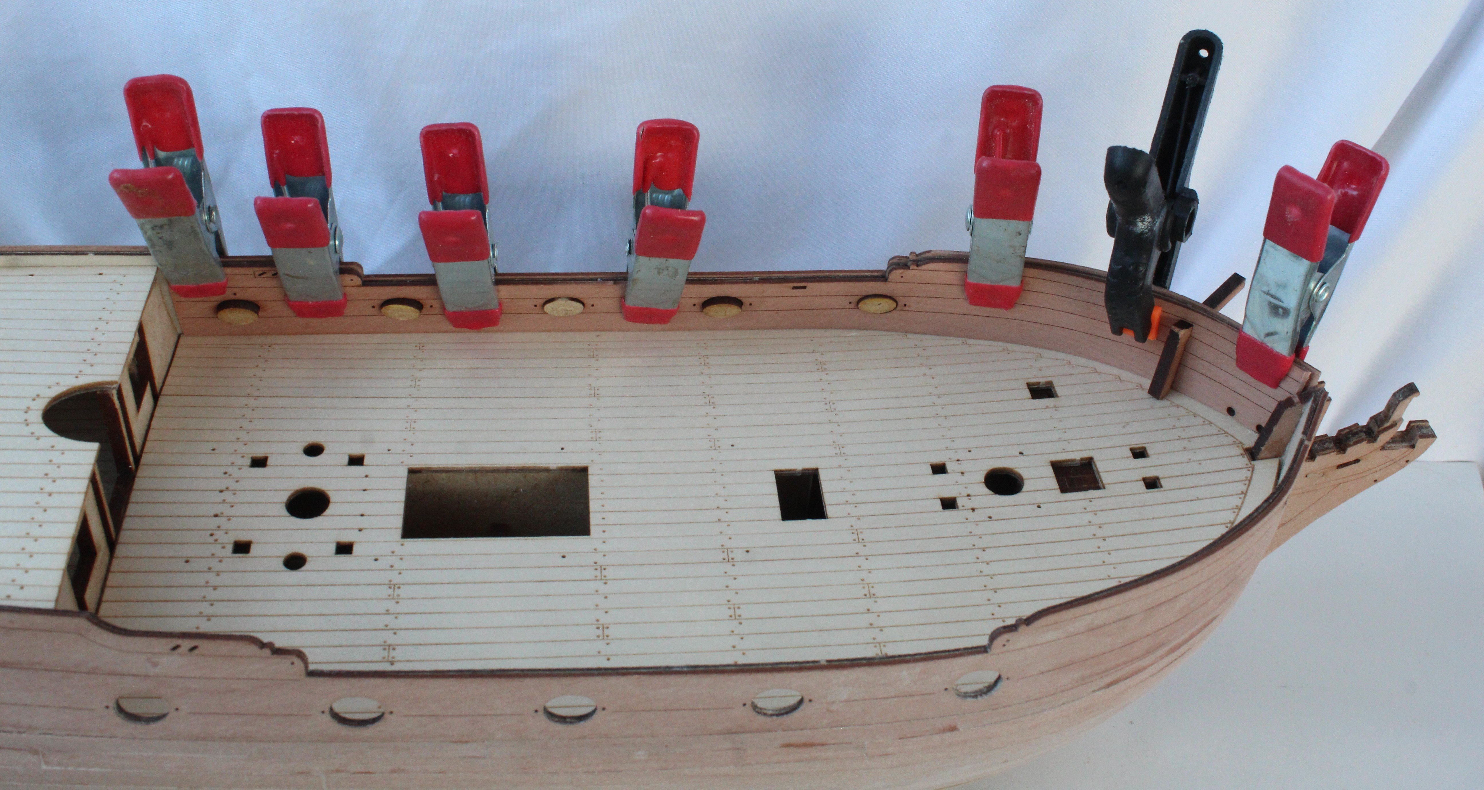 Build Log - Day 22 (2nd Dec 2025) Task 42 – Laser Etched Decks and Inner Bulwark patterns It took a few attempts before I was happy with the dry fit of the lower deck inner bulwark patterns. I ended up taking about 1mm from the front edge and then I had to sand a bit from the bottom edge. When test fitting the patterns I used both the cathead and the oval locator plugs to check the alignment. The two laser etched deck patterns were then glued in place. I used some pins pushed through the eyebolt holes to make sure these patterns were aligned with the deck bases. When test fitting the upper deck bulwark patterns I noted, when properly aligned, there was a gap between the bottom edge and the deck in the mid-section. I did consider making some new patterns, but I decided to sit these patterns flush with the deck when they were glued in place. The lower deck inner bulwark patterns were then glued in place. I used the catheads and oval locator plugs to position these patterns before clamping. Once clamped the catheads and locator plugs were removed. Photos Lower deck trial fit with bulwarks Laser Etched Decks Fitted The next photos shows the mid-section gap when the upper deck inner bulwark is aligned. Upper deck inner bulwark glued in place, without the gap with the deck. The lower deck inner bulwark pattern clamped in place after gluing. The oval locators were removed after this photo was taken. You may also note that I have drawn and taped the preliminary water line The current build status