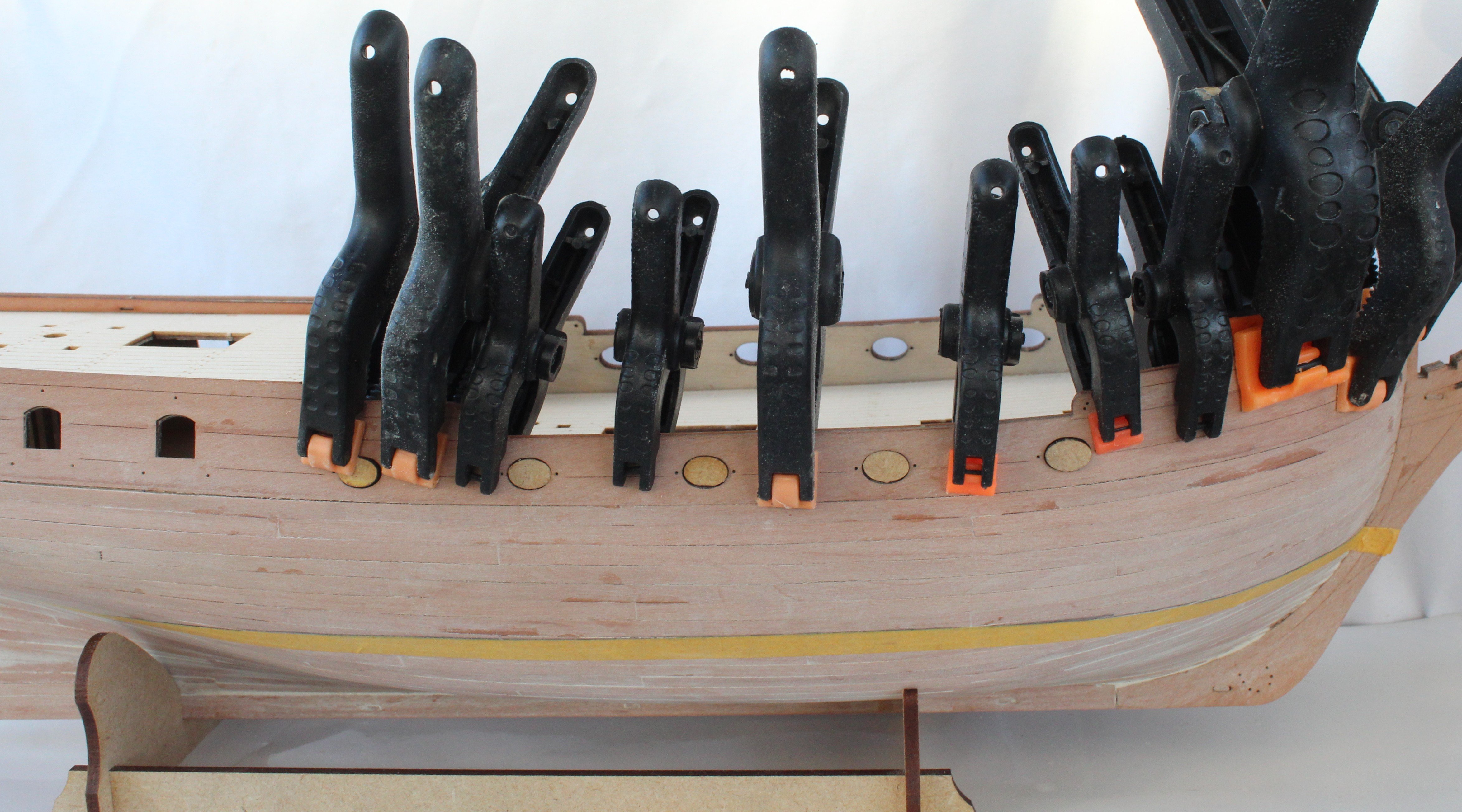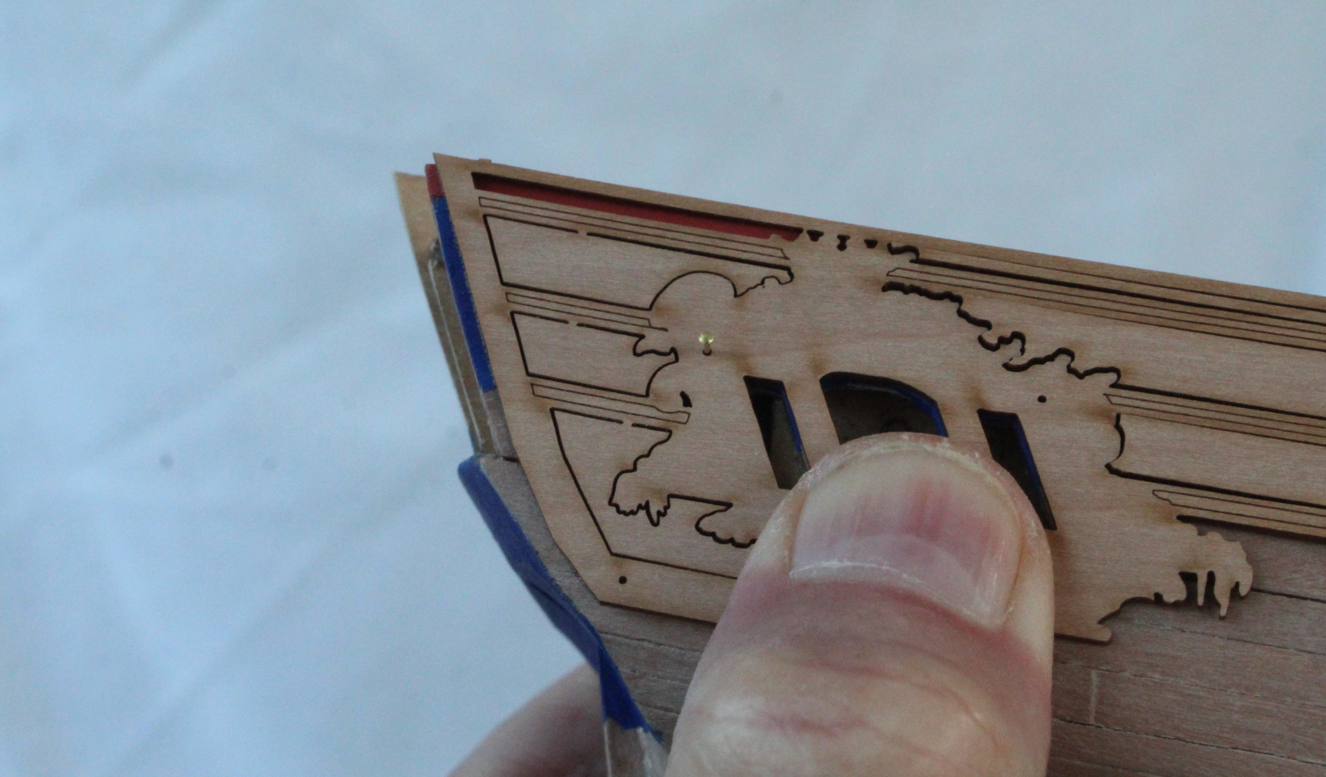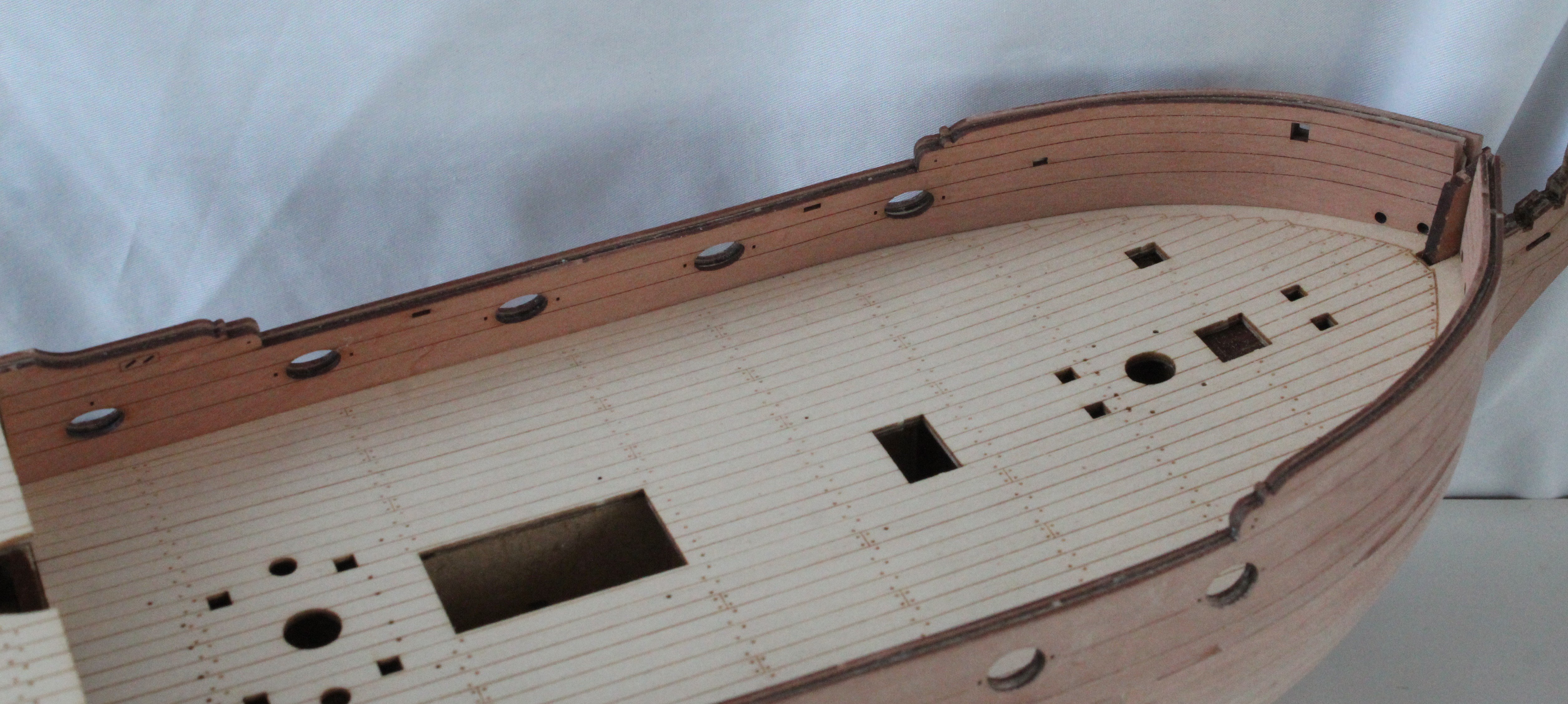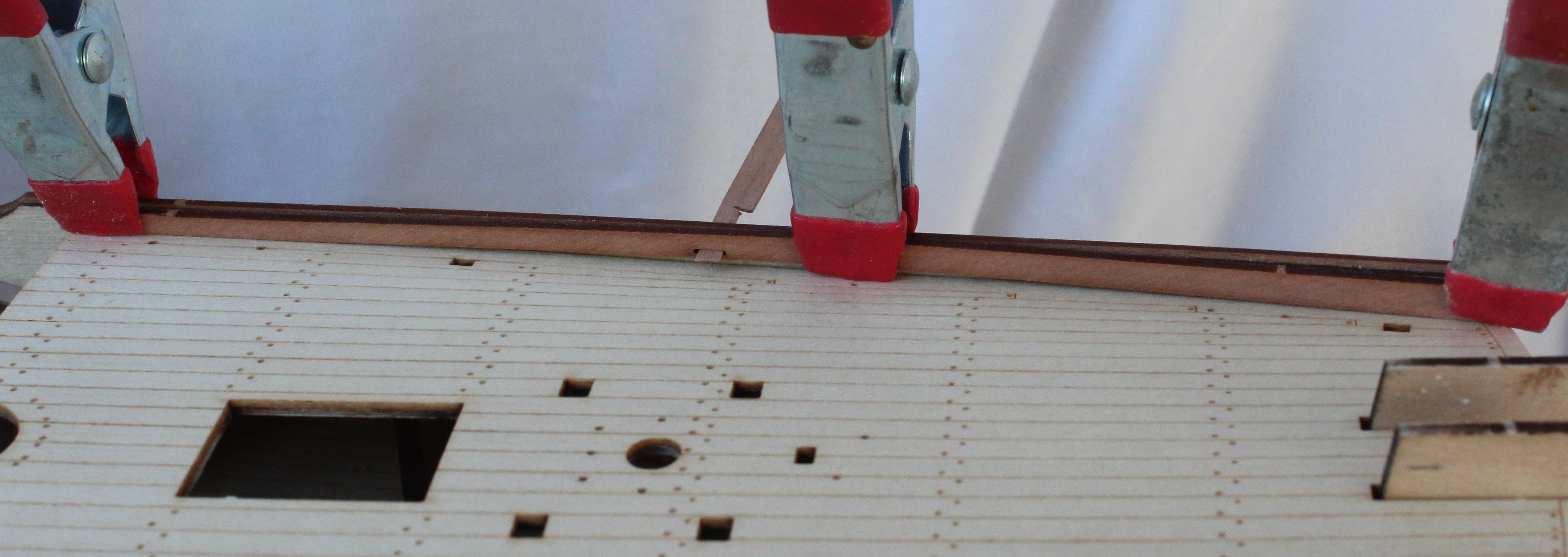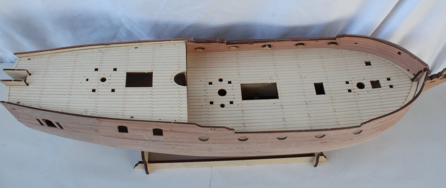 Build Log - Day 22 (2nd Dec 2025) Task 42 – Laser Etched Decks and Inner Bulwark patterns It took a few attempts before I was happy with the dry fit of the lower deck inner bulwark patterns. I ended up taking about 1mm from the front edge and then I had to sand a bit from the bottom edge. When test fitting the patterns I used both the cathead and the oval locator plugs to check the alignment. The two laser etched deck patterns were then glued in place. I used some pins pushed through the eyebolt holes to make sure these patterns were aligned with the deck bases. When test fitting the upper deck bulwark patterns I noted, when properly aligned, there was a gap between the bottom edge and the deck in the mid-section. I did consider making some new patterns, but I decided to sit these patterns flush with the deck when they were glued in place. The lower deck inner bulwark patterns were then glued in place. I used the catheads and oval locator plugs to position these patterns before clamping. Once clamped the catheads and locator plugs were removed. Photos Lower deck trial fit with bulwarks Laser Etched Decks Fitted The next photos shows the mid-section gap when the upper deck inner bulwark is aligned. Upper deck inner bulwark glued in place, without the gap with the deck. The lower deck inner bulwark pattern clamped in place after gluing. The oval locators were removed after this photo was taken. You may also note that I have drawn and taped the preliminary water line The current build status