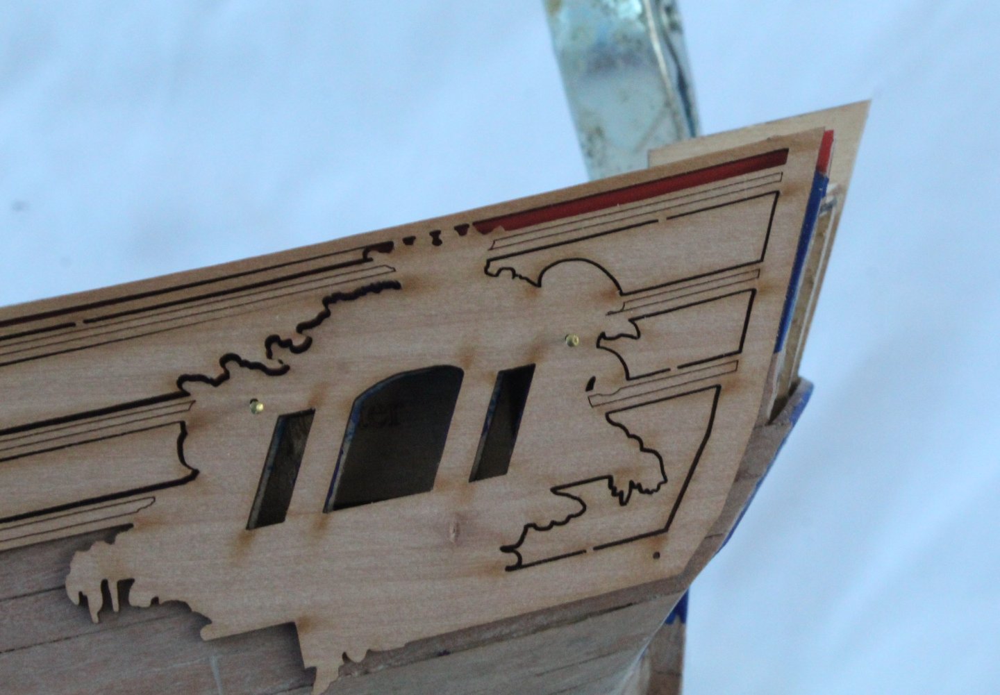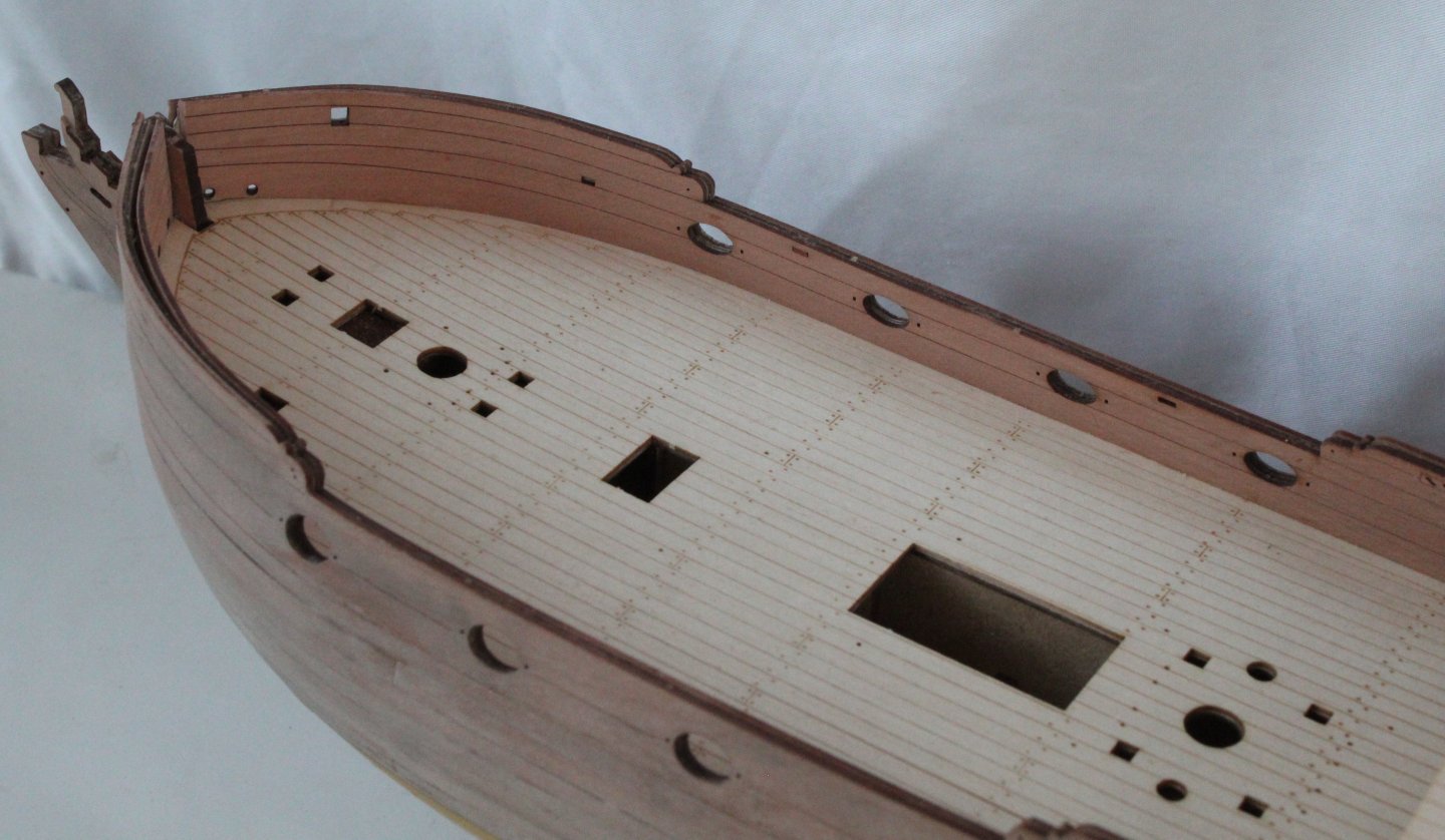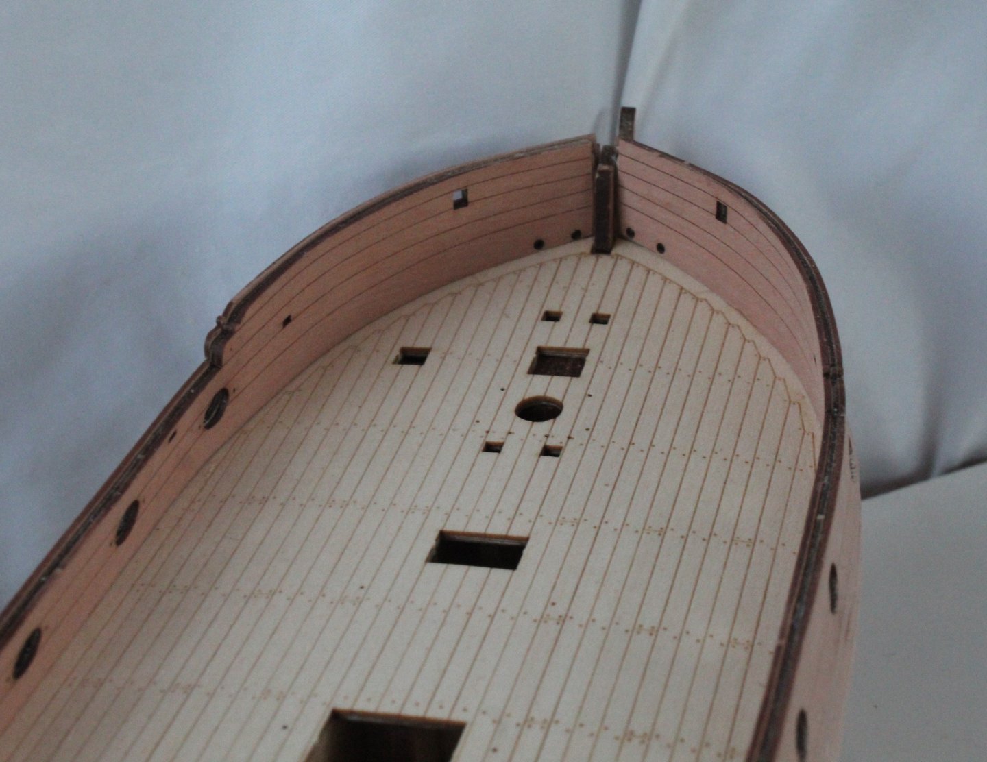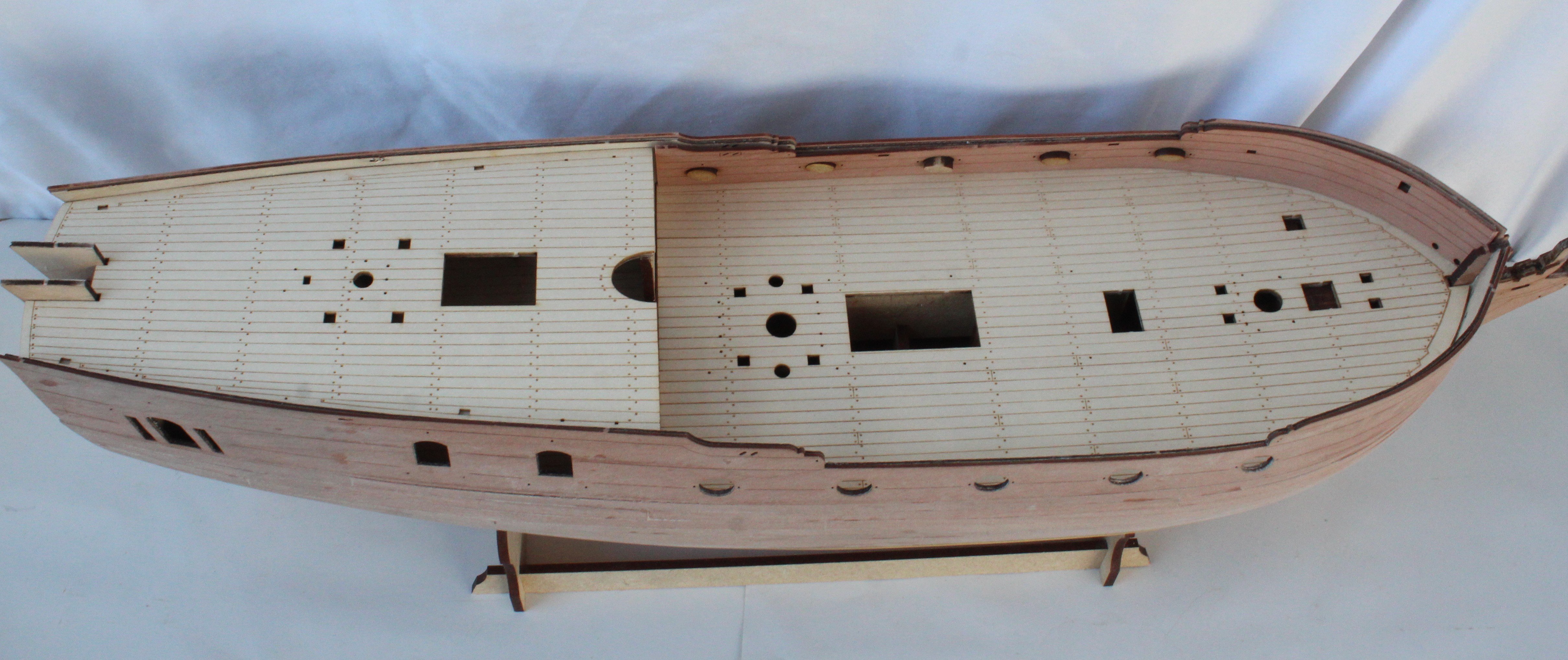 Build Log - Day 22 (2nd Dec 2025) Task 42 – Laser Etched Decks and Inner Bulwark patterns It took a few attempts before I was happy with the dry fit of the lower deck inner bulwark patterns. I ended up taking about 1mm from the front edge and then I had to sand a bit from the bottom edge. When test fitting the patterns I used both the cathead and the oval locator plugs to check the alignment. The two laser etched deck patterns were then glued in place. I used some pins pushed through the eyebolt holes to make sure these patterns were aligned with the deck bases. When test fitting the upper deck bulwark patterns I noted, when properly aligned, there was a gap between the bottom edge and the deck in the mid-section. I did consider making some new patterns, but I decided to sit these patterns flush with the deck when they were glued in place. The lower deck inner bulwark patterns were then glued in place. I used the catheads and oval locator plugs to position these patterns before clamping. Once clamped the catheads and locator plugs were removed. Photos Lower deck trial fit with bulwarks Laser Etched Decks Fitted The next photos shows the mid-section gap when the upper deck inner bulwark is aligned. Upper deck inner bulwark glued in place, without the gap with the deck. The lower deck inner bulwark pattern clamped in place after gluing. The oval locators were removed after this photo was taken. You may also note that I have drawn and taped the preliminary water line The current build status
