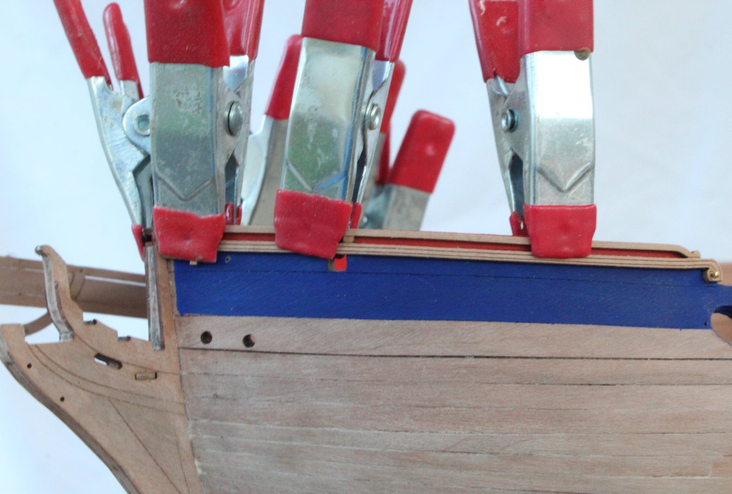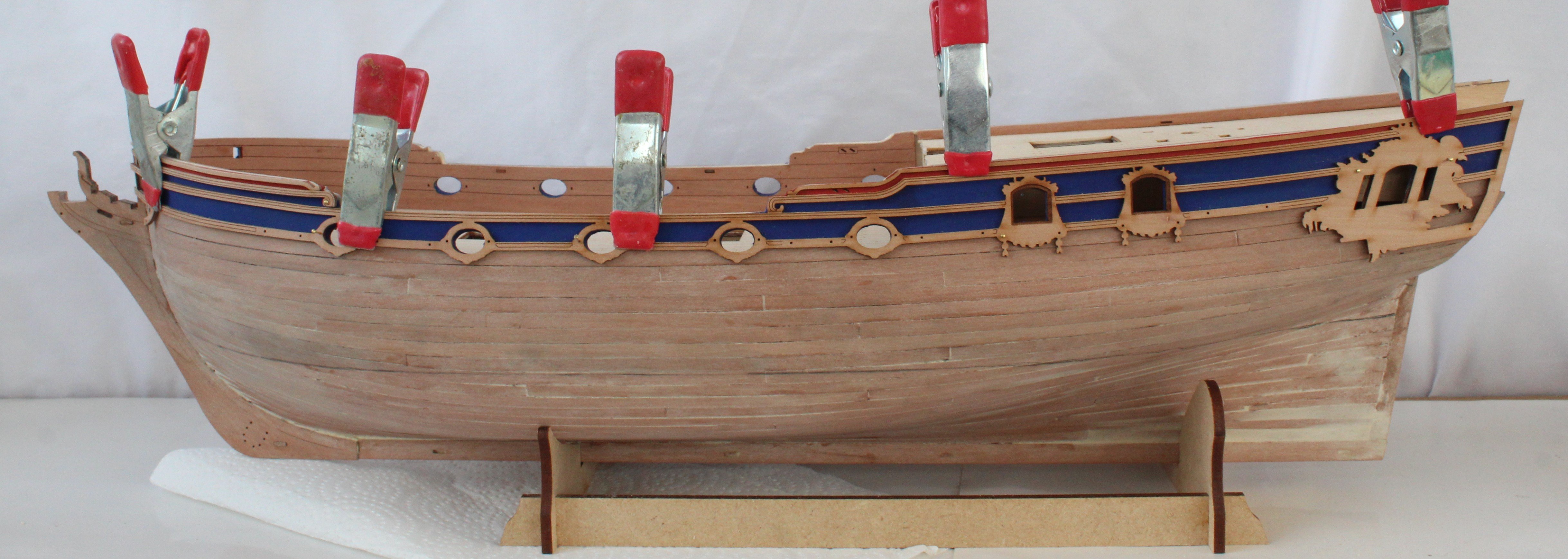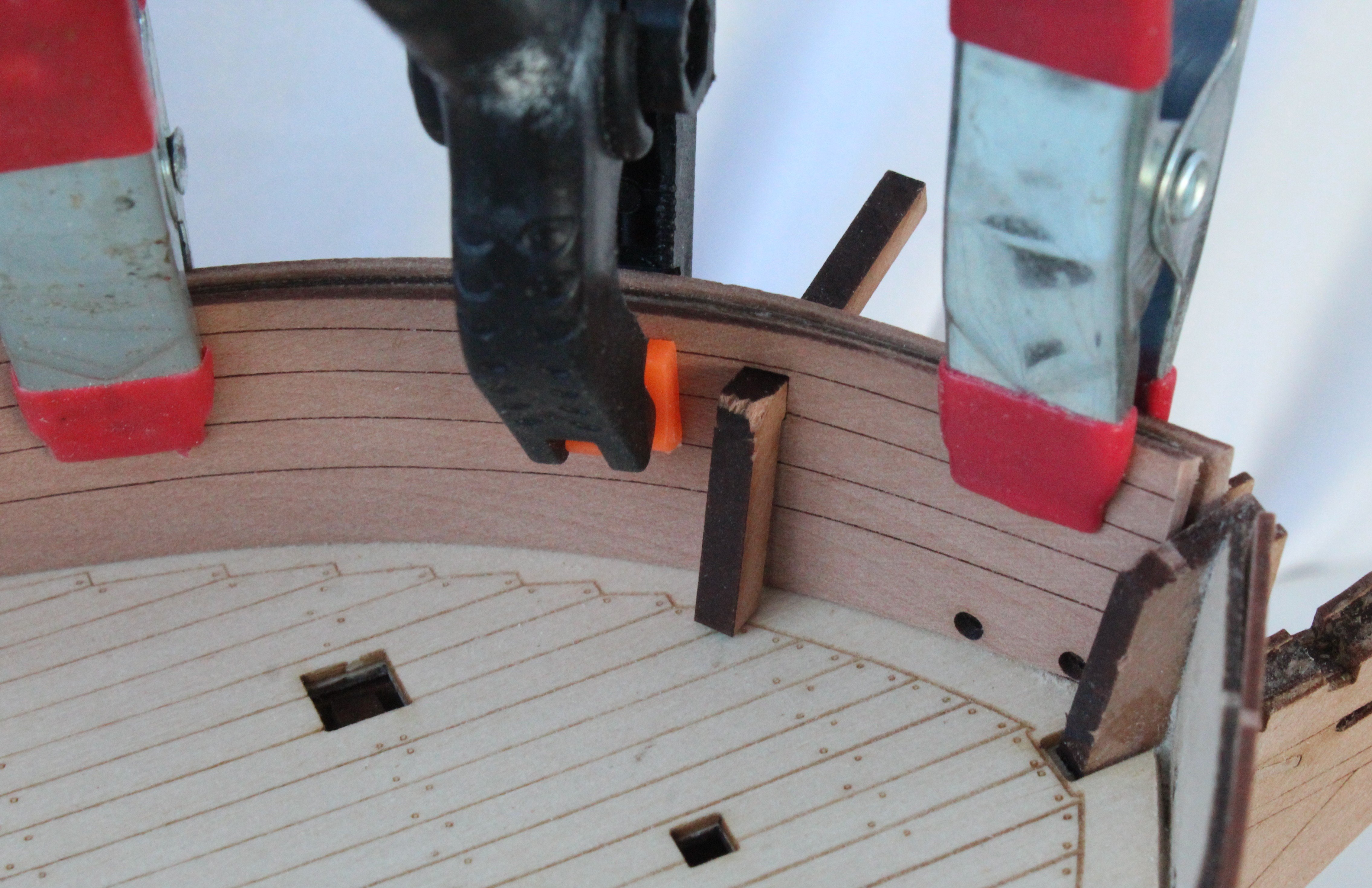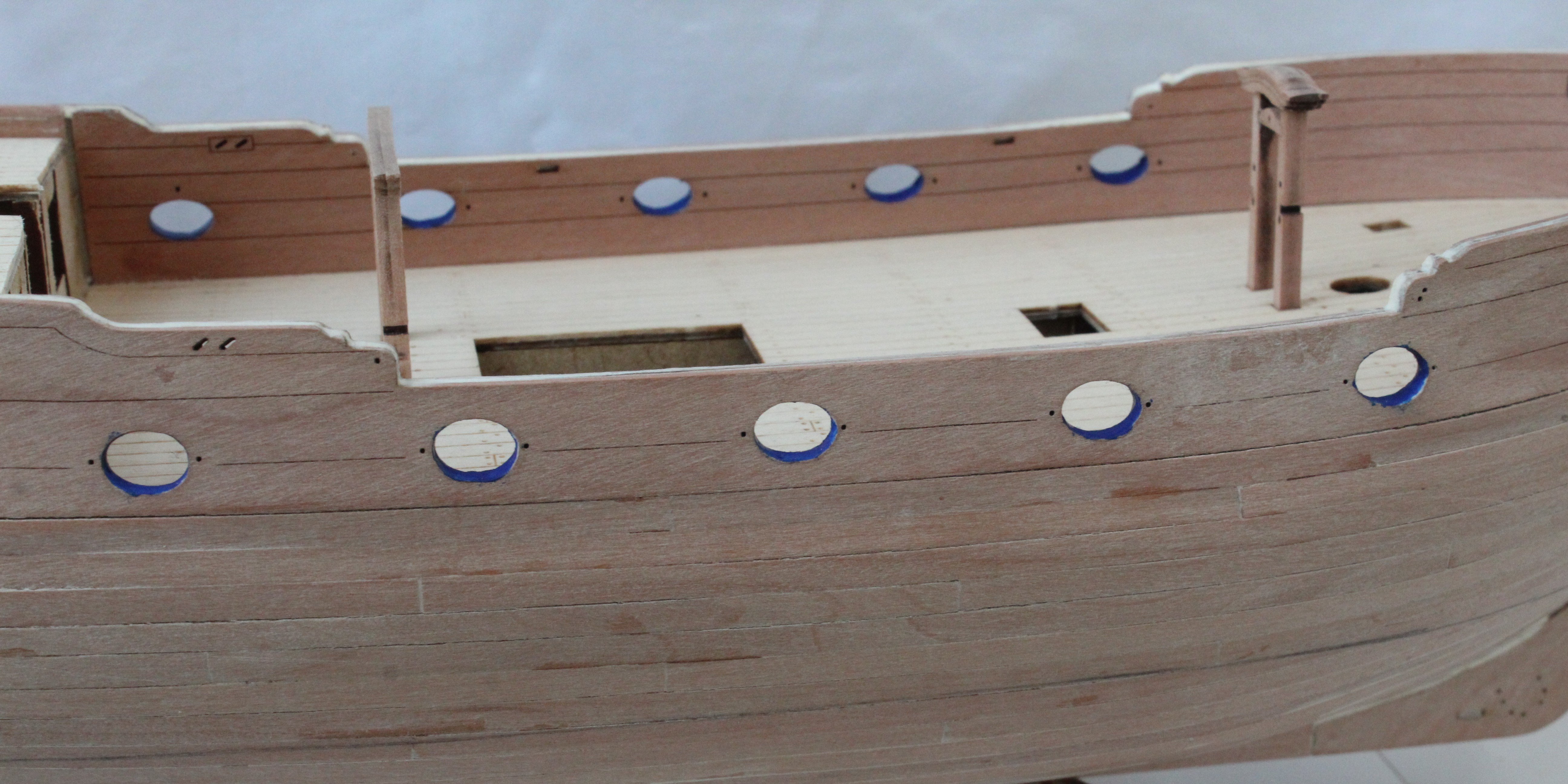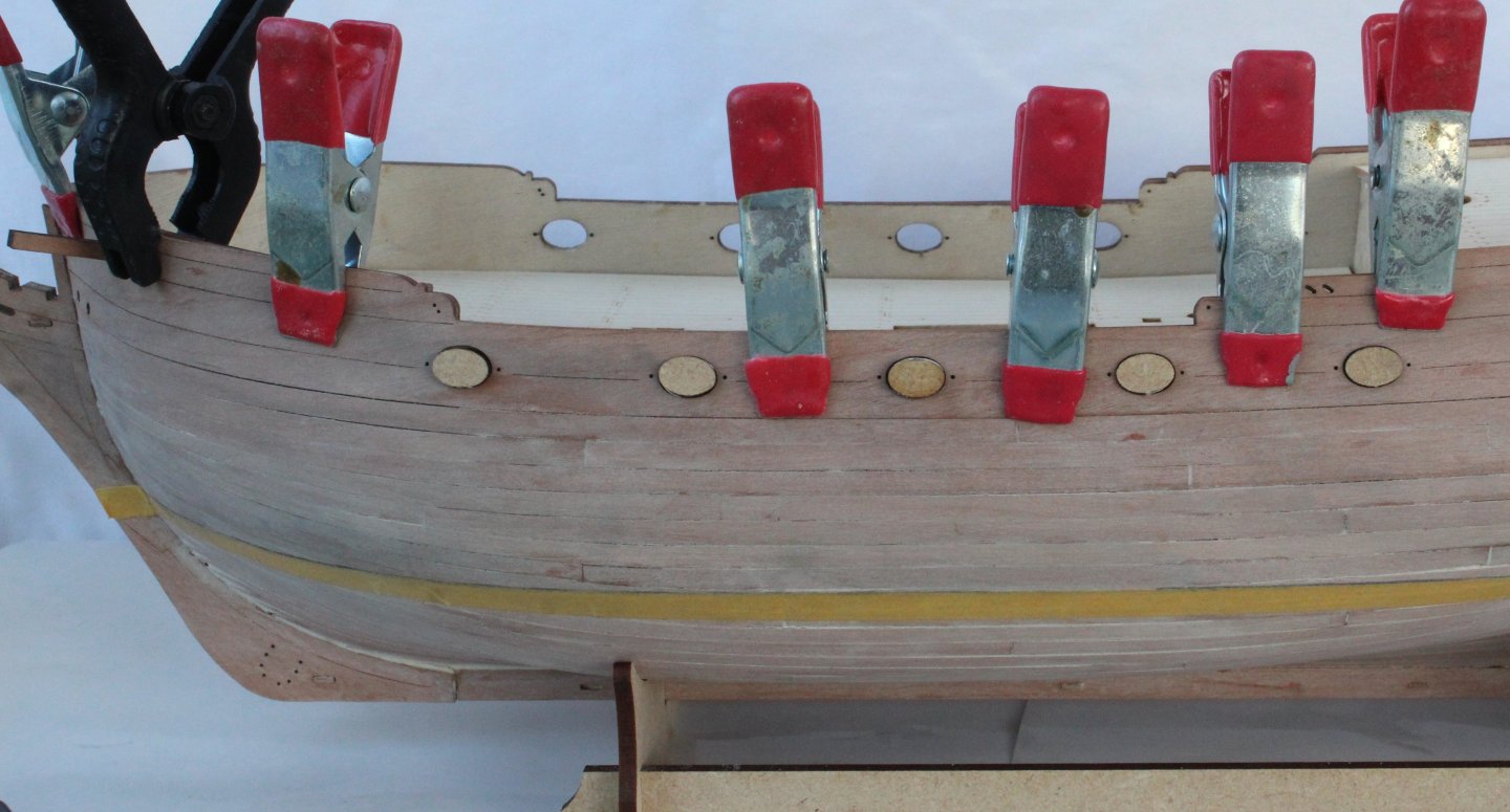 Build Log - Day 22 (2nd Dec 2025) Task 42 – Laser Etched Decks and Inner Bulwark patterns It took a few attempts before I was happy with the dry fit of the lower deck inner bulwark patterns. I ended up taking about 1mm from the front edge and then I had to sand a bit from the bottom edge. When test fitting the patterns I used both the cathead and the oval locator plugs to check the alignment. The two laser etched deck patterns were then glued in place. I used some pins pushed through the eyebolt holes to make sure these patterns were aligned with the deck bases. When test fitting the upper deck bulwark patterns I noted, when properly aligned, there was a gap between the bottom edge and the deck in the mid-section. I did consider making some new patterns, but I decided to sit these patterns flush with the deck when they were glued in place. The lower deck inner bulwark patterns were then glued in place. I used the catheads and oval locator plugs to position these patterns before clamping. Once clamped the catheads and locator plugs were removed. Photos Lower deck trial fit with bulwarks Laser Etched Decks Fitted The next photos shows the mid-section gap when the upper deck inner bulwark is aligned. Upper deck inner bulwark glued in place, without the gap with the deck. The lower deck inner bulwark pattern clamped in place after gluing. The oval locators were removed after this photo was taken. You may also note that I have drawn and taped the preliminary water line The current build status