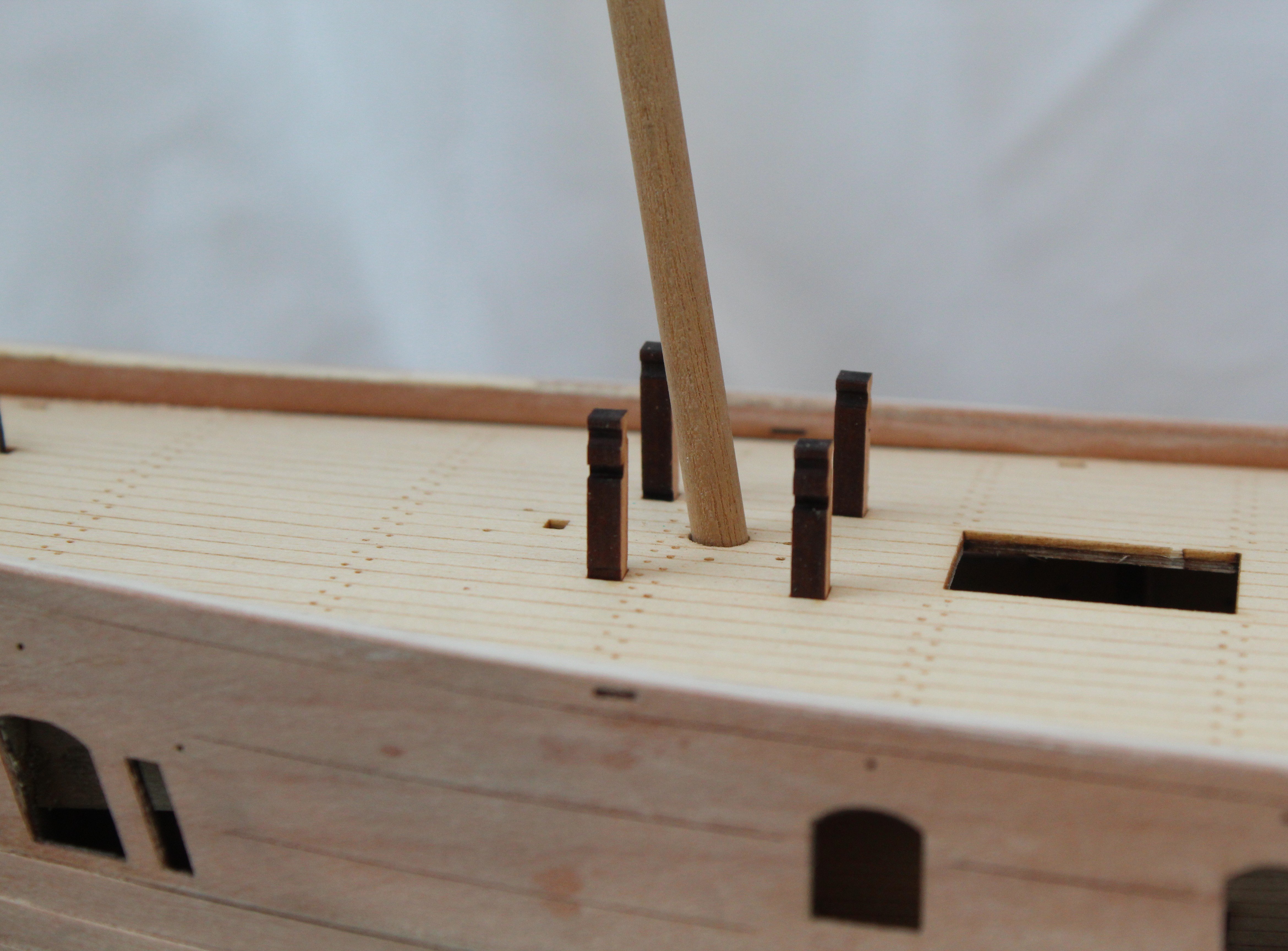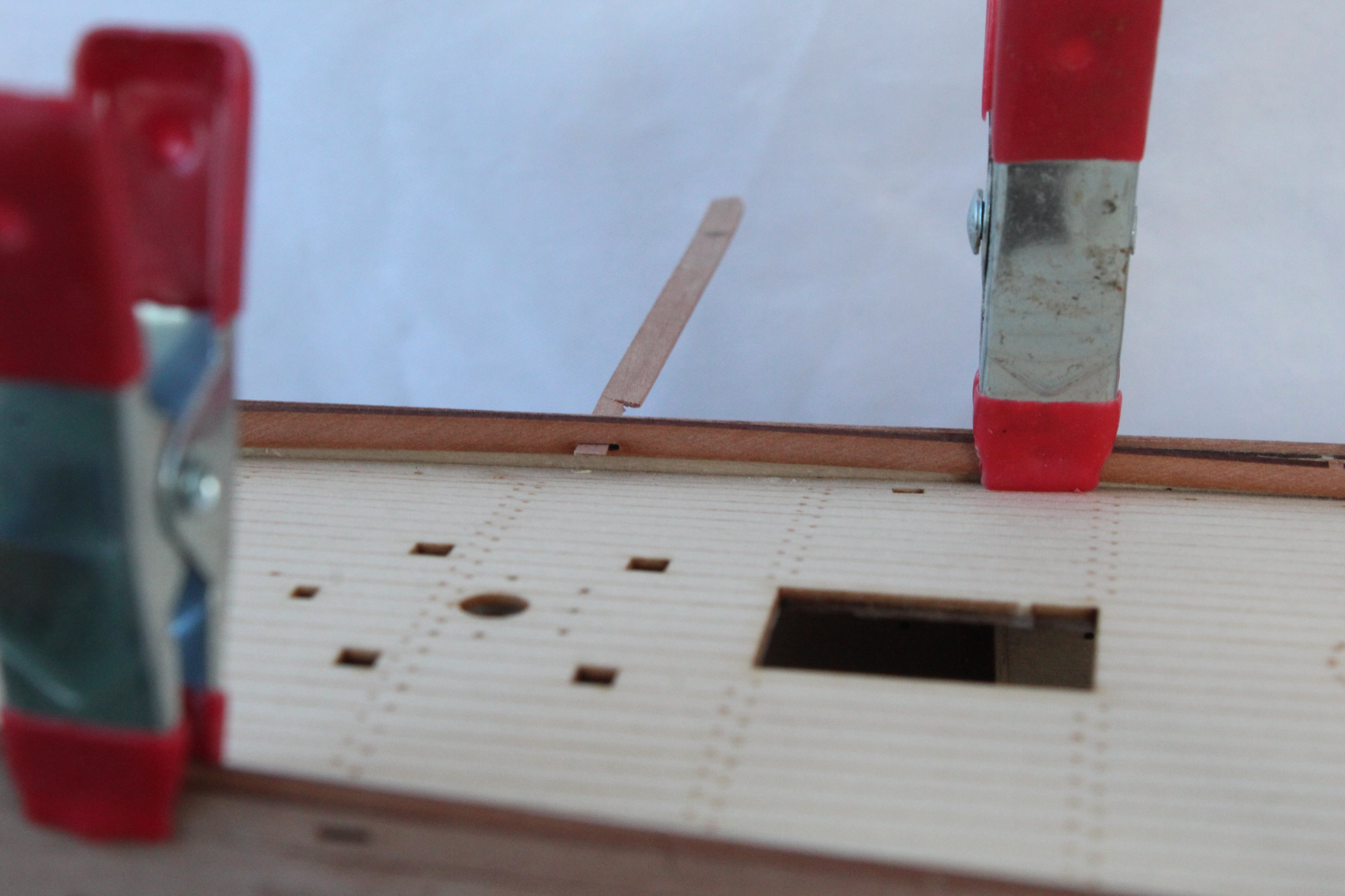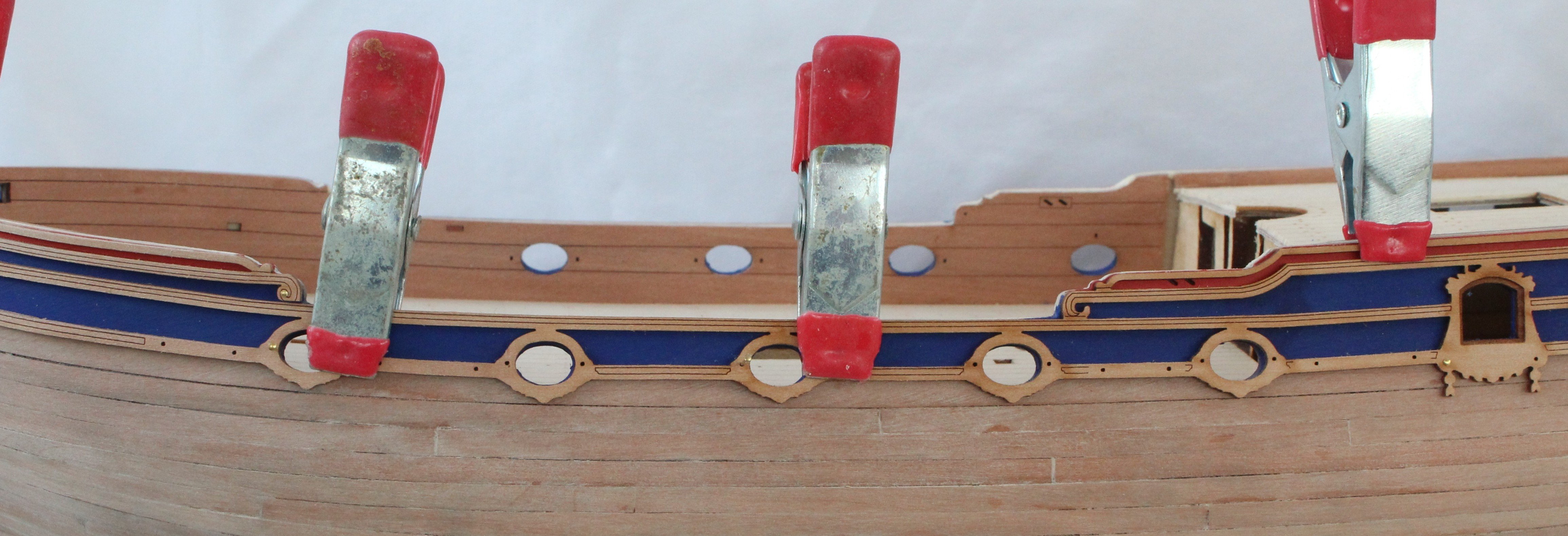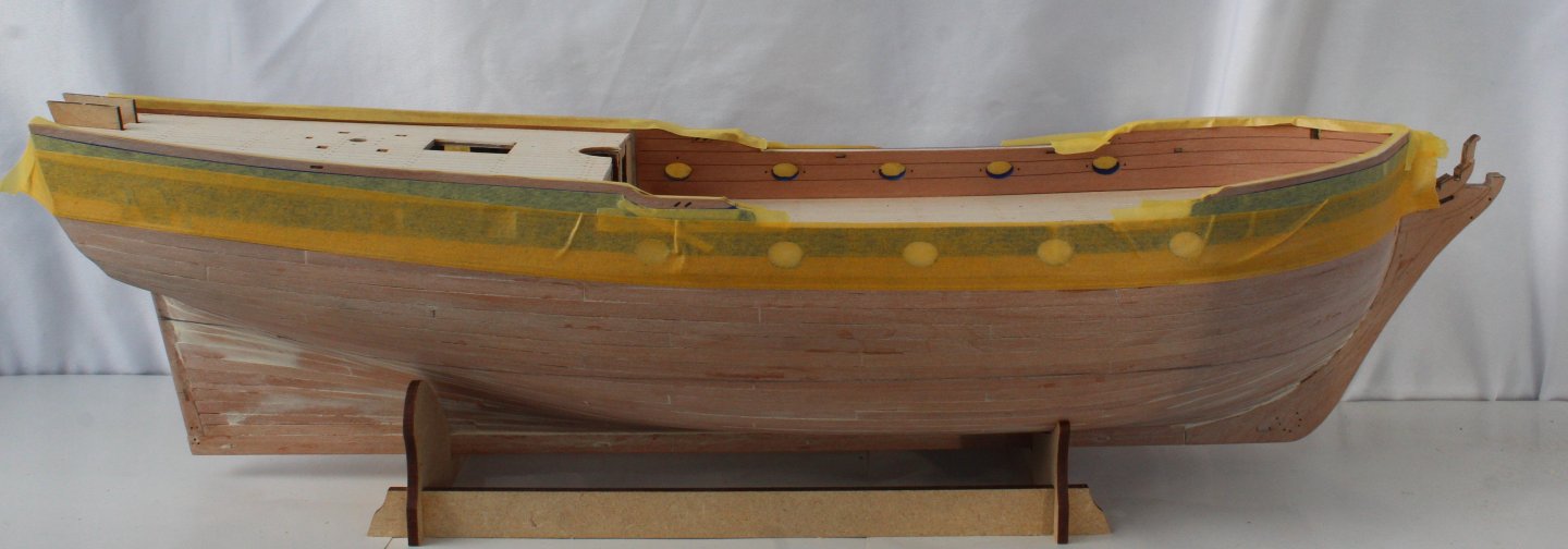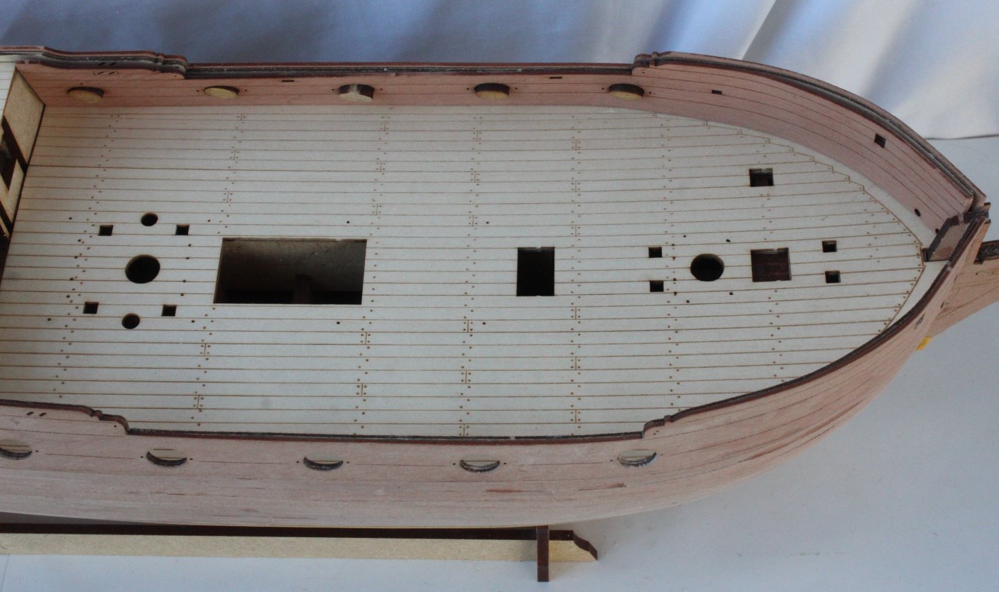 Build Log - Day 22 (2nd Dec 2025) Task 42 – Laser Etched Decks and Inner Bulwark patterns It took a few attempts before I was happy with the dry fit of the lower deck inner bulwark patterns. I ended up taking about 1mm from the front edge and then I had to sand a bit from the bottom edge. When test fitting the patterns I used both the cathead and the oval locator plugs to check the alignment. The two laser etched deck patterns were then glued in place. I used some pins pushed through the eyebolt holes to make sure these patterns were aligned with the deck bases. When test fitting the upper deck bulwark patterns I noted, when properly aligned, there was a gap between the bottom edge and the deck in the mid-section. I did consider making some new patterns, but I decided to sit these patterns flush with the deck when they were glued in place. The lower deck inner bulwark patterns were then glued in place. I used the catheads and oval locator plugs to position these patterns before clamping. Once clamped the catheads and locator plugs were removed. Photos Lower deck trial fit with bulwarks Laser Etched Decks Fitted The next photos shows the mid-section gap when the upper deck inner bulwark is aligned. Upper deck inner bulwark glued in place, without the gap with the deck. The lower deck inner bulwark pattern clamped in place after gluing. The oval locators were removed after this photo was taken. You may also note that I have drawn and taped the preliminary water line The current build status