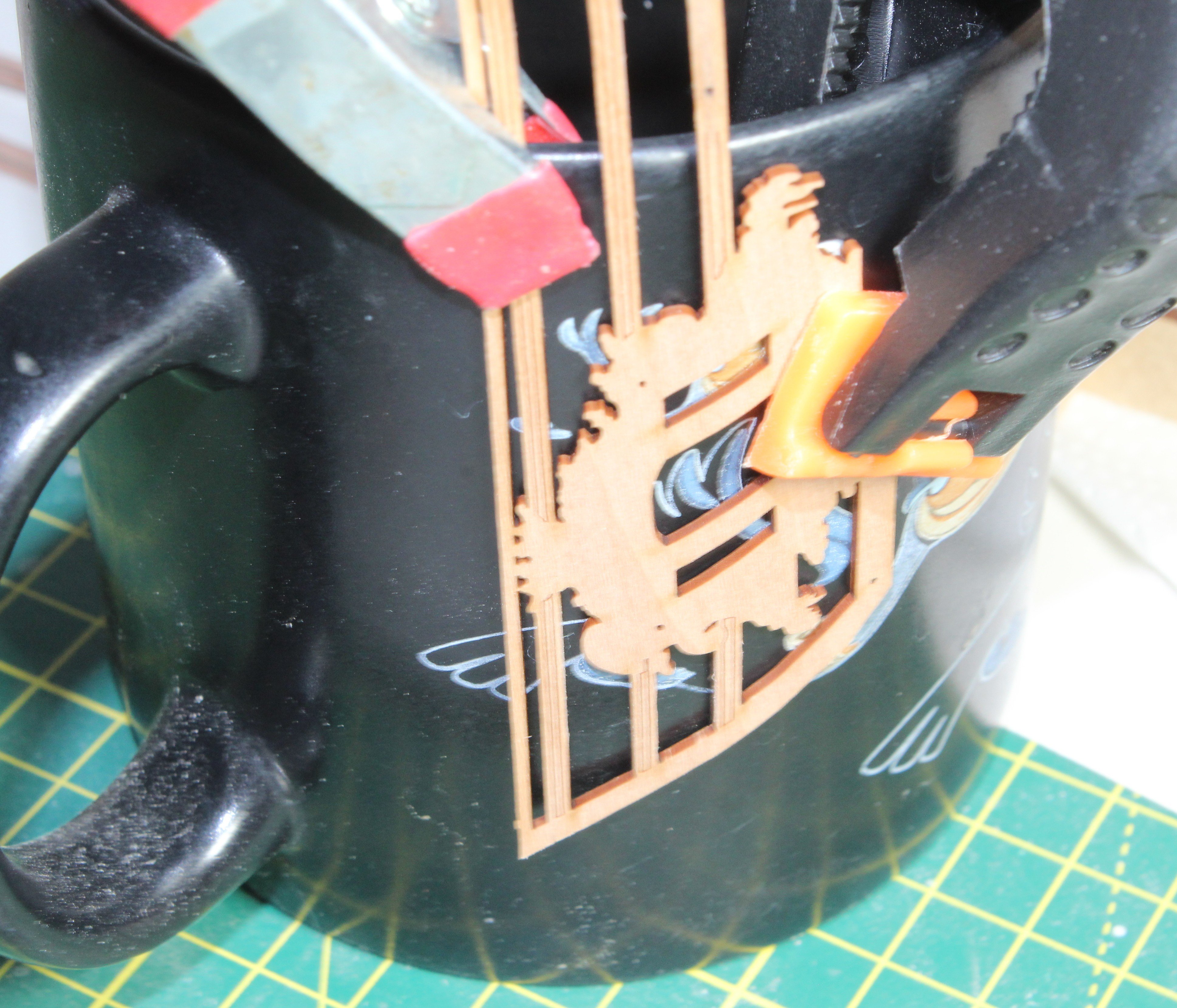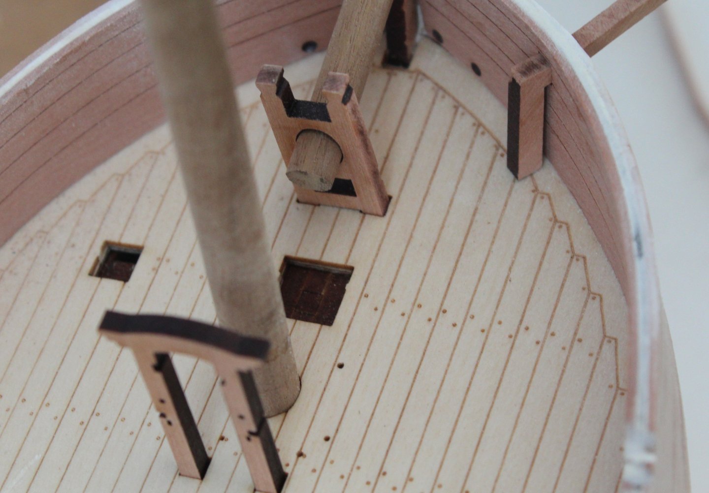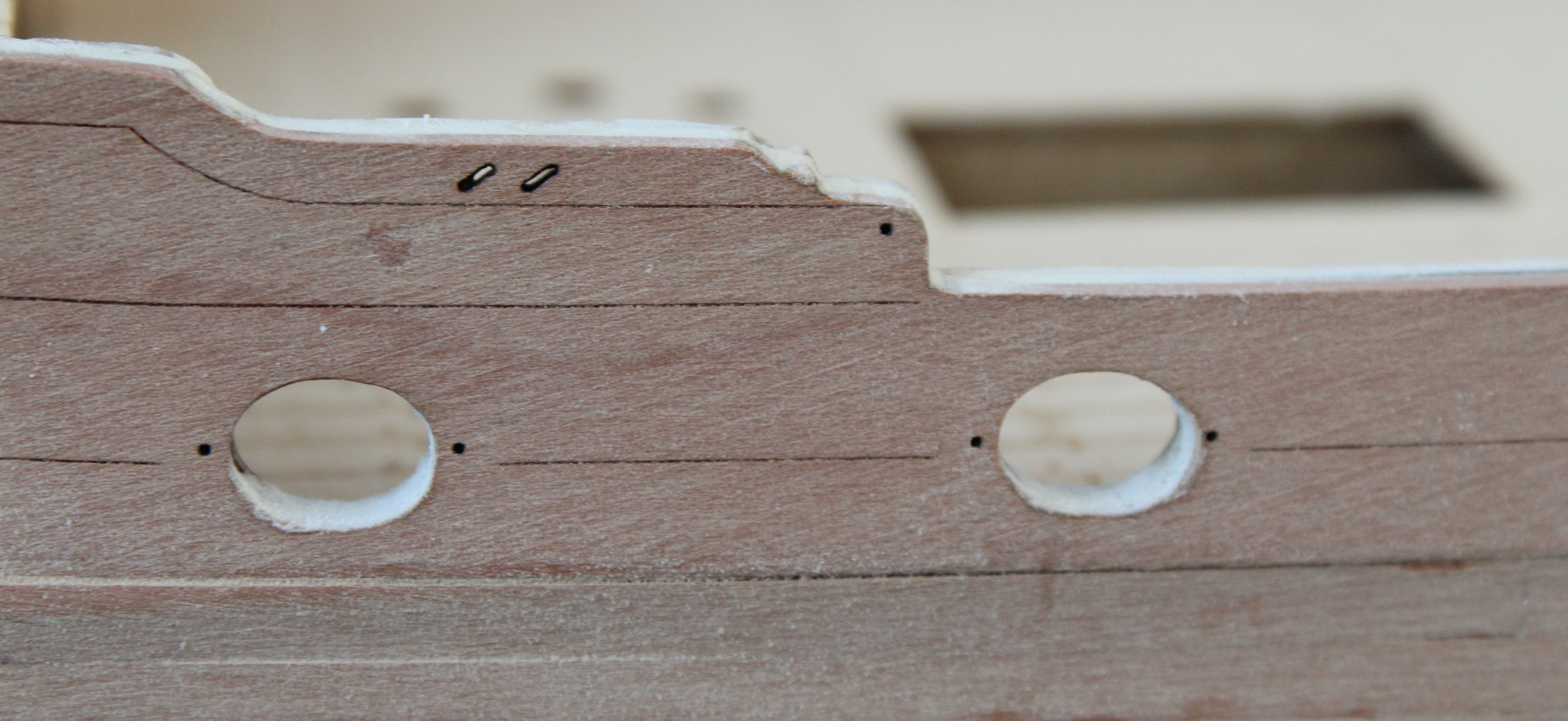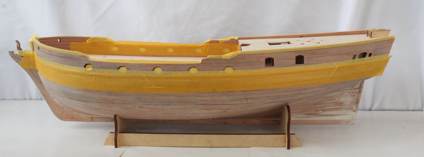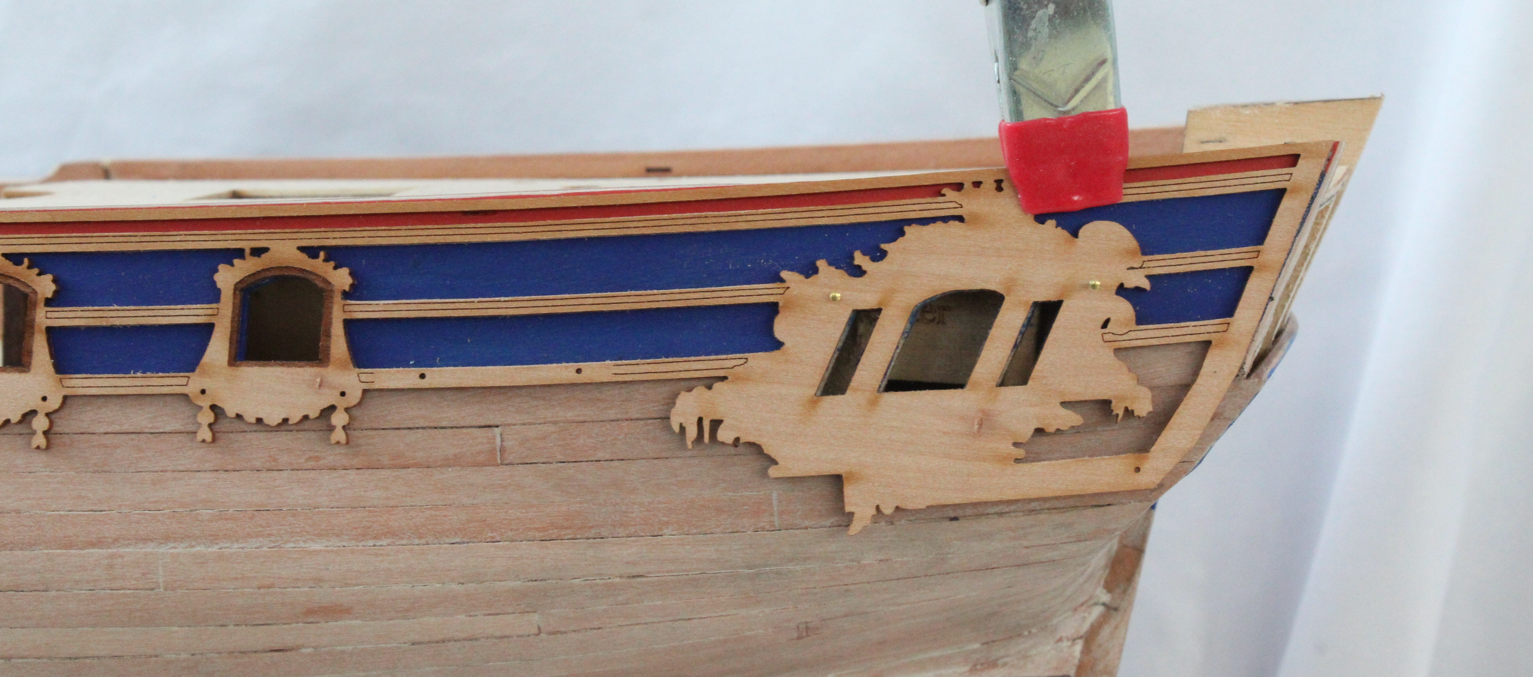 Build Log - Day 22 (2nd Dec 2025) Task 42 – Laser Etched Decks and Inner Bulwark patterns It took a few attempts before I was happy with the dry fit of the lower deck inner bulwark patterns. I ended up taking about 1mm from the front edge and then I had to sand a bit from the bottom edge. When test fitting the patterns I used both the cathead and the oval locator plugs to check the alignment. The two laser etched deck patterns were then glued in place. I used some pins pushed through the eyebolt holes to make sure these patterns were aligned with the deck bases. When test fitting the upper deck bulwark patterns I noted, when properly aligned, there was a gap between the bottom edge and the deck in the mid-section. I did consider making some new patterns, but I decided to sit these patterns flush with the deck when they were glued in place. The lower deck inner bulwark patterns were then glued in place. I used the catheads and oval locator plugs to position these patterns before clamping. Once clamped the catheads and locator plugs were removed. Photos Lower deck trial fit with bulwarks Laser Etched Decks Fitted The next photos shows the mid-section gap when the upper deck inner bulwark is aligned. Upper deck inner bulwark glued in place, without the gap with the deck. The lower deck inner bulwark pattern clamped in place after gluing. The oval locators were removed after this photo was taken. You may also note that I have drawn and taped the preliminary water line The current build status