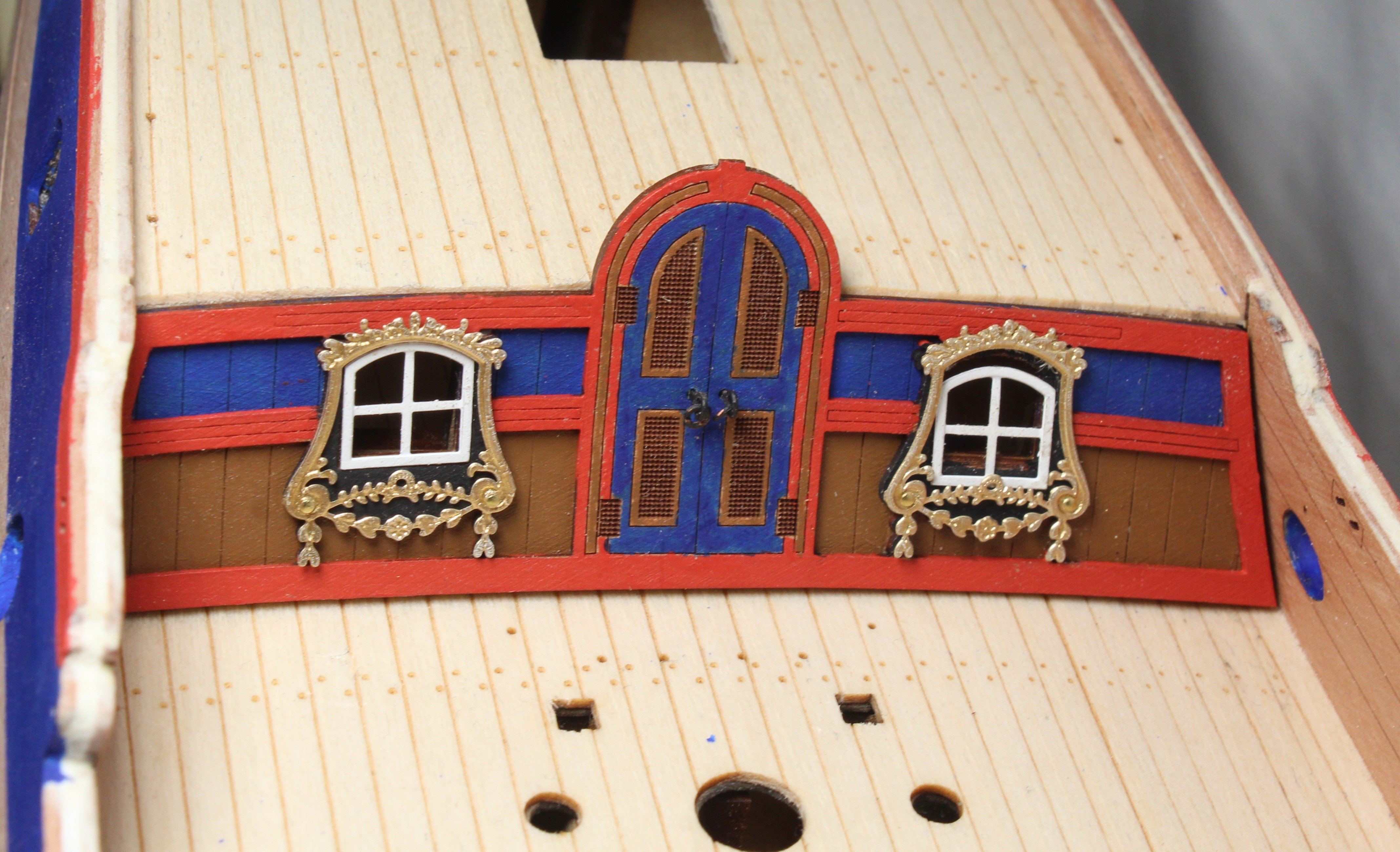 Build Log - Day 26 (9th Dec 2025) Task 45 – Mid Deck Bulkhead The first task today was to start preparing the various PE parts for the main rails and mid deck bulkhead. After cleaning I sprayed a white primer to the PE sheets. Once the paint had dried, I taped over the items which will be painted white and then sprayed the paints with a brilliant gold paint. The mid-section bulkhead comprises to wooden patterns which need to be glued together. However before doing this I embarked making this bulkhead fit for a Duchess. I painted the top section of the rear pattern royal imperial blue and the lower section walnut brown. The upper most pattern had a more complex painting scheme. The window section was painted black. The outer framework was painted red. The outer and inner door framework sections were also painted red, and the middle section was painted walnut brown. The door was painted imperial blue. Finally, I added a walnut brown finish to the frames for the 4 off inner door decorative panels. With the painting complete the two sections were glued together. I then added two eyebolts fitted with rings for the door handles (painted black). The window frames and window decorative patterns were then test fitted. I am really pleased with how this panel now looks and feel it was worth the time and effort taken. The right-hand window frame was dislodged when positioning the panel for the attached photo so it is slightly askew but will be fixed in place when the frames are glued. The door hinges also need to be added, which I have painted black. There is also a decorative gold painted PE part to add above the door frame.