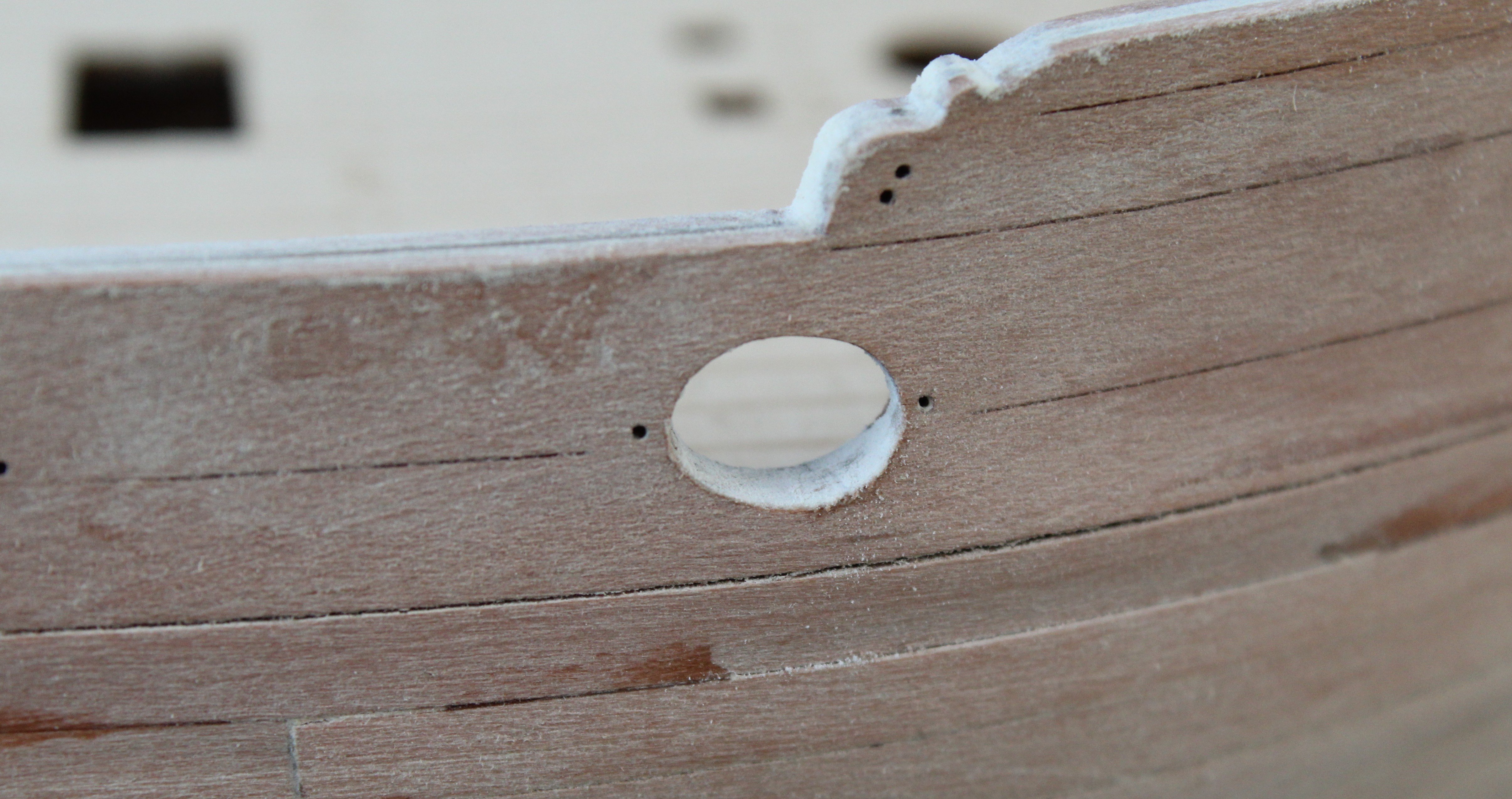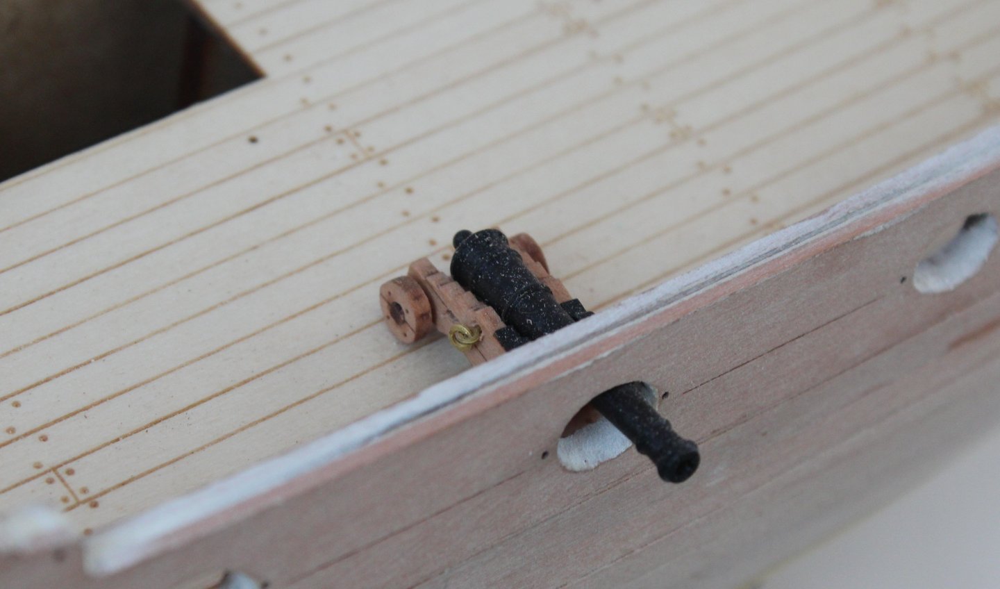Build Log - Day 23 (3rd Dec 2025) Task 43 – More Prep Work I have now sanded the tops of the bulwarks level and did test fit the gunwales. All looks good. I did brush on some diluted wood filler around the curved sections that are not covered by the gunwales so the laminations between the layers will not be visible once painted. The gunport opening were also sanded smooth and coated with diluted wood filler so that, when painted, the laminations between the layers should not be visible. I copied this method from @DelF. I am currently waiting for a delivery of some Rustins Polyurethane clear satin varnish so I can apply a WOP finish to the hull before embarking on the painting tasks. I have also ordered some different coloured paints. Depending on the test results I might then paint the hull and inner bulwarks with a wooden paint finish. I also took the opportunity to test fit some of the deck items which locate in the various deck openings. Thankfully no problems detected. Photos Picture of the hull with some deck items, masts and bowsprit test fitted. Gun ports sanded and coated with diluted wood filler. Checking a cannon with a gunport Checking the bitts and mast on the upper deck Checking the cabin pattern, main mast and bitts Checking the foremast, bowsprit and bitts.