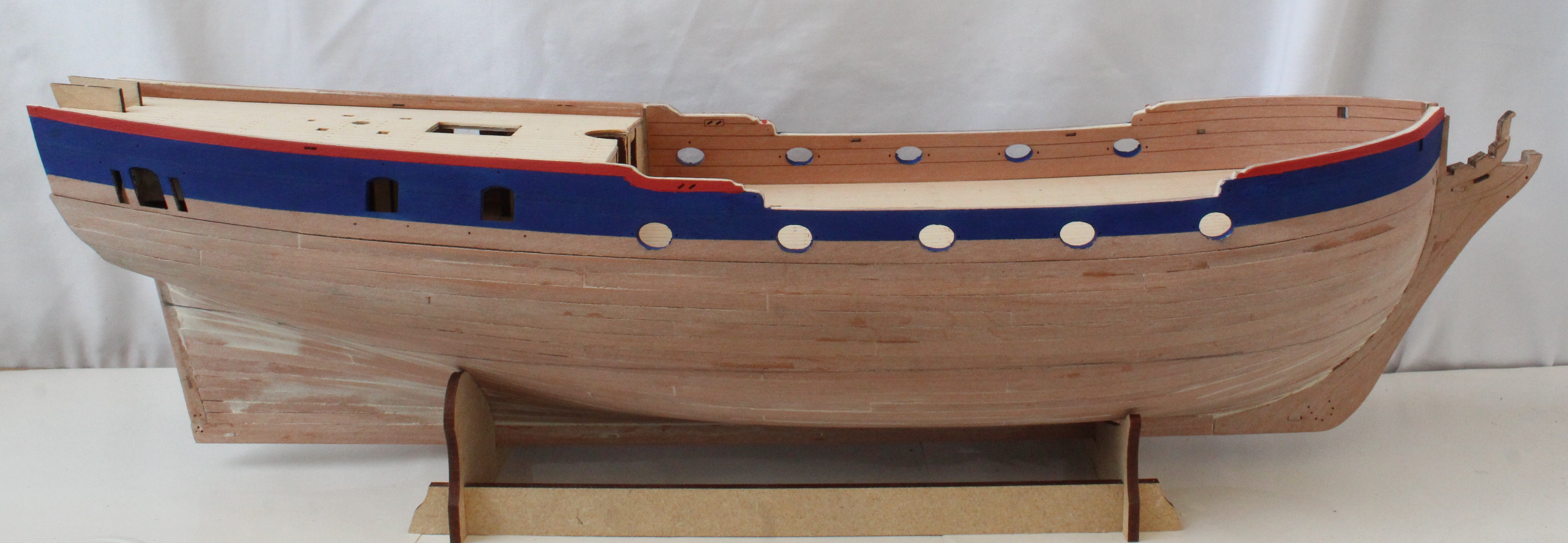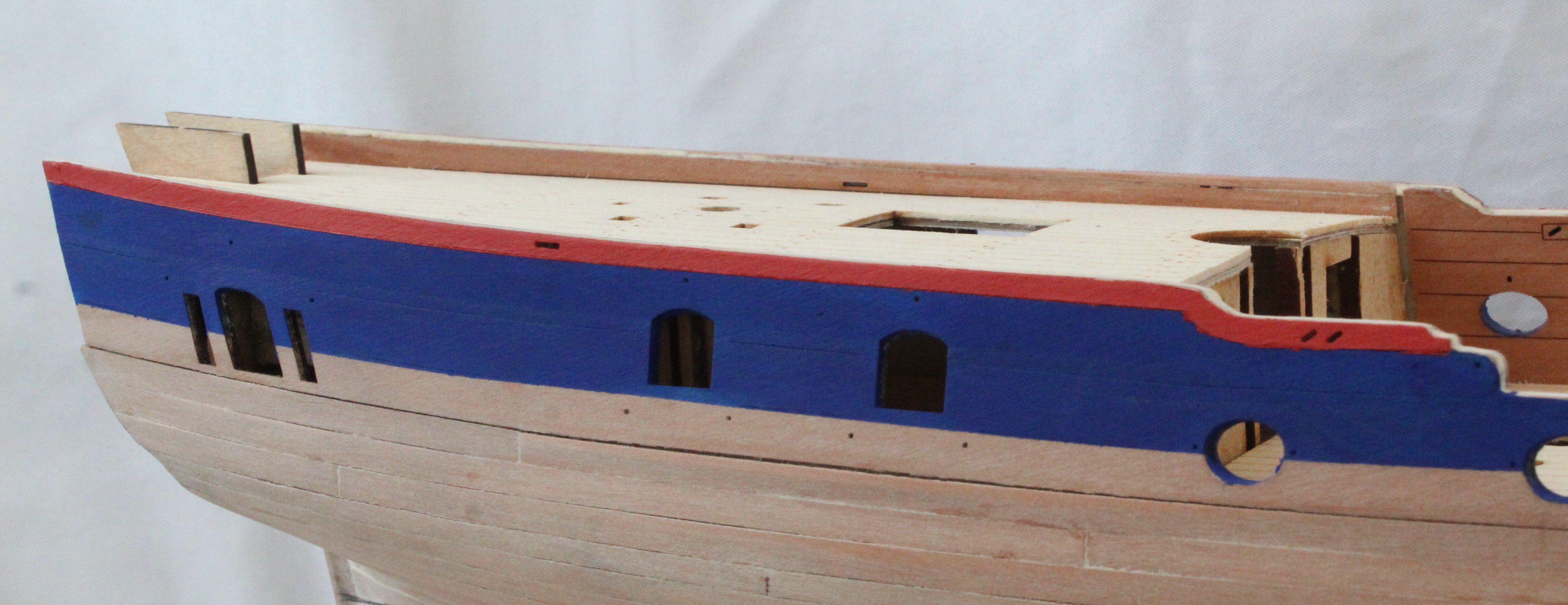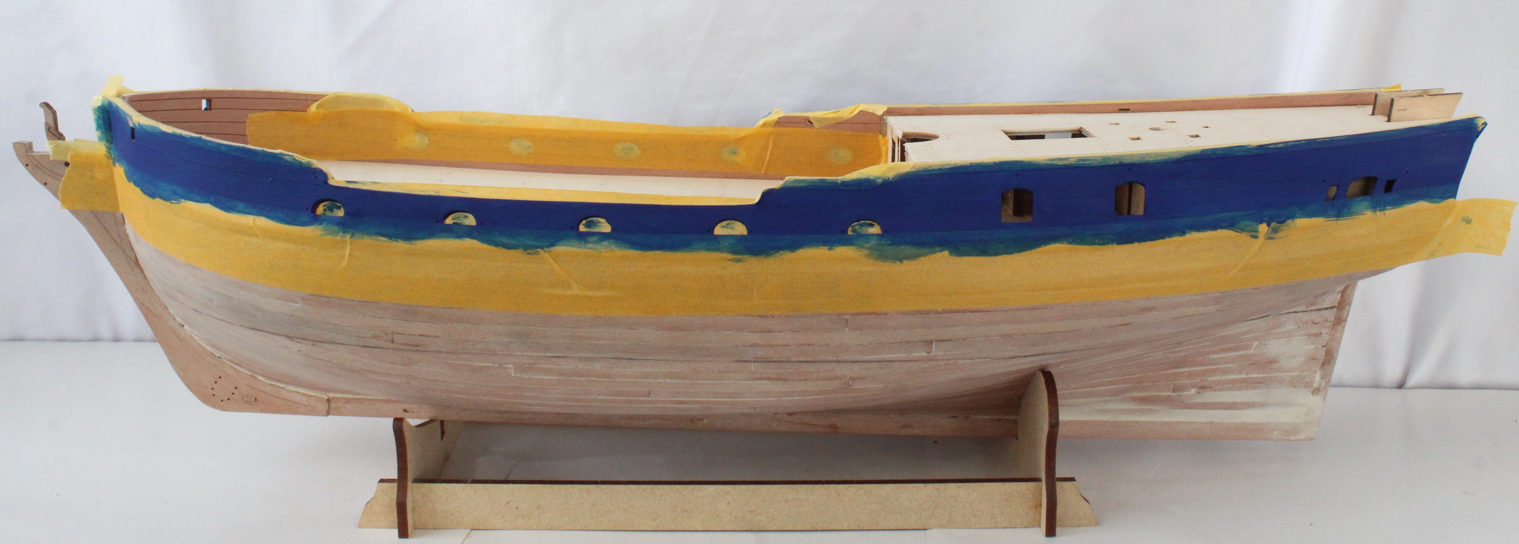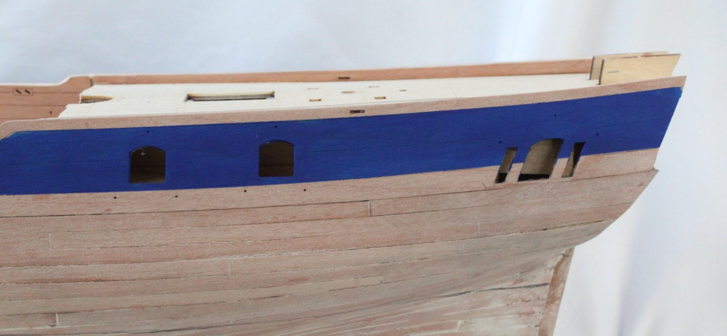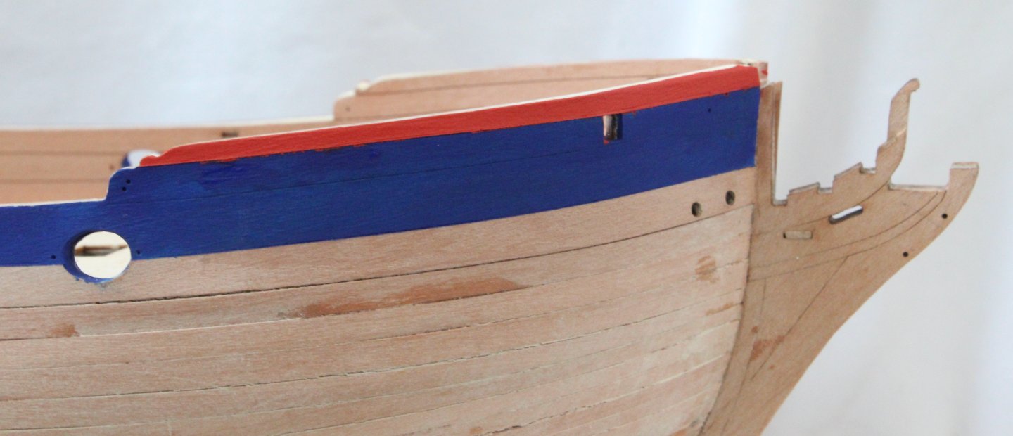 Build Log - Day 24 (5th & 6th Dec 2025) Task 44 – Painting The Hull The first task was to apply a WOP finish to the hull, inner bulwarks, stern counter and decks. I used a 50 / 50 mix of Rustins Clear Satin polyurethane and white sprit for this. Two coats were applied. Next the gunport oval openings were painted blue. Tape was attached to the inner bulwarks to prevent leakage. Next the hull was taped up so the blue band could be painted. I brushed on 4 coats of diluted blue paint. The tape was then removed and new tape added so the red paint band could be added. I brushed on 4 coats of diluted red paint. The lower stern counter was also painted blue. Photos Gun Ports Painted Hull taped and ready for the blue paint Hull after blue paint has been added Hull taped and ready for the red paint Hull after red paint has been added. Rails will be added which will hide and paint overspills between the colours. Stern counter painted. Rails will be added which will hide the paint overspills with the hull below the stern counter. Testing different wood-coloured paints which I might use on the hull. I am currently drawn toward the right hand walnut wood colour.