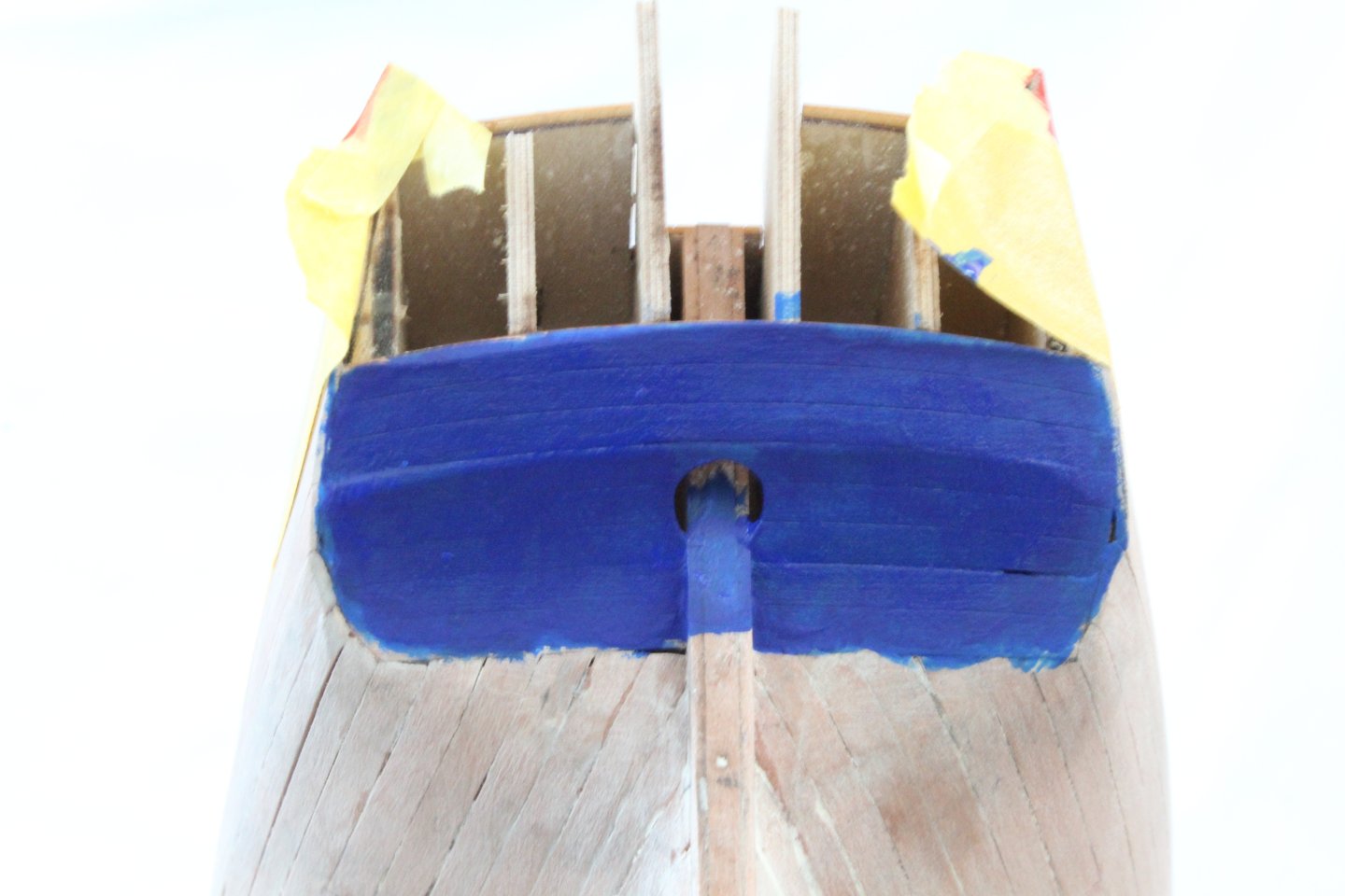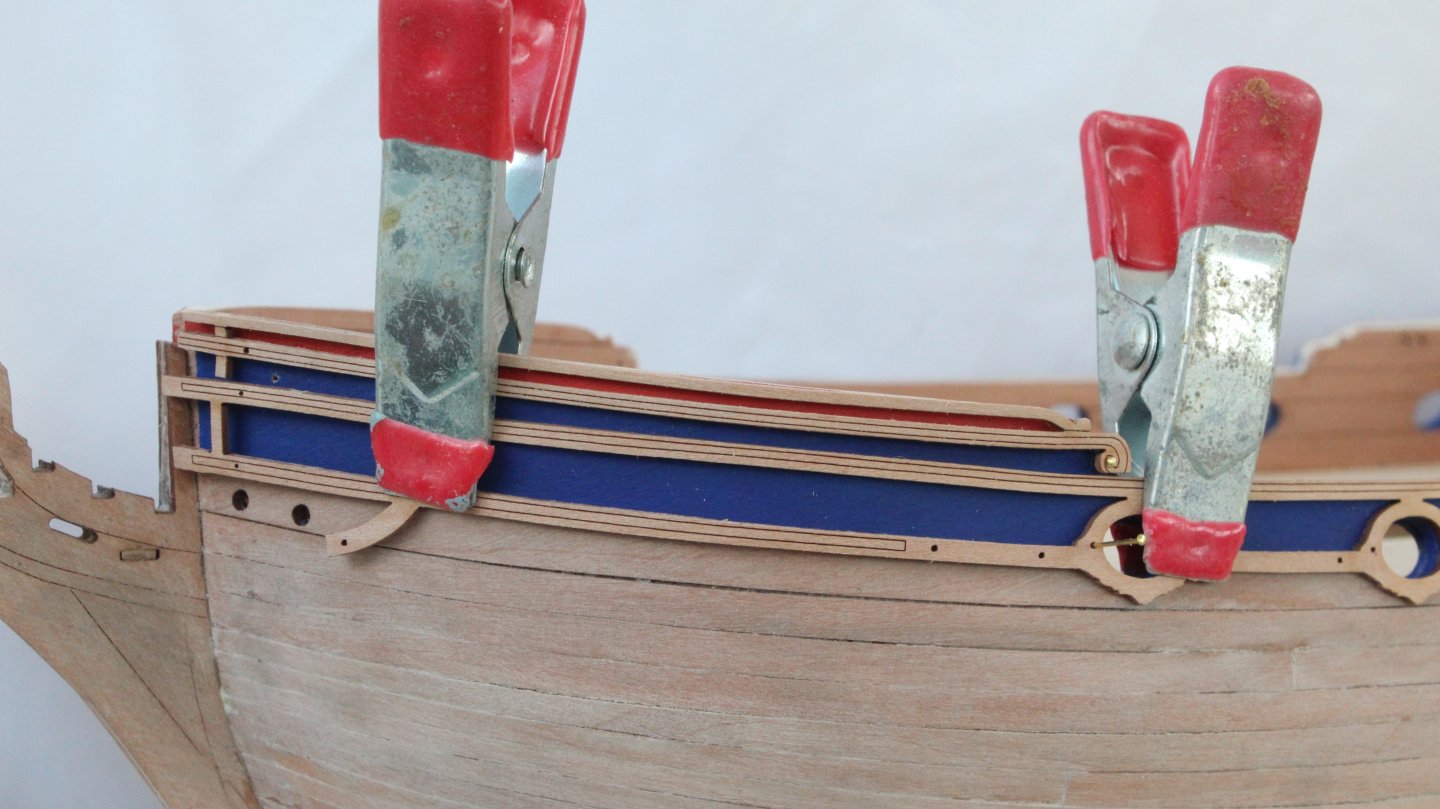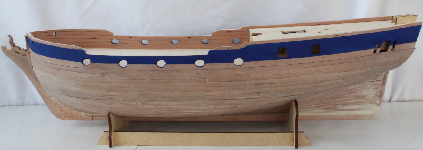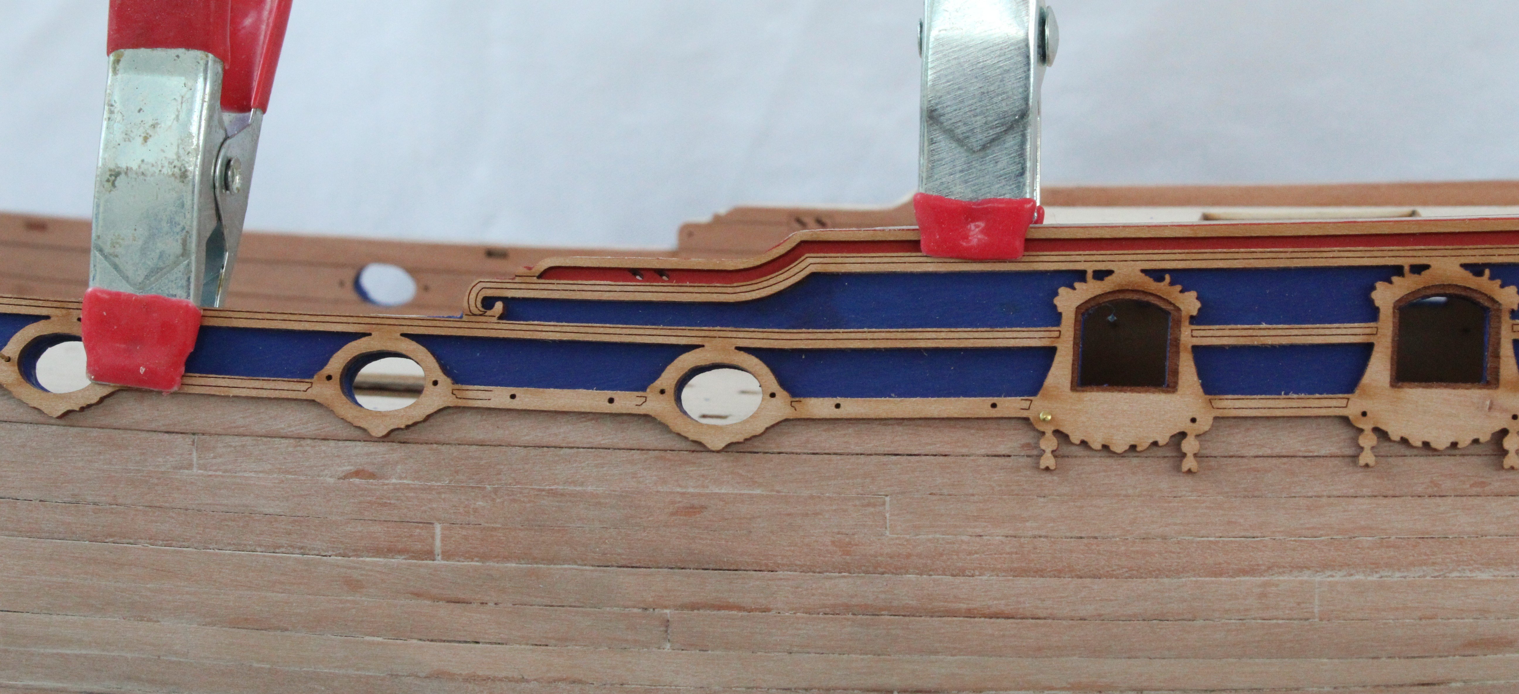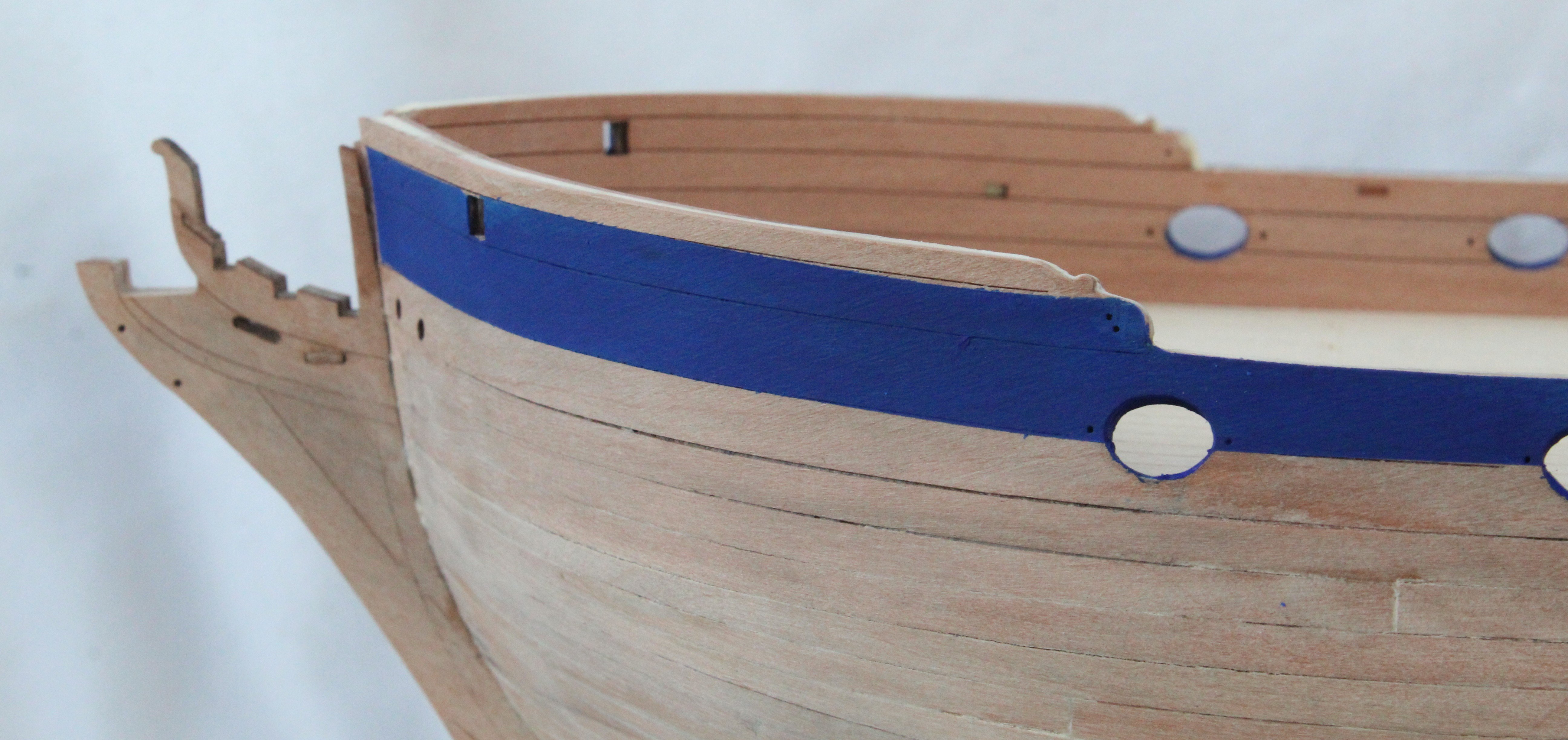 Build Log - Day 24 (5th & 6th Dec 2025) Task 44 – Painting The Hull The first task was to apply a WOP finish to the hull, inner bulwarks, stern counter and decks. I used a 50 / 50 mix of Rustins Clear Satin polyurethane and white sprit for this. Two coats were applied. Next the gunport oval openings were painted blue. Tape was attached to the inner bulwarks to prevent leakage. Next the hull was taped up so the blue band could be painted. I brushed on 4 coats of diluted blue paint. The tape was then removed and new tape added so the red paint band could be added. I brushed on 4 coats of diluted red paint. The lower stern counter was also painted blue. Photos Gun Ports Painted Hull taped and ready for the blue paint Hull after blue paint has been added Hull taped and ready for the red paint Hull after red paint has been added. Rails will be added which will hide and paint overspills between the colours. Stern counter painted. Rails will be added which will hide the paint overspills with the hull below the stern counter. Testing different wood-coloured paints which I might use on the hull. I am currently drawn toward the right hand walnut wood colour.