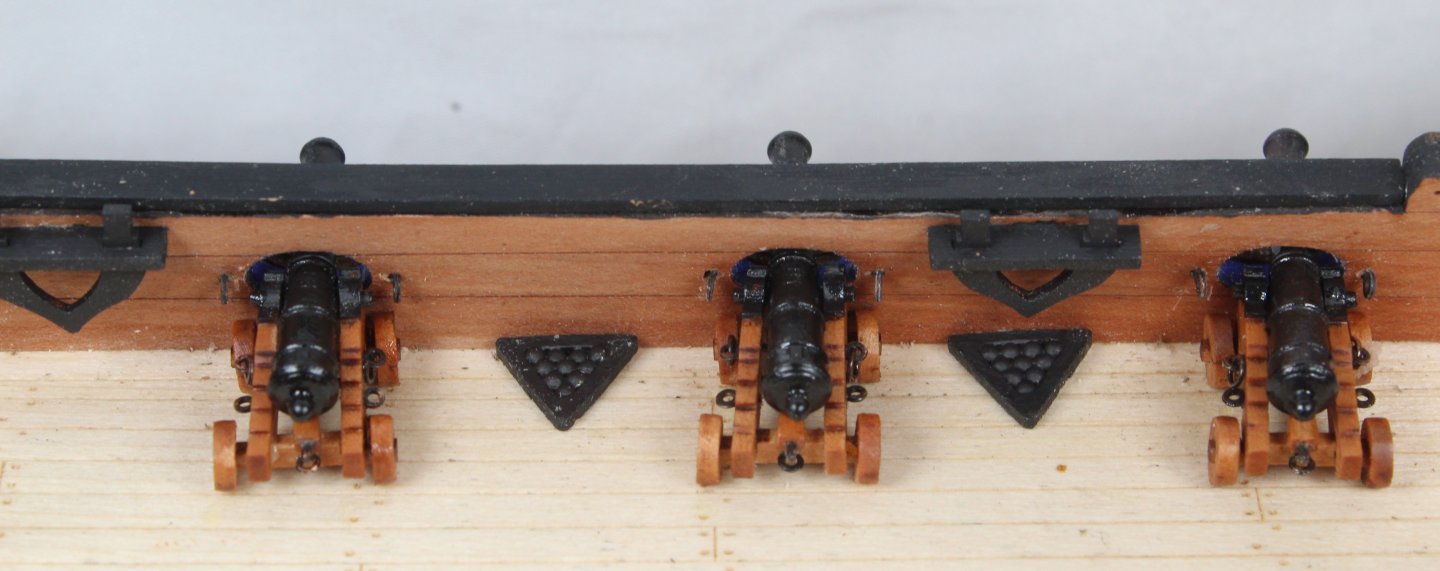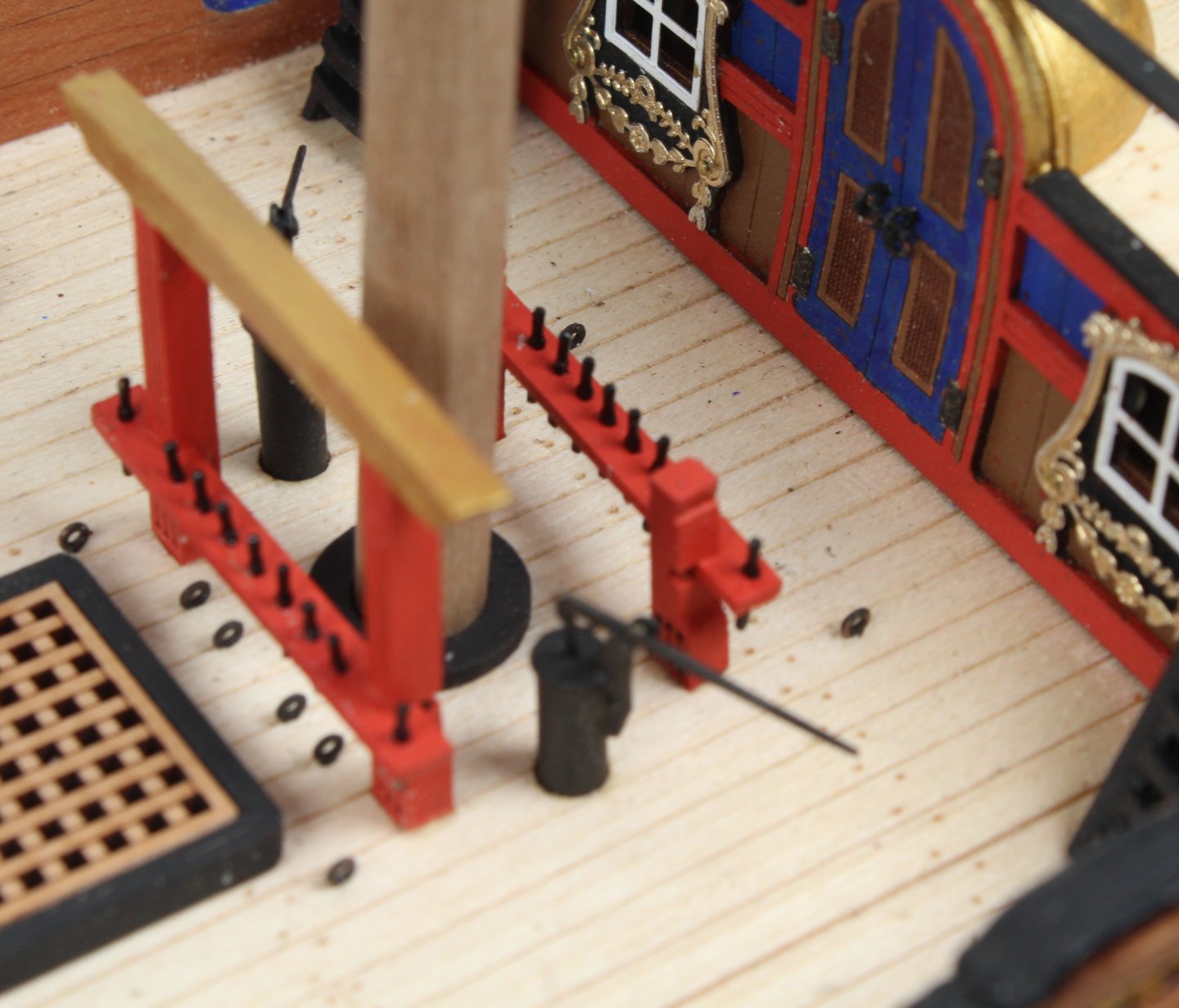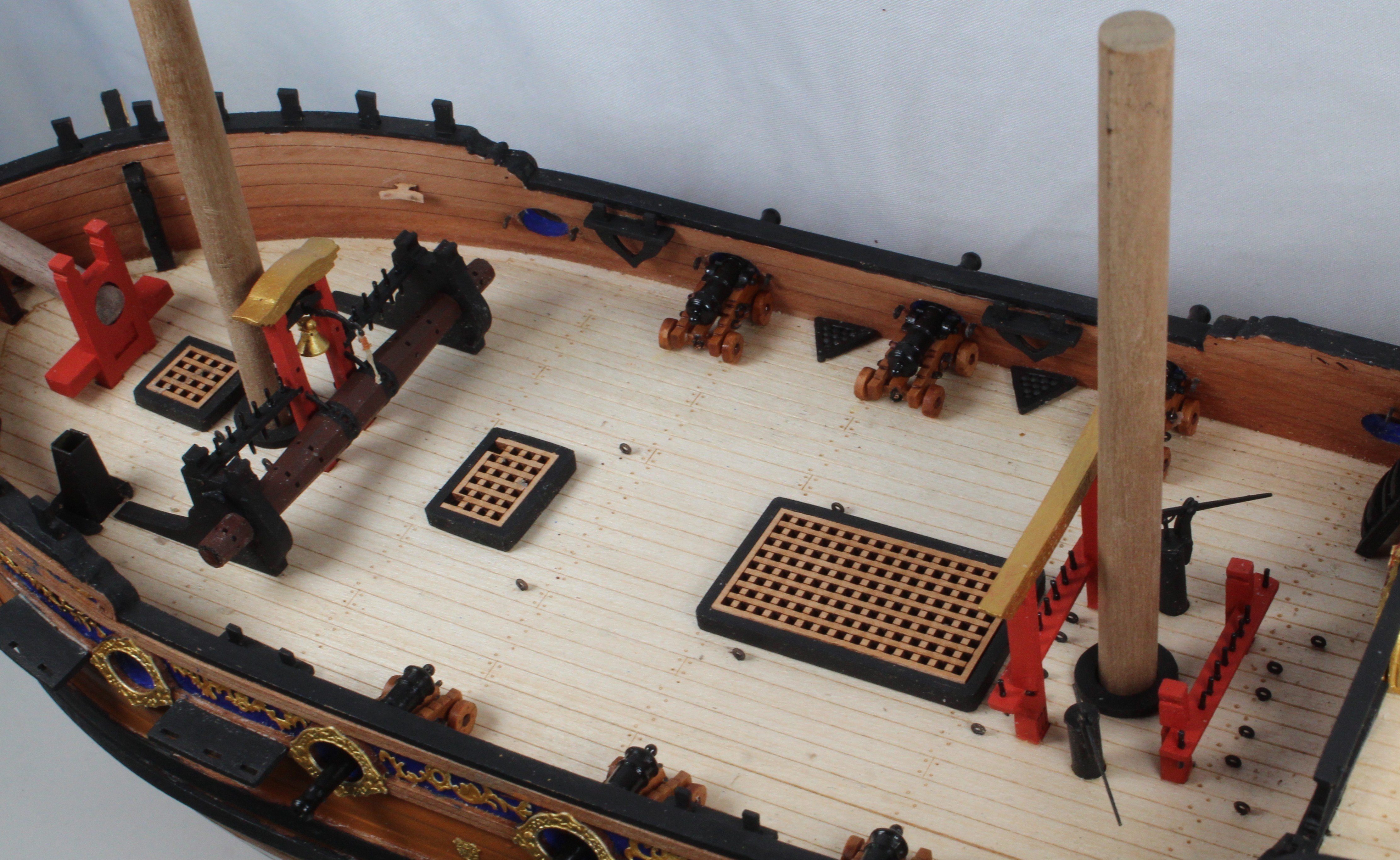Build Log – Post 39 (20/01/26) Task 63 – Completing The Deck Work All the deck items have now been installed. SInce my last post I have added the belay pins to the various rack, the cannons have been added along with the shot garlands. The windlass assembly has been secured in place. Eyebolts added to all the gun ports. I have not added the channel deadeye strops / chain links as I normally do these when adding the shrouds so they can follow the same path. I did rig one of the cannons but then decided I preferred the unrigged version. I have started work the yard production and will add a post in due course. Photos Here is a selection of photos of the current build status. Lower Deck Upper Deck Stern Bow Deck Area Cannons and shot garlands Rear section of lower deck Upper Deck Mizzen Bitts with belay pins Decorative windows