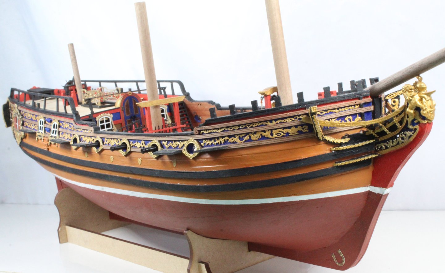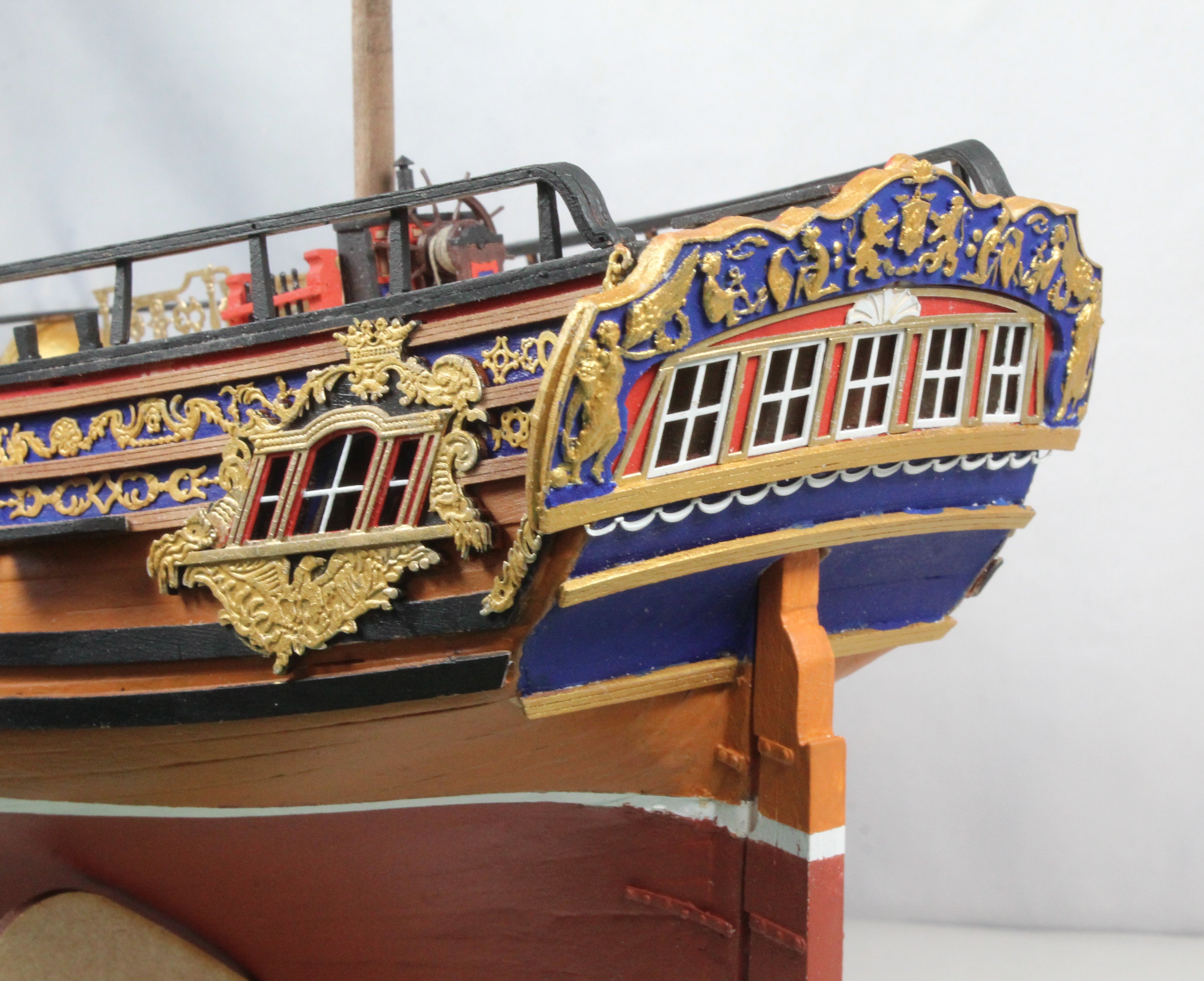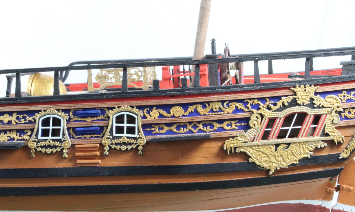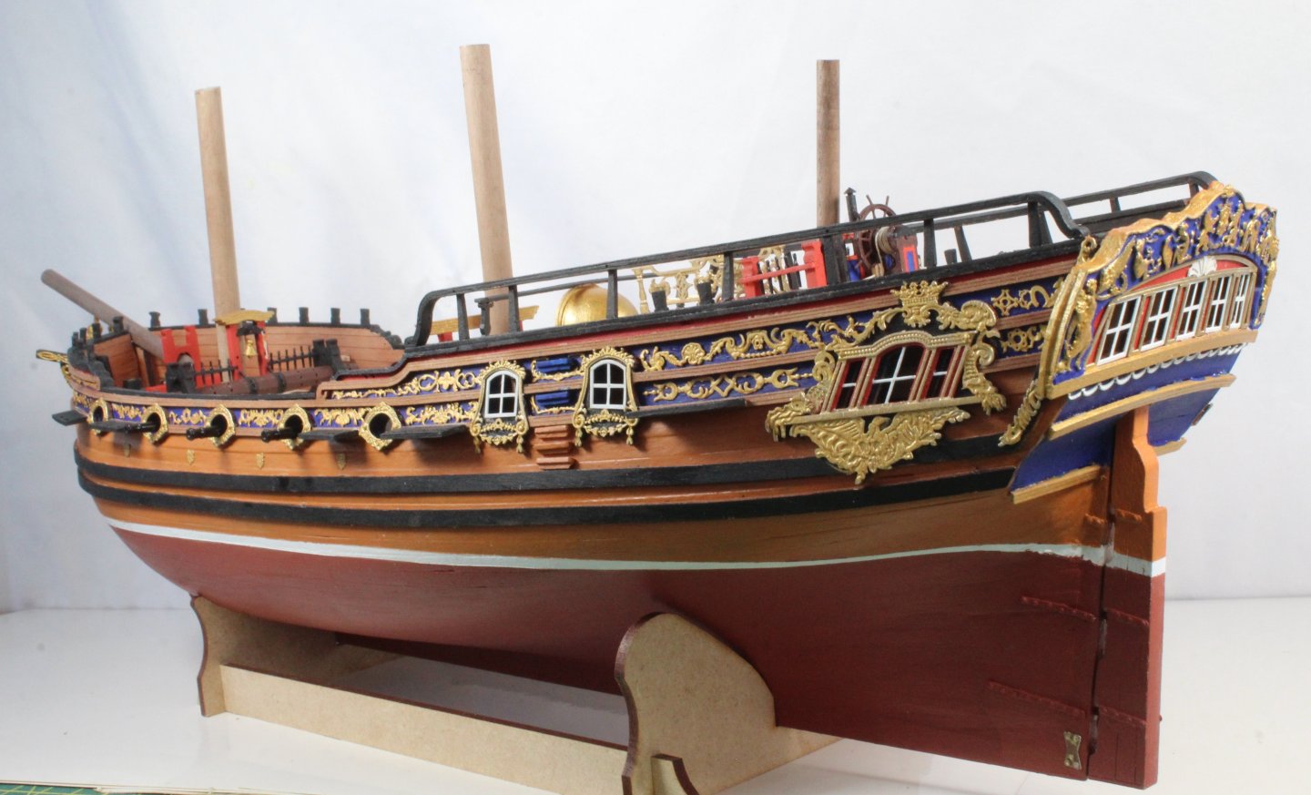 Build Log – Post 31 (24th Dec 2025) Task 51 – Upper Stern Counter Over the last few days I have been adding the various items to the upper stern counter. The first task was to add the white painted window frames. Next the window surround PE part was added. This had been painted gold with a white crest. The next item to fit was the 3D printed surround. The part was soaked in hot water for 15 seconds and then clamped to the stern counter for 1 minute so the bend could be added. The bent part was then dropped in cold water to cool off. The part was then painted imperial blue. Once the paint had dried the various raised shaped were painted gold. Once I was happy with the painted part it was added to the upper stern counter. Next I added the various rails, which had been painted gold. Finally, the final PE pattern, which had been painted white was glued beneath the upper rail. As can be seen in the photo below a little bit of paint touch up work is still required. Task 52 – Figurehead The figurehead has now been painted and test fitted.