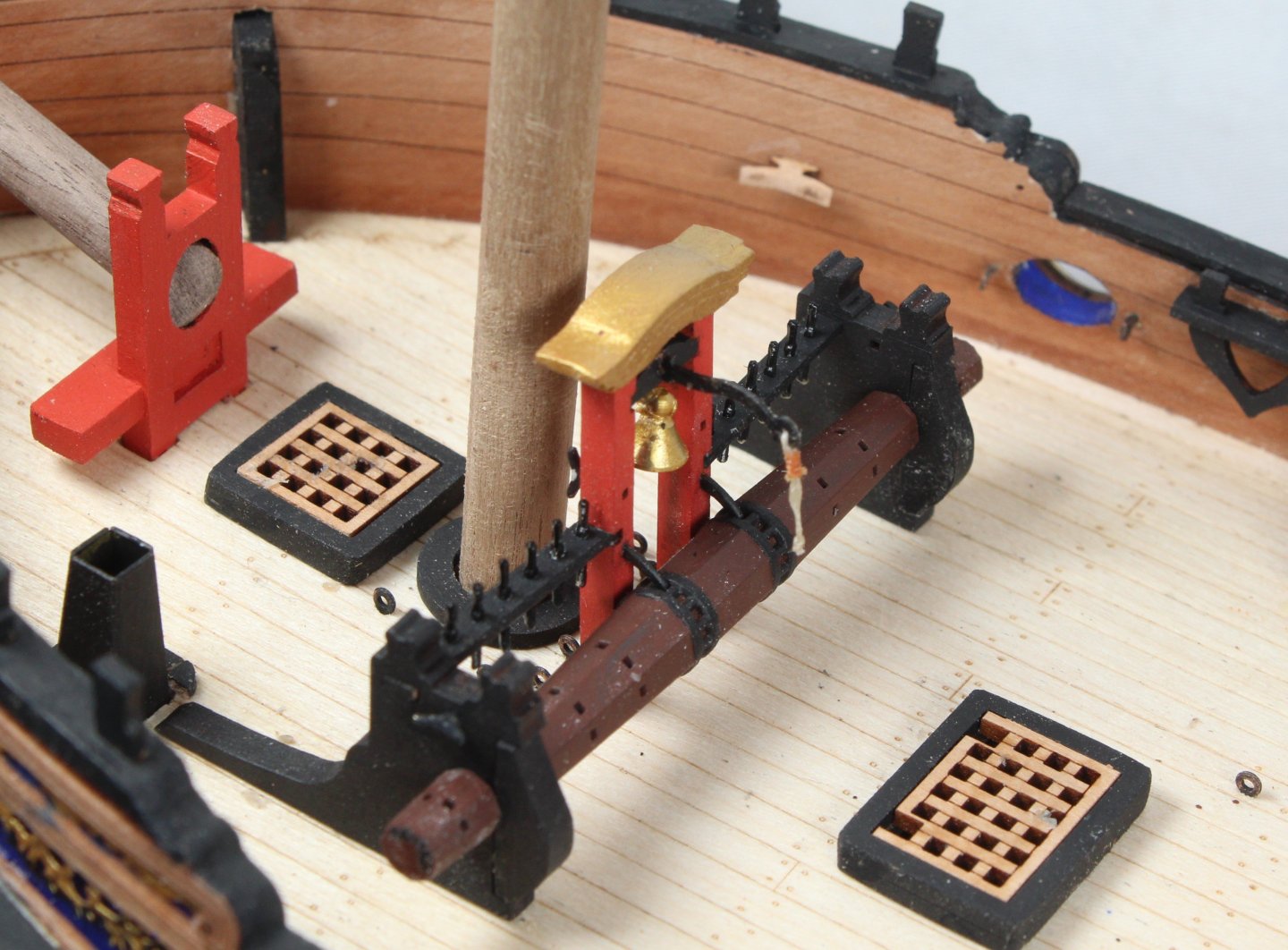 Build Log – Post 37 (14/01/26) Task 61 – Painting and Test Fitting Deck Items Starting with the upper deck items I gave some thought to the colour scheme I painted the binnacle in a similar manner to the ships wheel. The top section and side panels were painted black. The front and rear panels were painted with red bands and blue panel infills. The mizzen mast bitts were painted red. The mizzen mast base and upper deck spiral staircase coaming were painted black. The decorative PE quarterdeck companion rails were painted gold, These items were then test fitted, and I am happy with how they look. Moving on to the lower deck items I decided to paint both the gallows and main mast bitts red and then added a gold finish to the top section of the gallows bitts. The various coamings were painted black. I painted the belfry assembly red with a gold colour top section and black for the ship’s bell head stock. The bowsprit bitts were painted red. The windlass bitts were painted black along with the main and fore mast bases. I have painted the windlass a nice wooden colour, but more work is required as I need to add the black bands. I did notice that one end section of the windlass was detached when I removed the part from box. I have pinned and glued the parts together so hopefully all will be OK (right-hand end in the photo below). I also have to paint and assemble the two hand pumps. When folding the ships stove chimney the PE part sheered along the fold line. I also managed to break the chimney coaming. I have a couple of ideas to solve this problem.