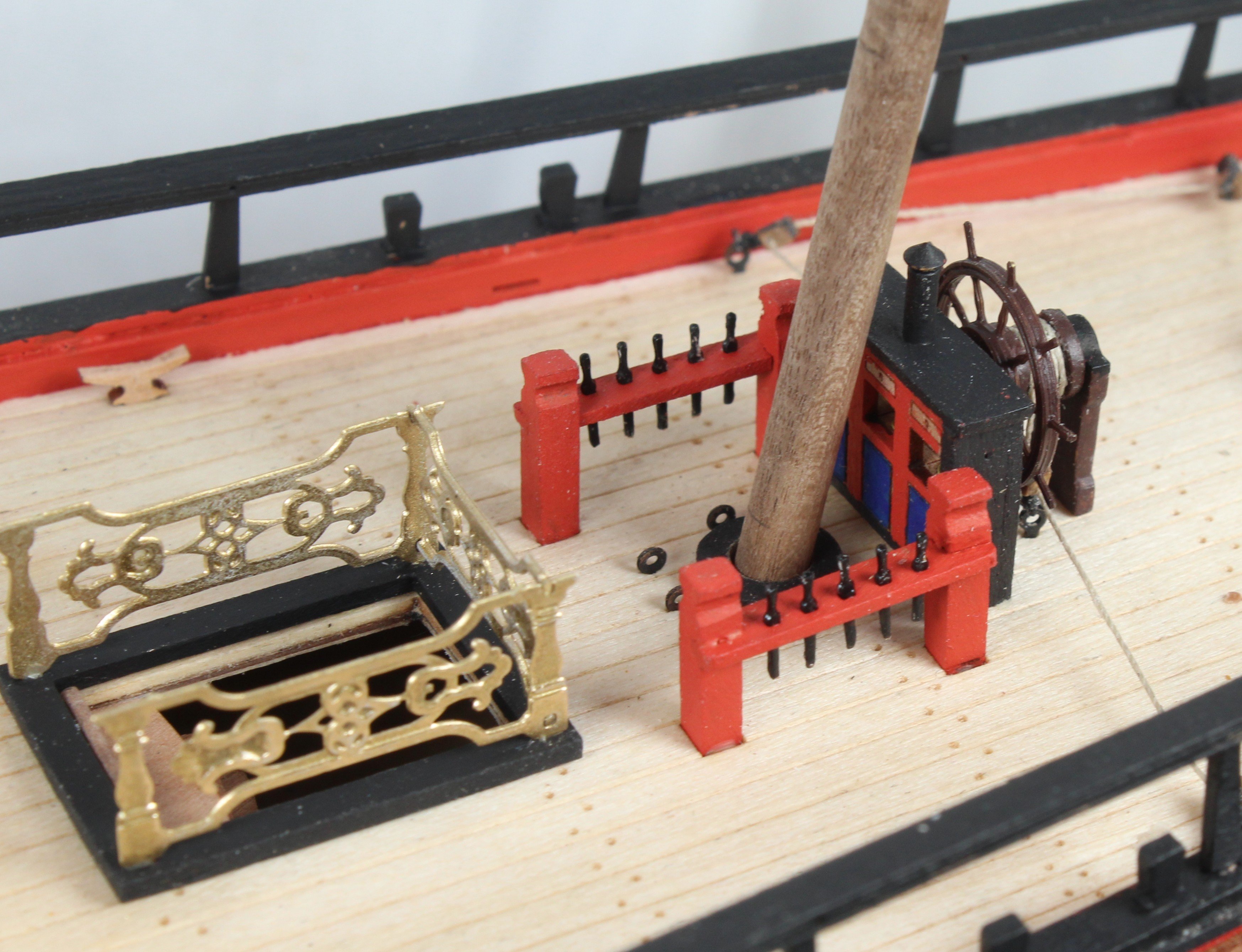 Build Log – Post 36 (13/01/26) Task 60 – Tiller Housing, Tiller and Ships Wheel The various parts of the tiller housing were painted black. The front and two side patterns were then glued in place. Next the tiller was painted black and two 2mm single blocks were added. The tiller was then glued in place. The tiller housing roof was then glued in place. A length of 0.25mm natural thread was wrapped around the ships wheel drum. Once that was done the ships wheel assembly was added to the upper deck. 6 off 2mm single blocks were then seized to eyebolts. Three blocks per side, complete with eyebolts, were then threaded to the ships wheel rigging. The eyebolts were then inserted in their respective locating holes on the upper deck, and the ships wheel thread was then tensioned. The two free ends of the ships wheel rigging still needs to be belayed to their respective eyebolts.